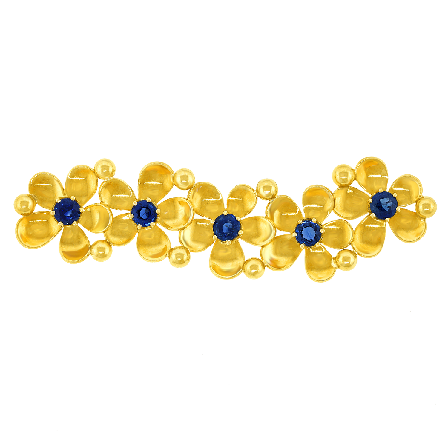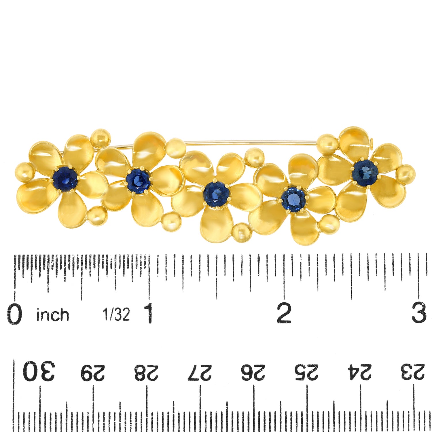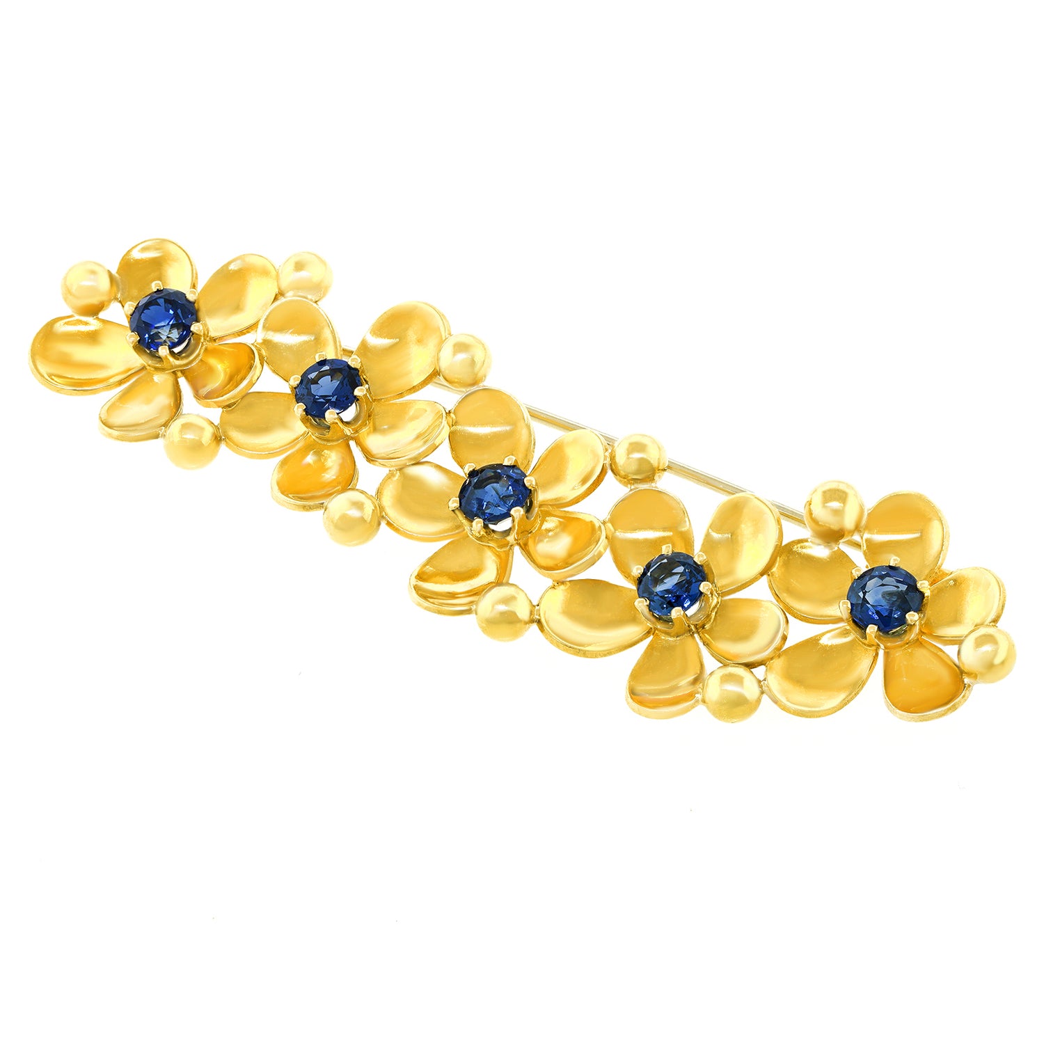 Circa 1960s, 18k, by Rud Murbach, Zurich, Switzerland. Charming, cheerful, and chic, this lovely flower brooch is a visual ray of sunshine. Each flower is set with a brilliant corn flower blue sapphire (2.0 carats total weight). The look is flower-power, pop art perfection! Finely made in eighteen-karat yellow gold in Zurich, this jewel is in excellent condition.
