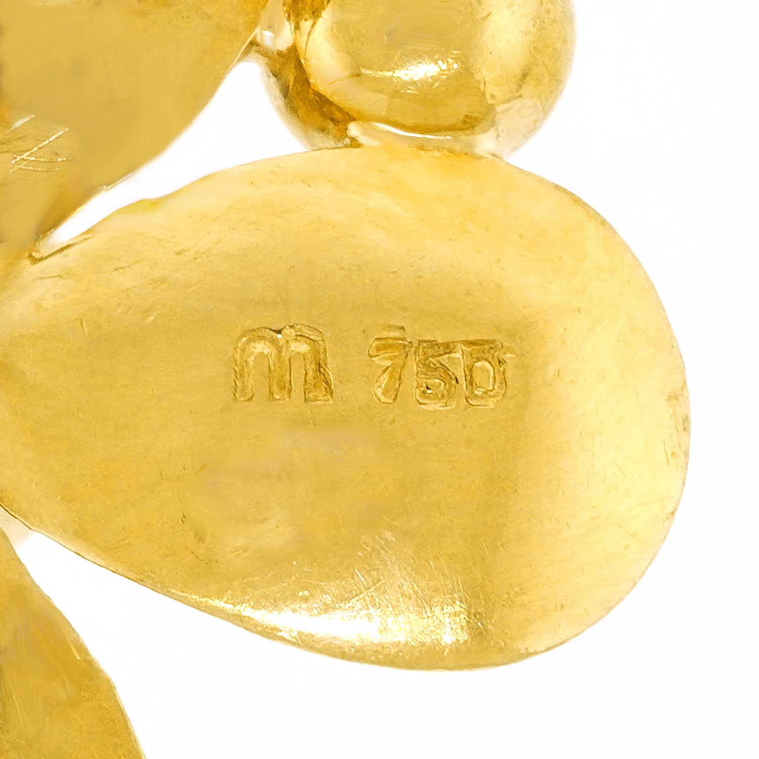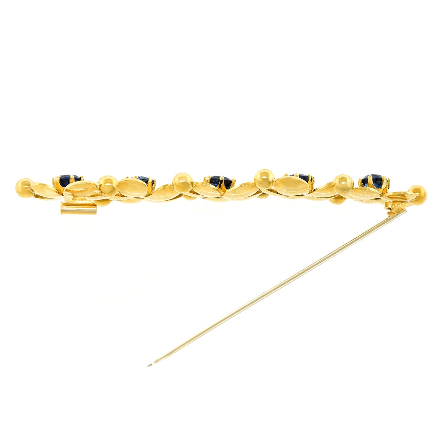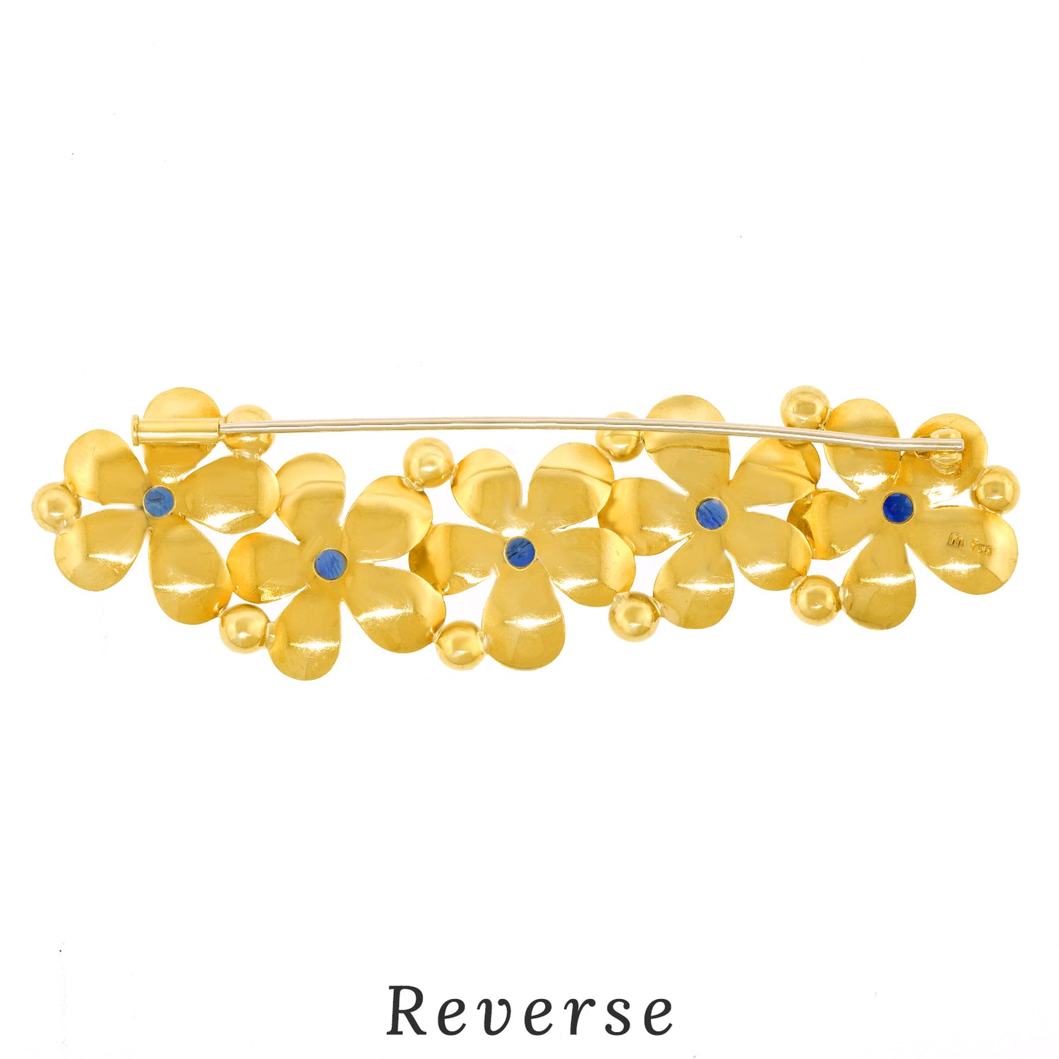 Circa 1960s, 18k, by Rud Murbach, Zurich, Switzerland. Charming, cheerful, and chic, this lovely flower brooch is a visual ray of sunshine. Each flower is set with a brilliant corn flower blue sapphire (2.0 carats total weight). The look is flower-power, pop art perfection! Finely made in eighteen-karat yellow gold in Zurich, this jewel is in excellent condition.