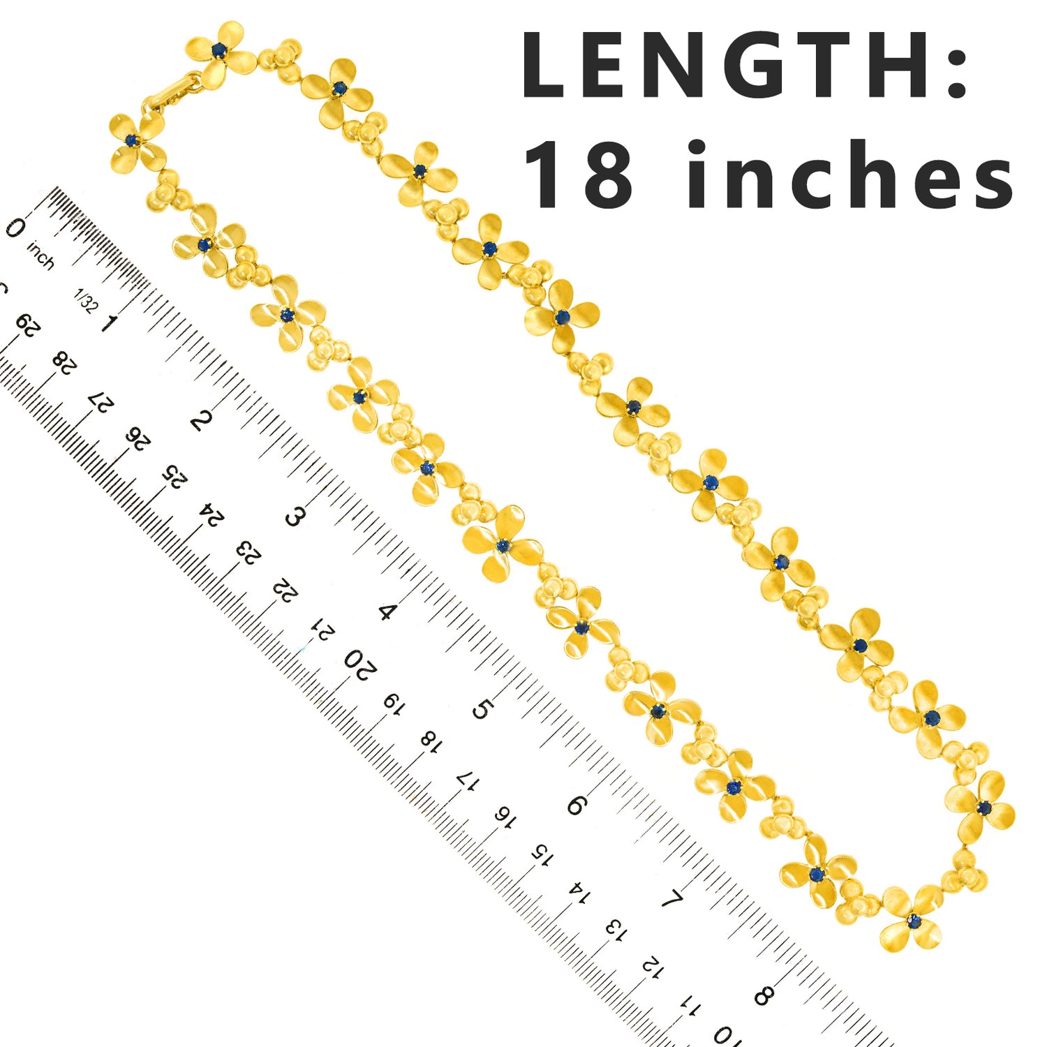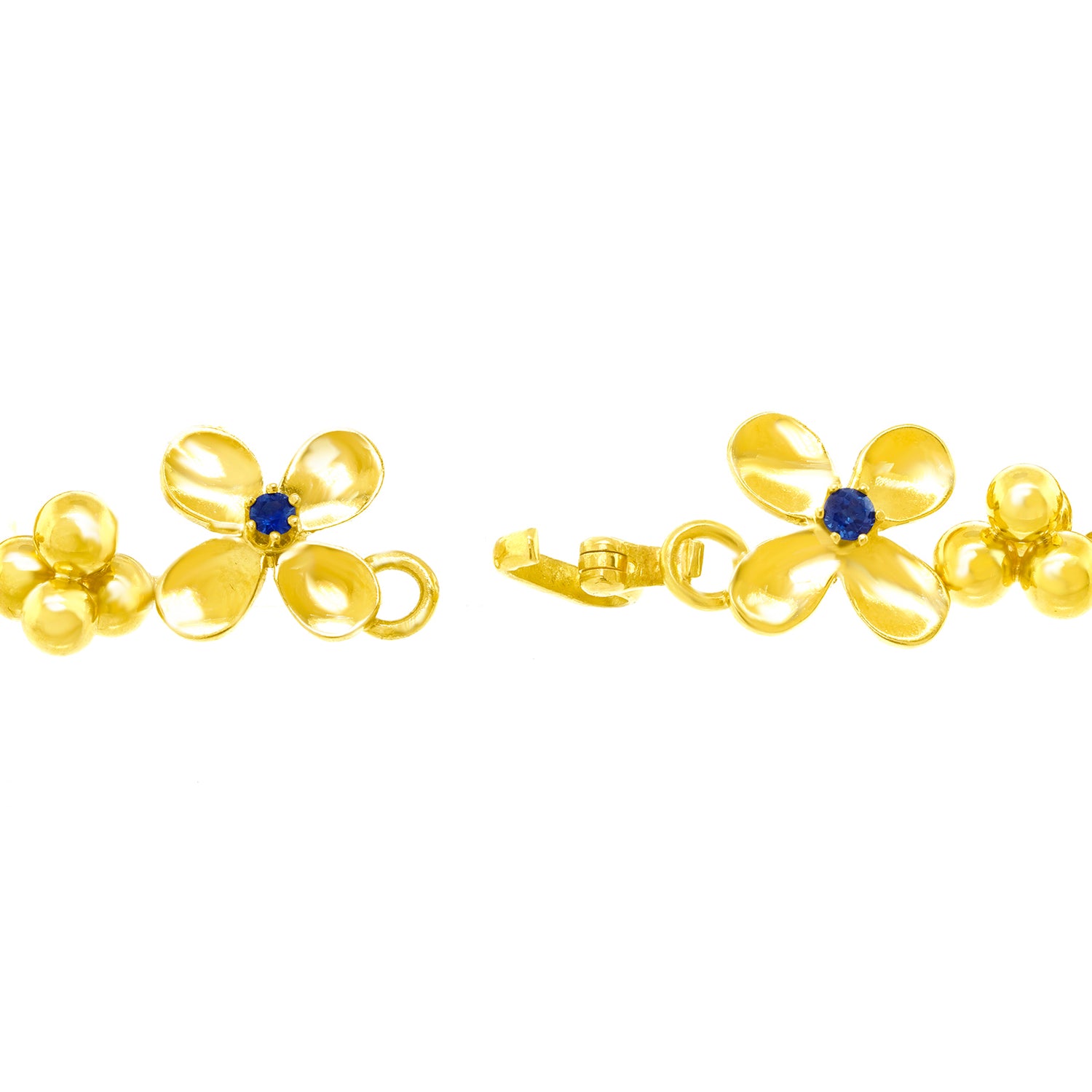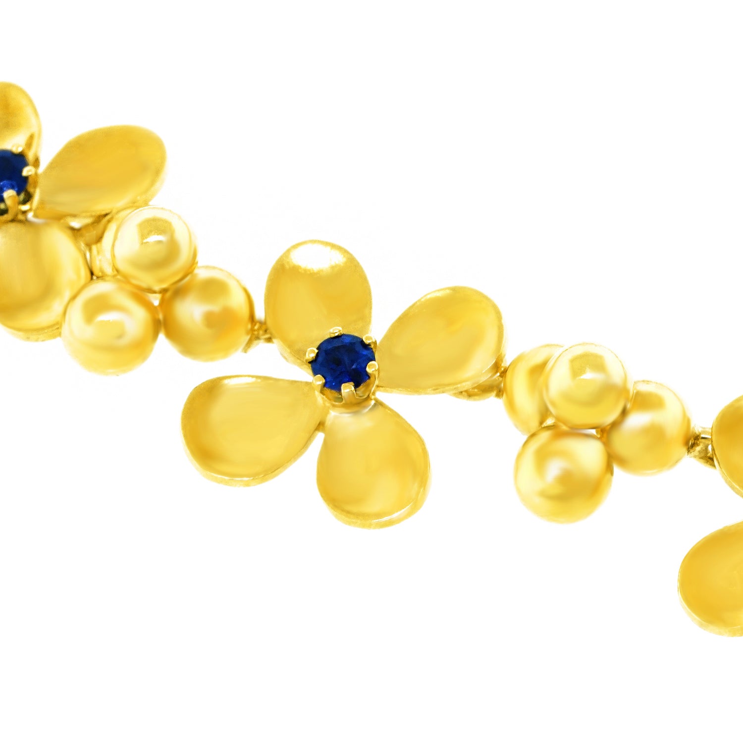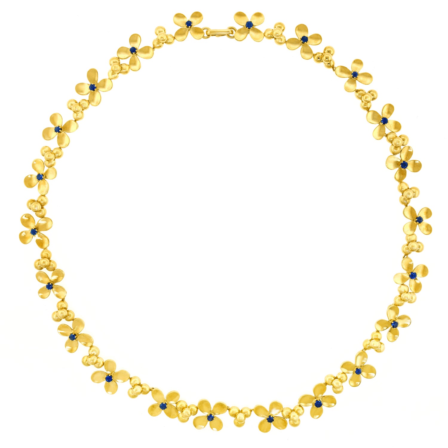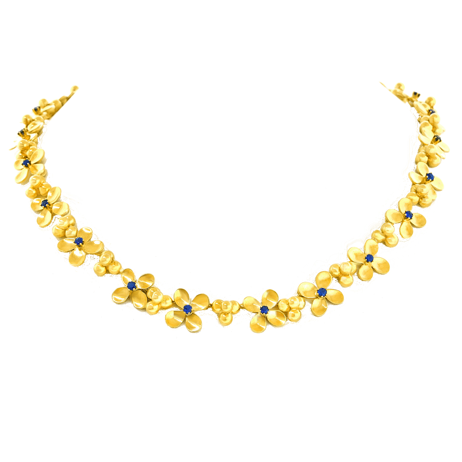 Circa 1960s, 18k, by Rud Murbach, Zurich, Switzerland. Charming, cheerful, and chic, this lovely flower necklace is a visual ray of sunshine. Each flower is set with a brilliant corn flower blue sapphire (1.20 carats total weight). The look is flower-power, pop art perfection! Finely made in eighteen-karat yellow gold in Zurich, this jewel is in excellent condition.