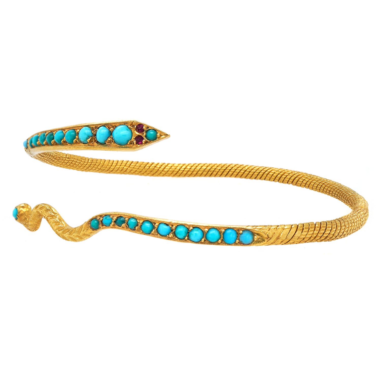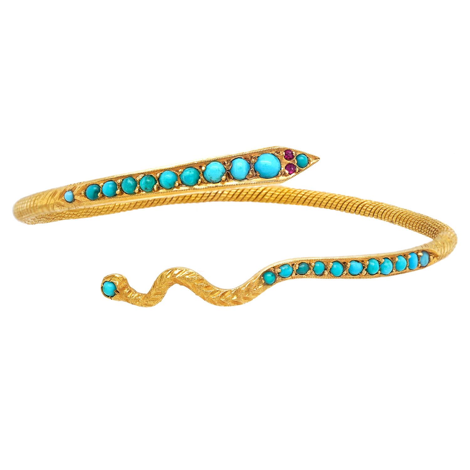 Circa 1960s, 21k, Egyptian.  One of mankind's earliest jewelry subjects, snake motifs are timelessly stylish. This snake bracelet is finely handmade in 21-karat gold and set with turquoise. It is effortlessly chic, brilliant dressed up or down, and perfect in any moment of fashion. Excellent condition.