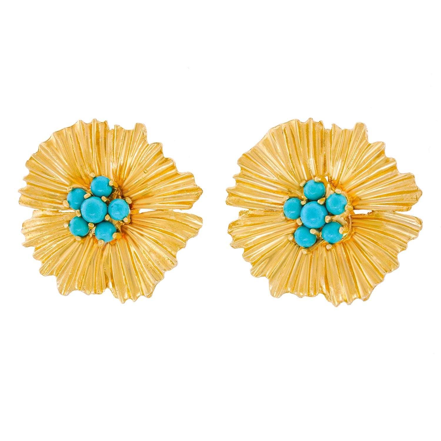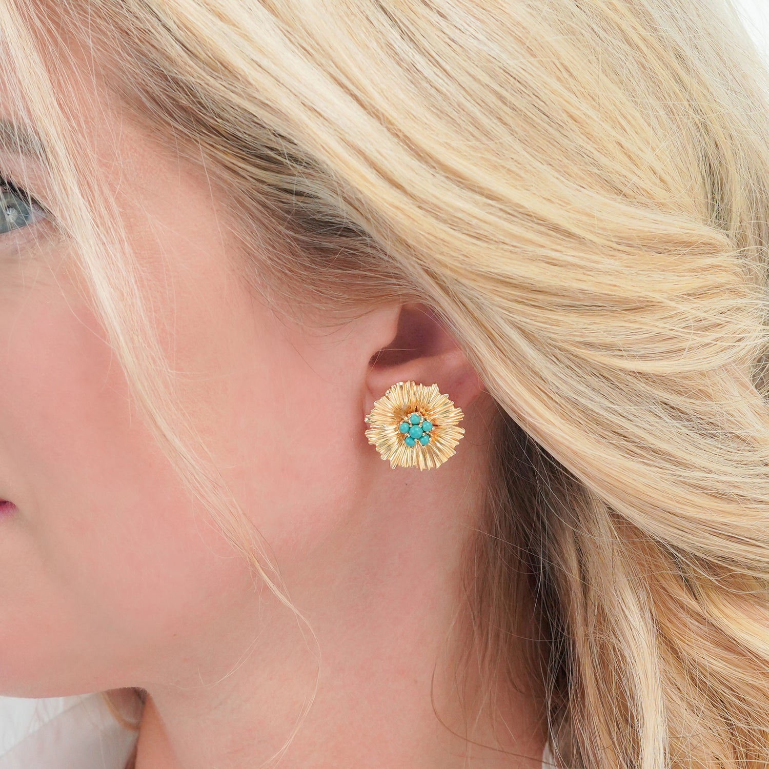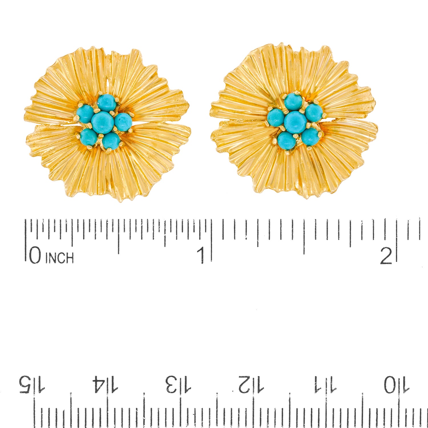 Circa 1960s, 14k, American.  Charming, cheerful, and chic, these lovely flower earrings have a fashionable modernist look. The polished petals are accented by bright turquoise, the look is vintage sixties chic. Well-made in 14k, they are in excellent condition.