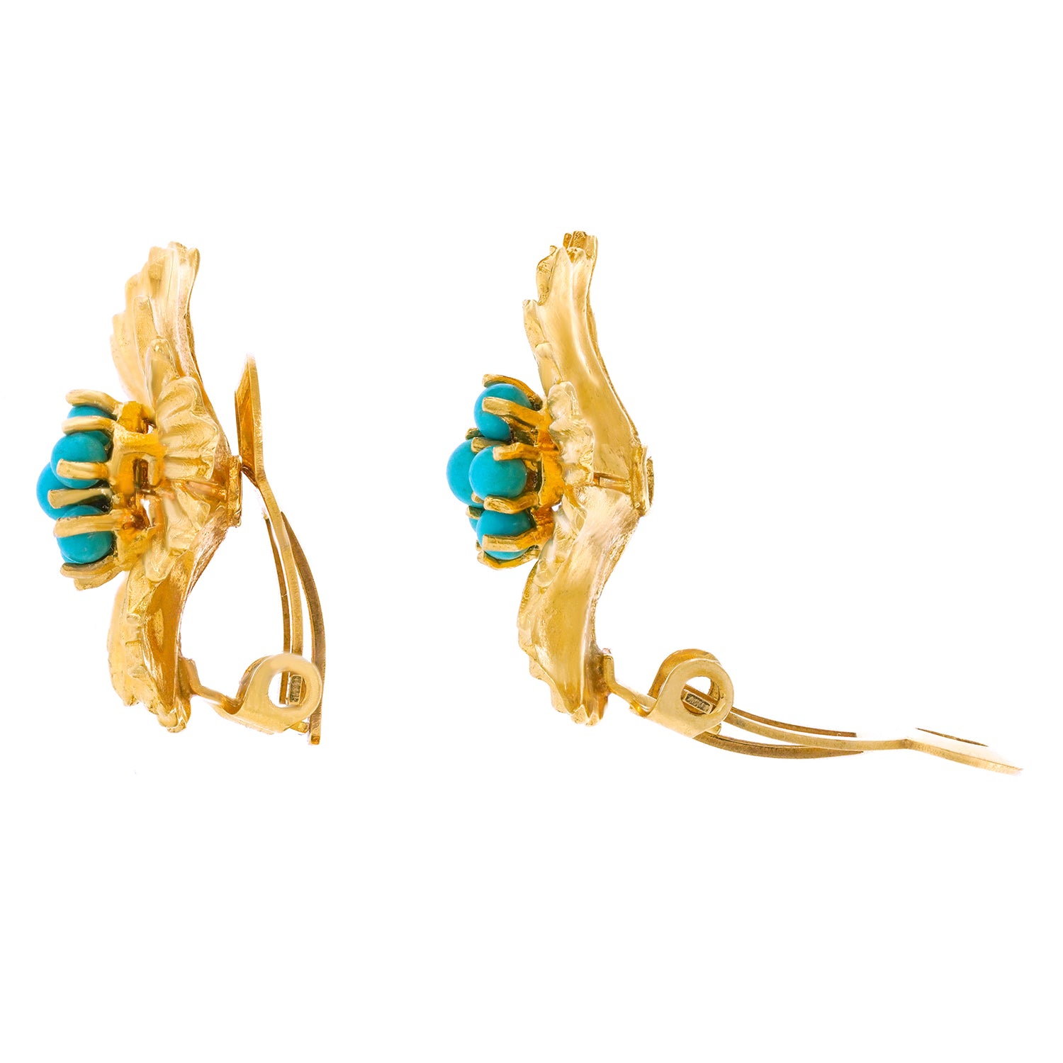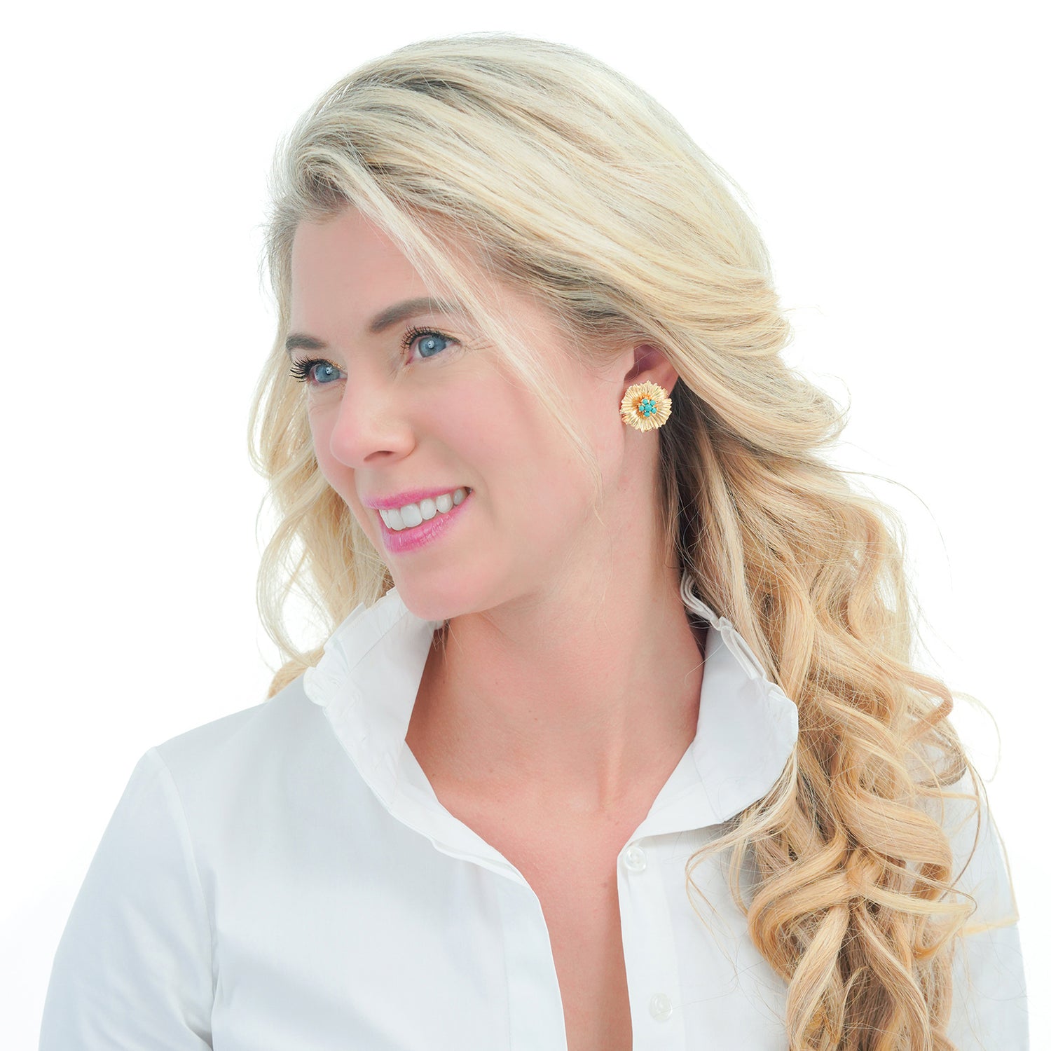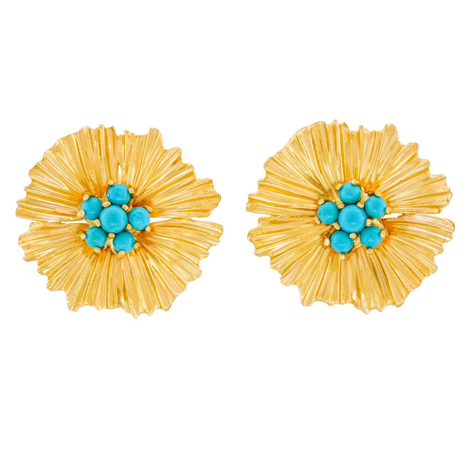 Circa 1960s, 14k, American.  Charming, cheerful, and chic, these lovely flower earrings have a fashionable modernist look. The polished petals are accented by bright turquoise, the look is vintage sixties chic. Well-made in 14k, they are in excellent condition.
