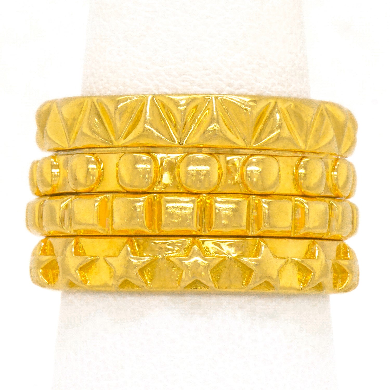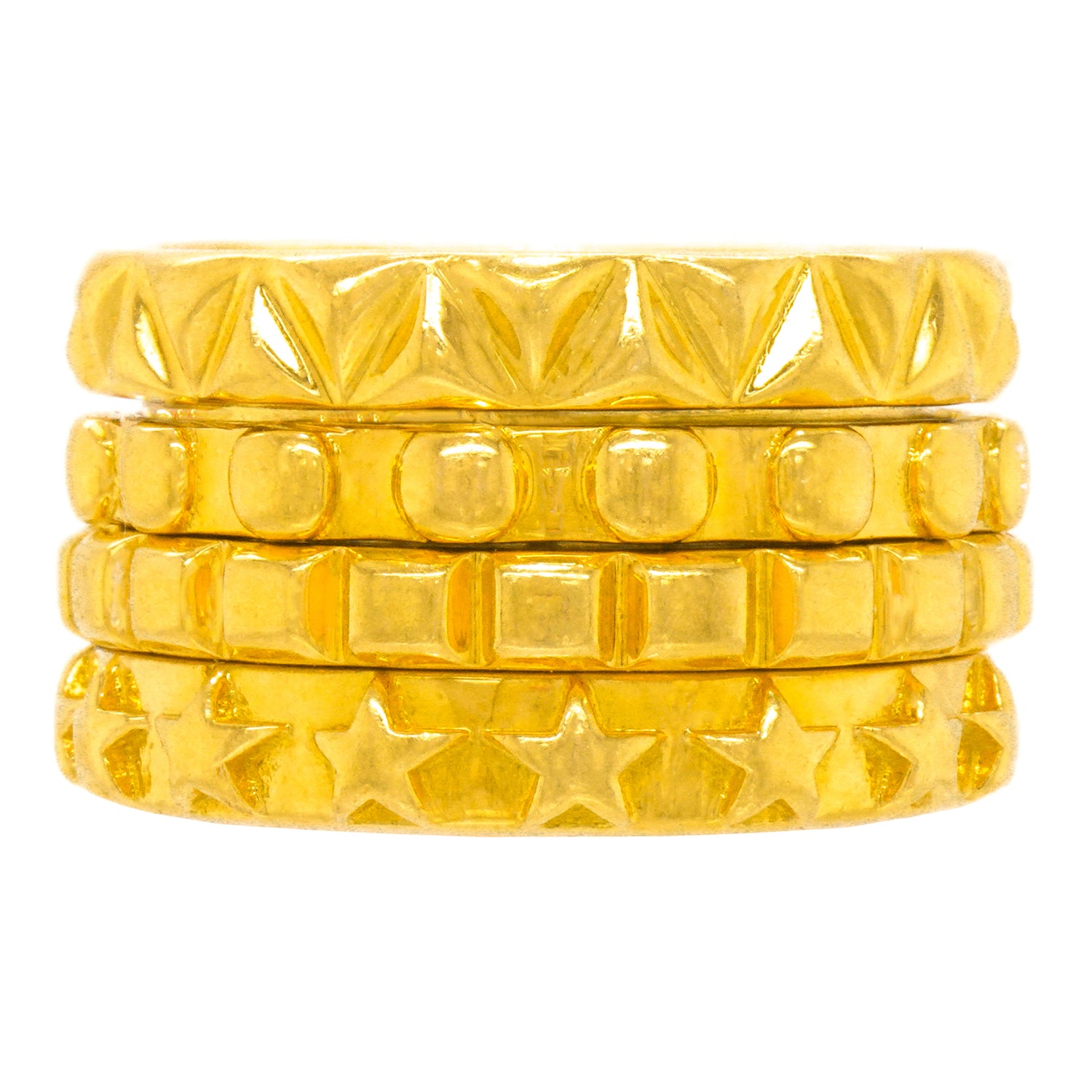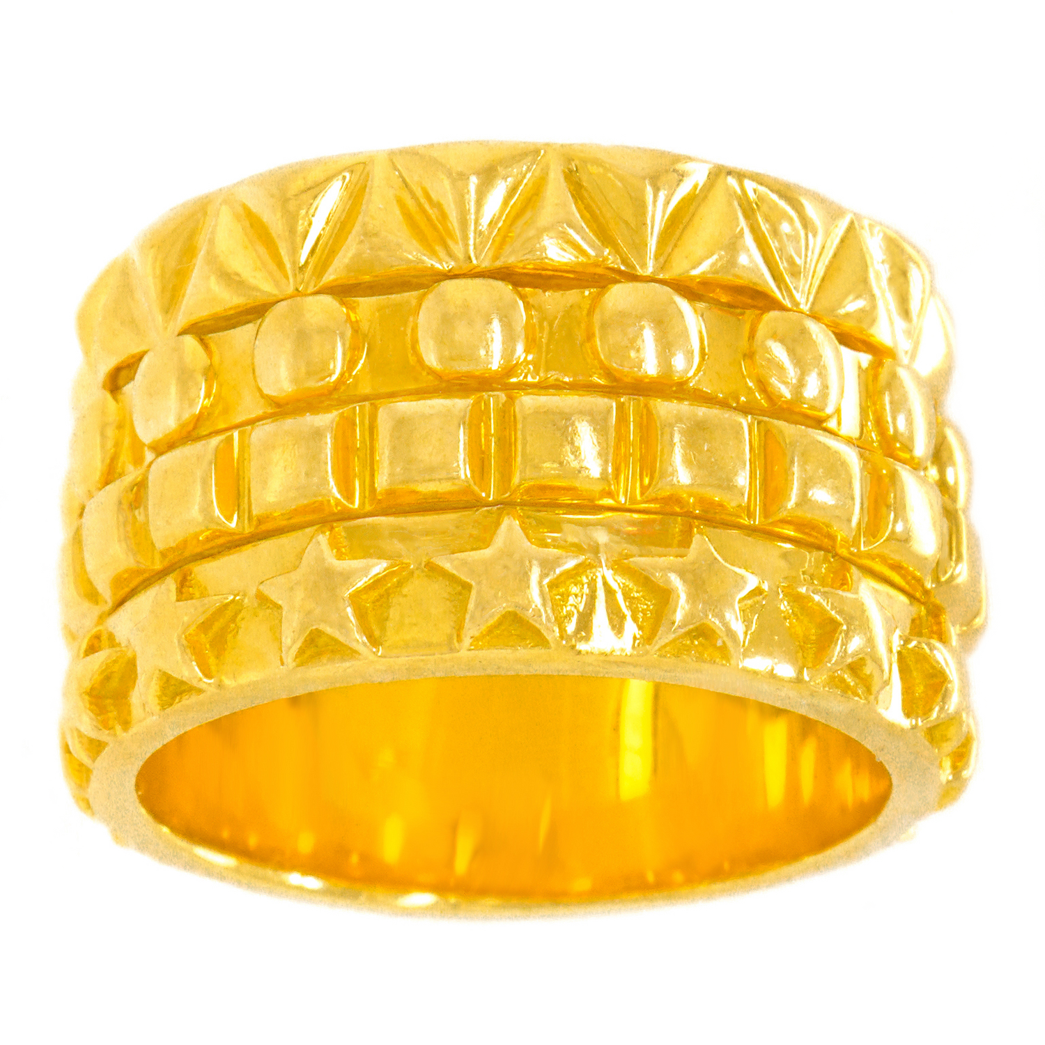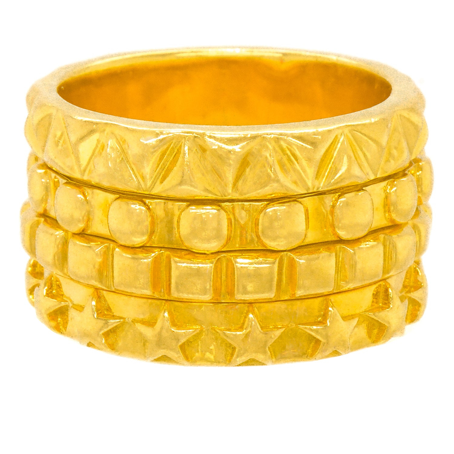 Circa 2011, 18k, by Solange Azagury Partridge, England. This fabulous yellow gold "Mish Mash Ring" by Solange Azagury Partridge features four of the designer's favorite shapes on bands, stacked as one fabulous kinetic ring! The two center bands spin! Heavy, and well-made, it is in excellent condition.