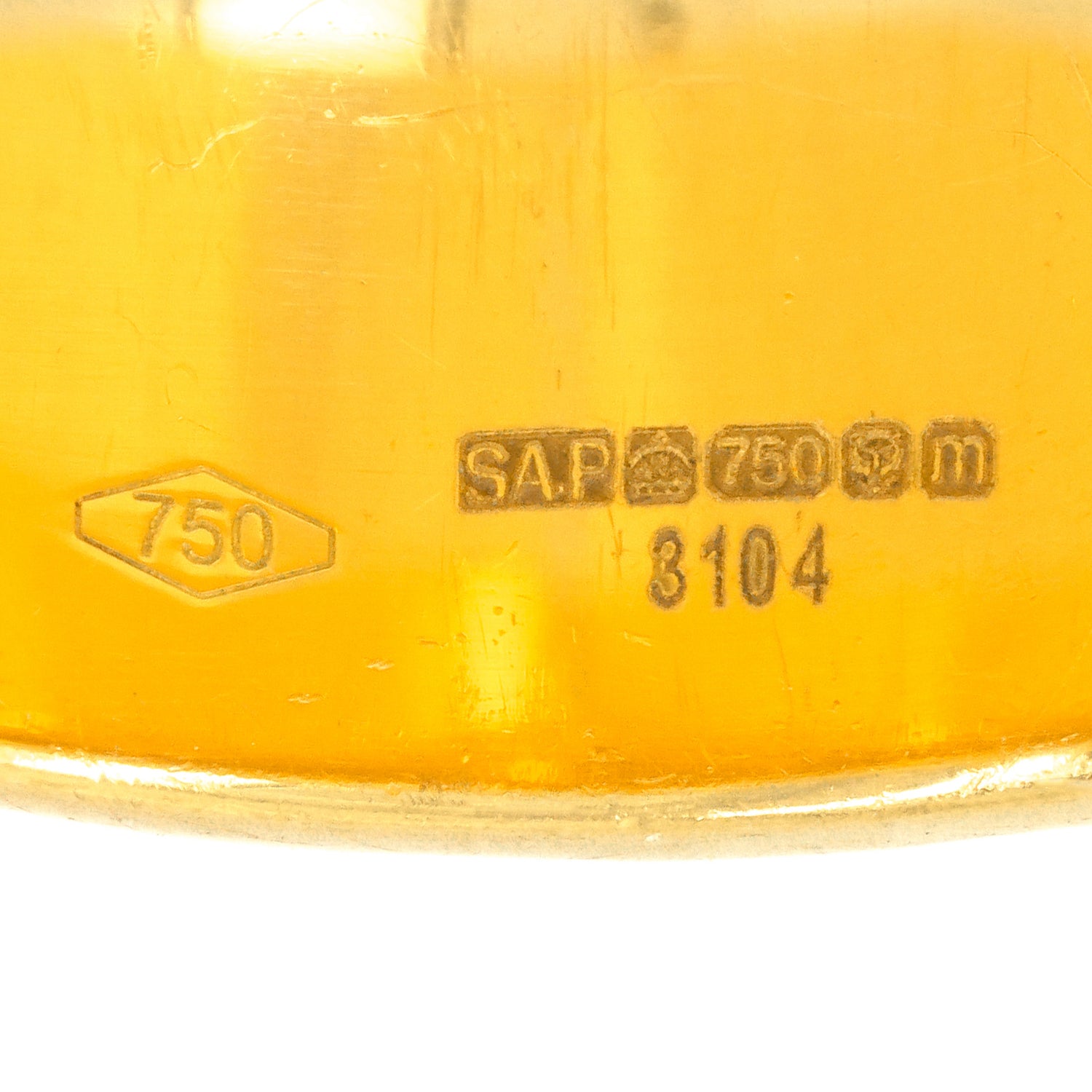 Hallmarks: 750 for 18k, SAP goldsmith's mark, Crown mark for gold , 750, Leopard's head for London, M for 2011, and registration number 3104