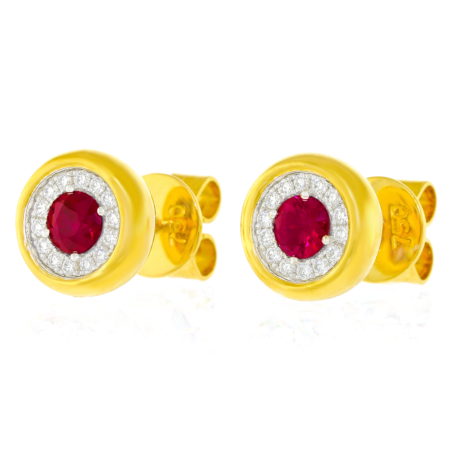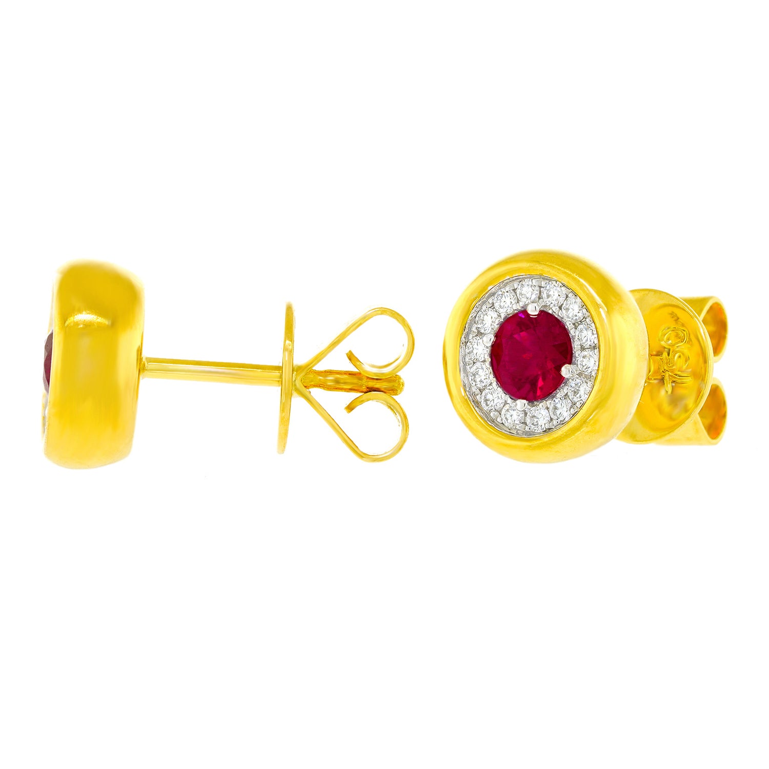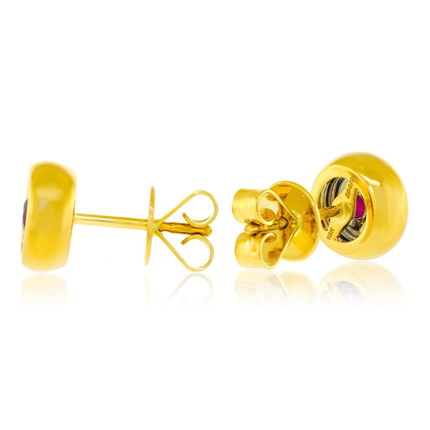 Circa 2000s, 18k, by Spark Creations, New York.  These sleek contemporary studs are set with .50 carats of vivid red ruby surrounded by .20 carats of sparkling white diamonds (G color and VS clarity). Dimensional and luminous, the look is all color and dazzle. Well-made in eighteen-karat yellow gold, they sit comfortably on the ear. Spark Creations is renowned for superior fabrication and their use of only the best stones. Excellent condition.