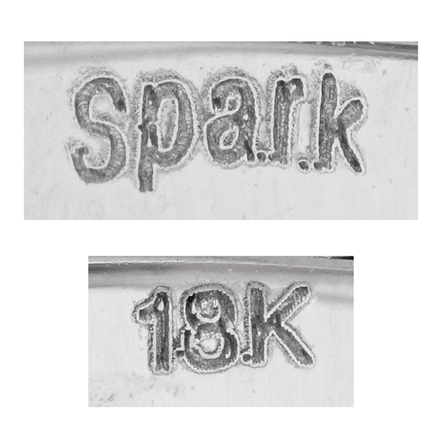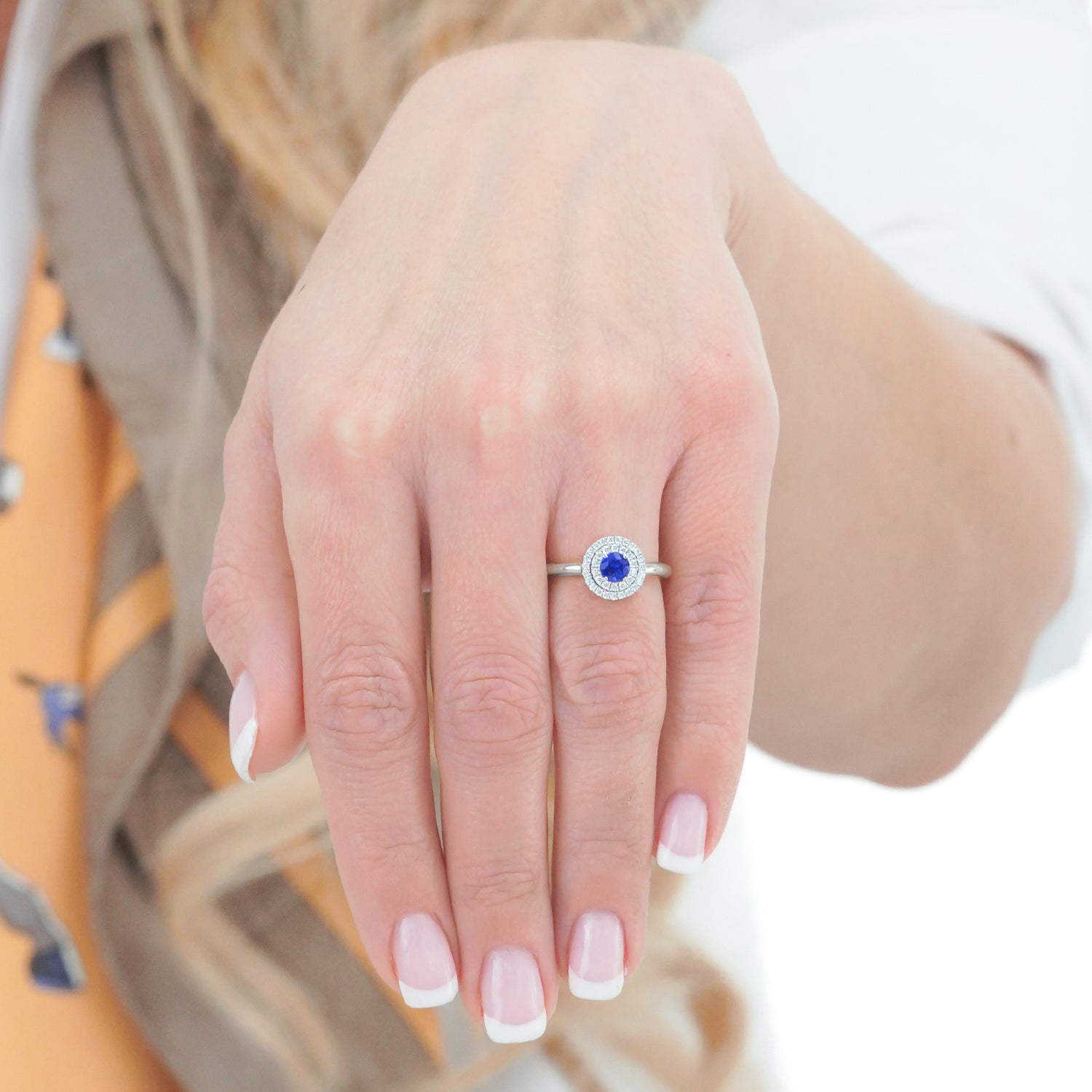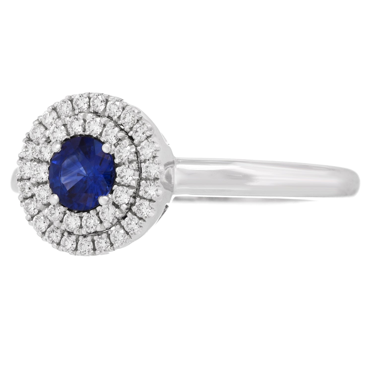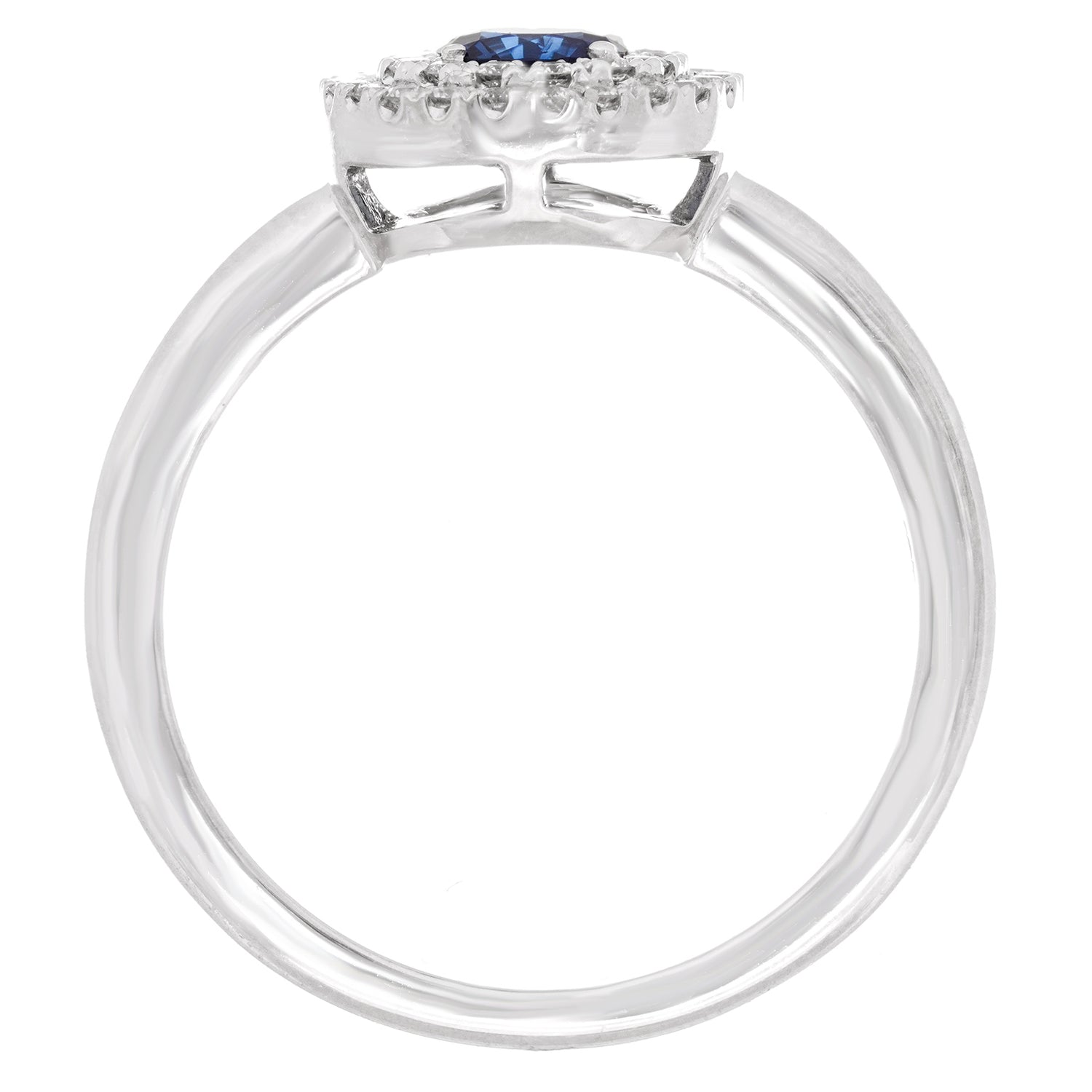 Circa 2000s, 18k, by Spark Creations, New York.  This sleek contemporary ring is set with a .40 carat vivid cornflower blue sapphire surrounded by .20 carats of sparkling white diamonds (G color and VS clarity). Dimensional and luminous, the look is all color and dazzle. Well-made in eighteen-karat white gold, the look is everyday to cocktails on the terrace. Spark Creations is renowned for superior fabrication and their use of only the best materials. Excellent condition.