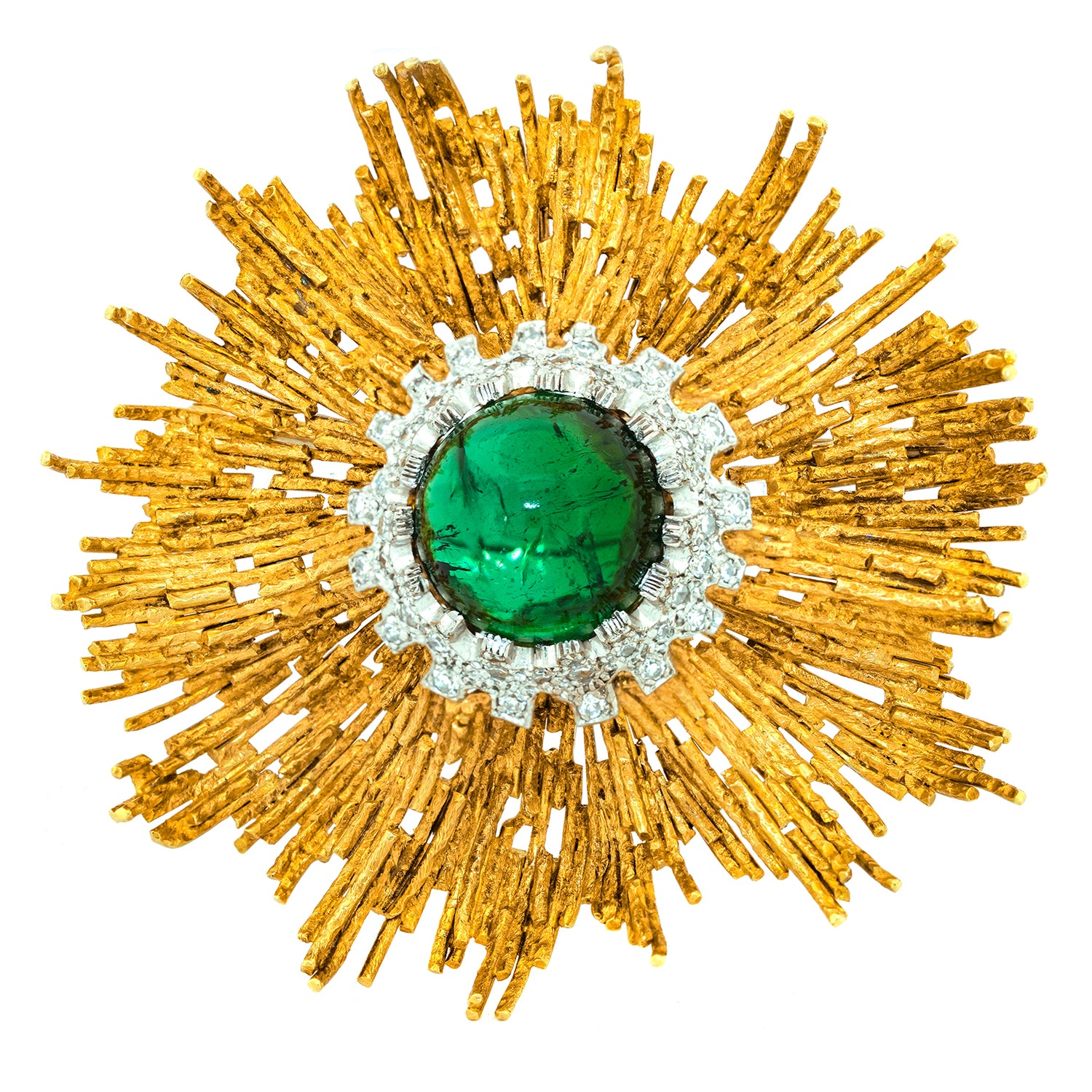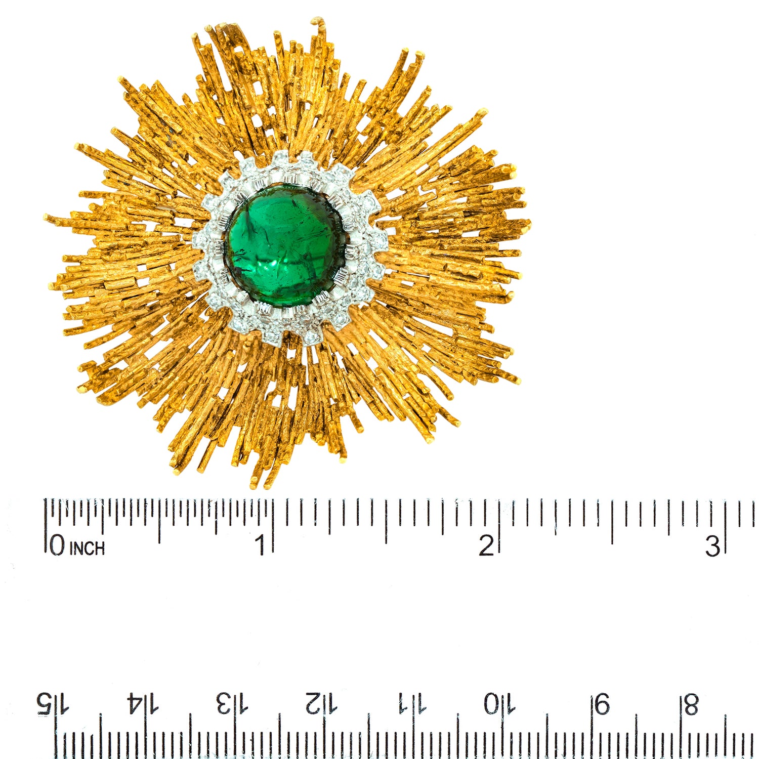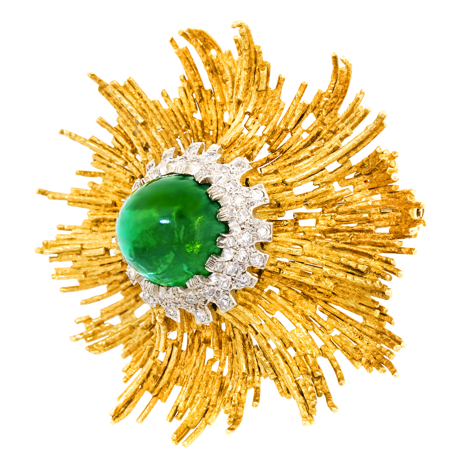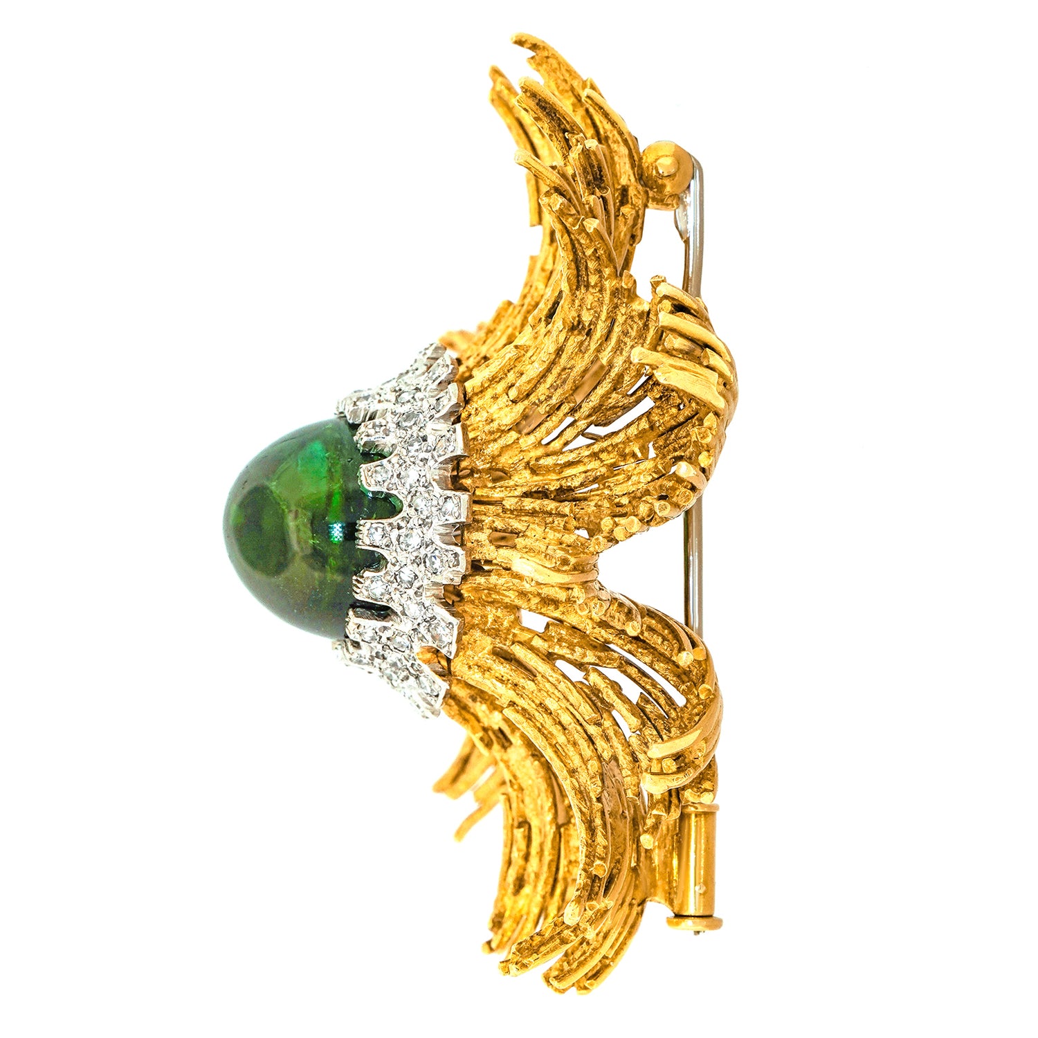 Circa 1967, 18k, by Andrew Grima for Haller Jewellry Co., London.  From the catwalk at fashion week to idyllic cocktails poolside, this brooch has it all! Designed in London by Andrew Grima,  arguably the most important modernist goldsmith of the post-war period, the look has considerable aesthetic wattage. It features a striking 18.0-carat cabochon tourmaline and .65 carats of fine white diamonds (H color, SI1 clarity). With pieces in every important Decorative Arts collection worldwide, Andrew Grima's work was inspirational; it challenged us with new visual images, blending Art and Fashion in brilliantly innovative ways. Excellent condition.