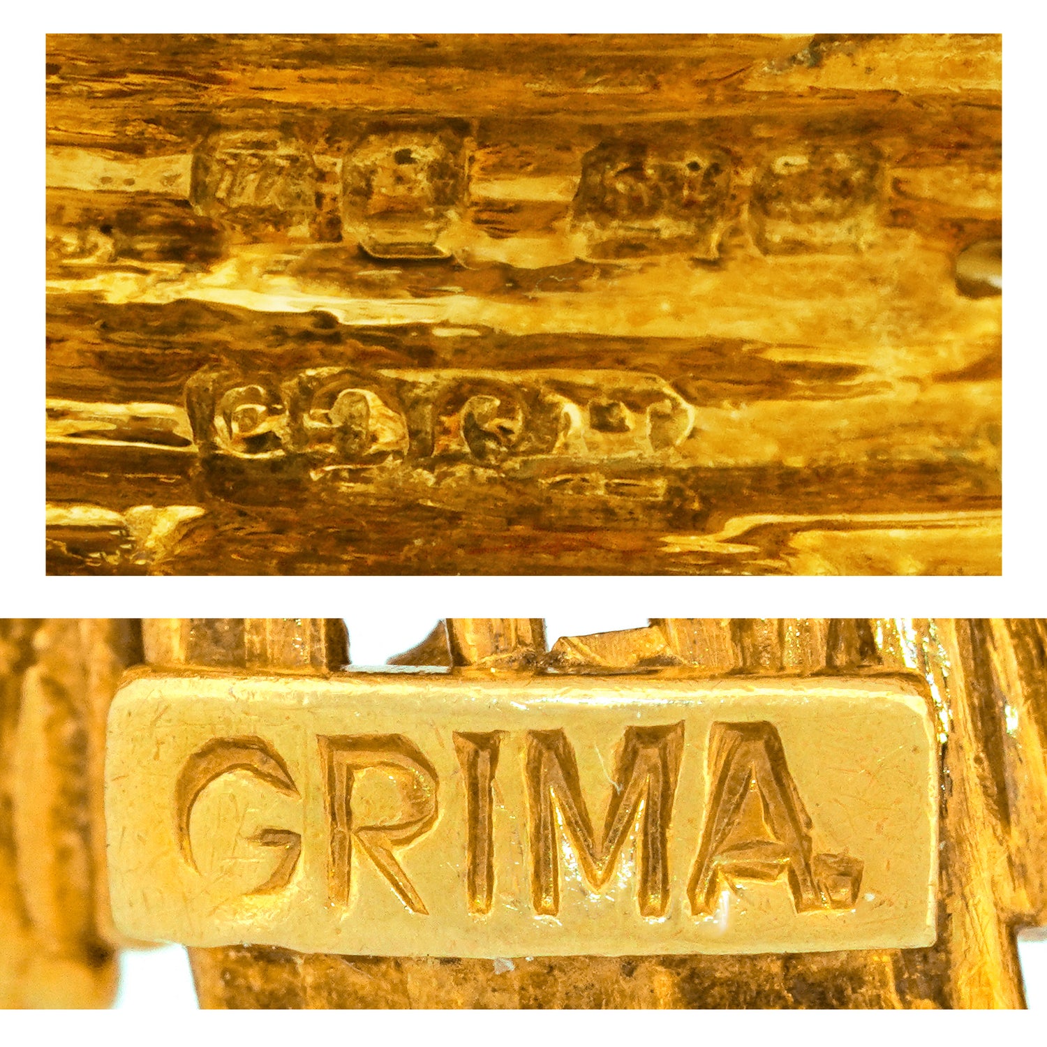 Hallmarks: GRIMA, retailer's mark, gold mark, 18k mark, London mark, and date mark.
