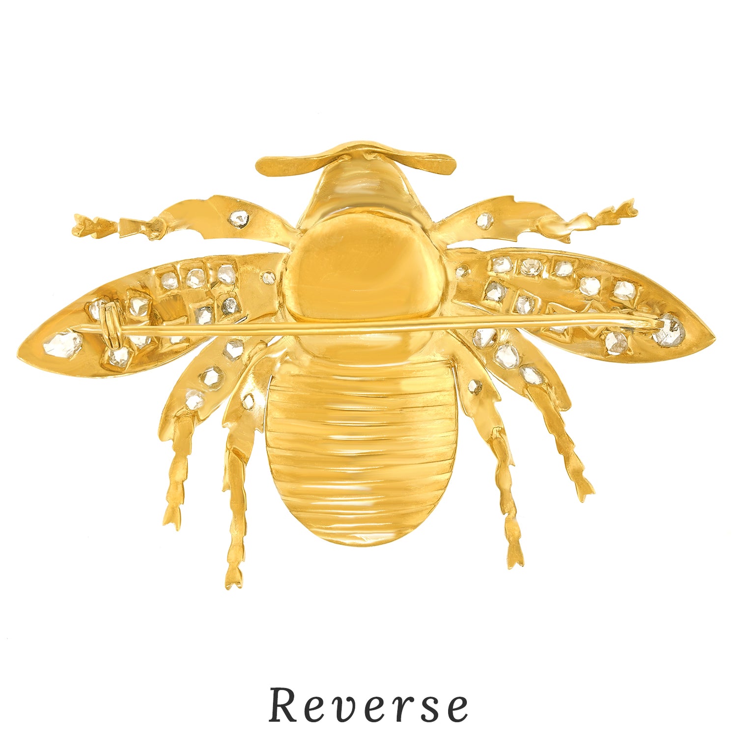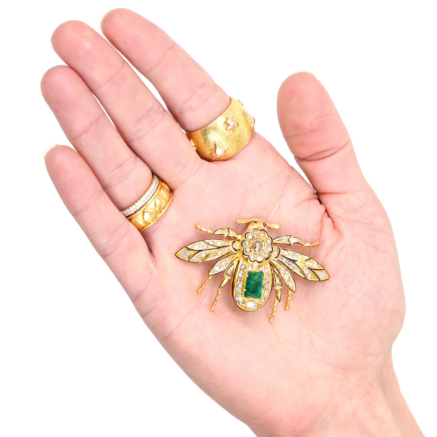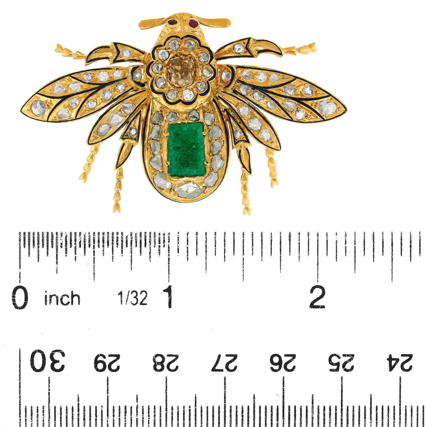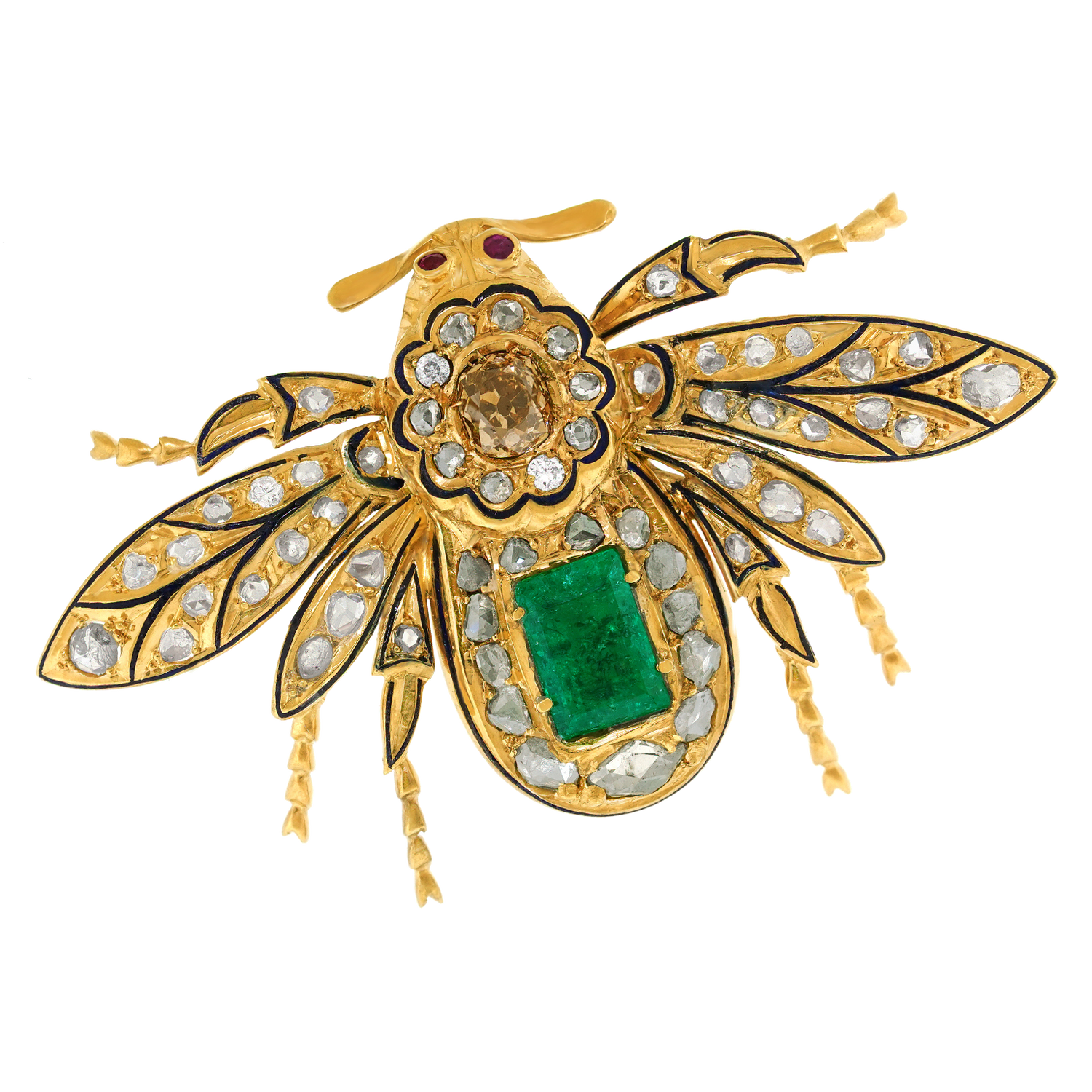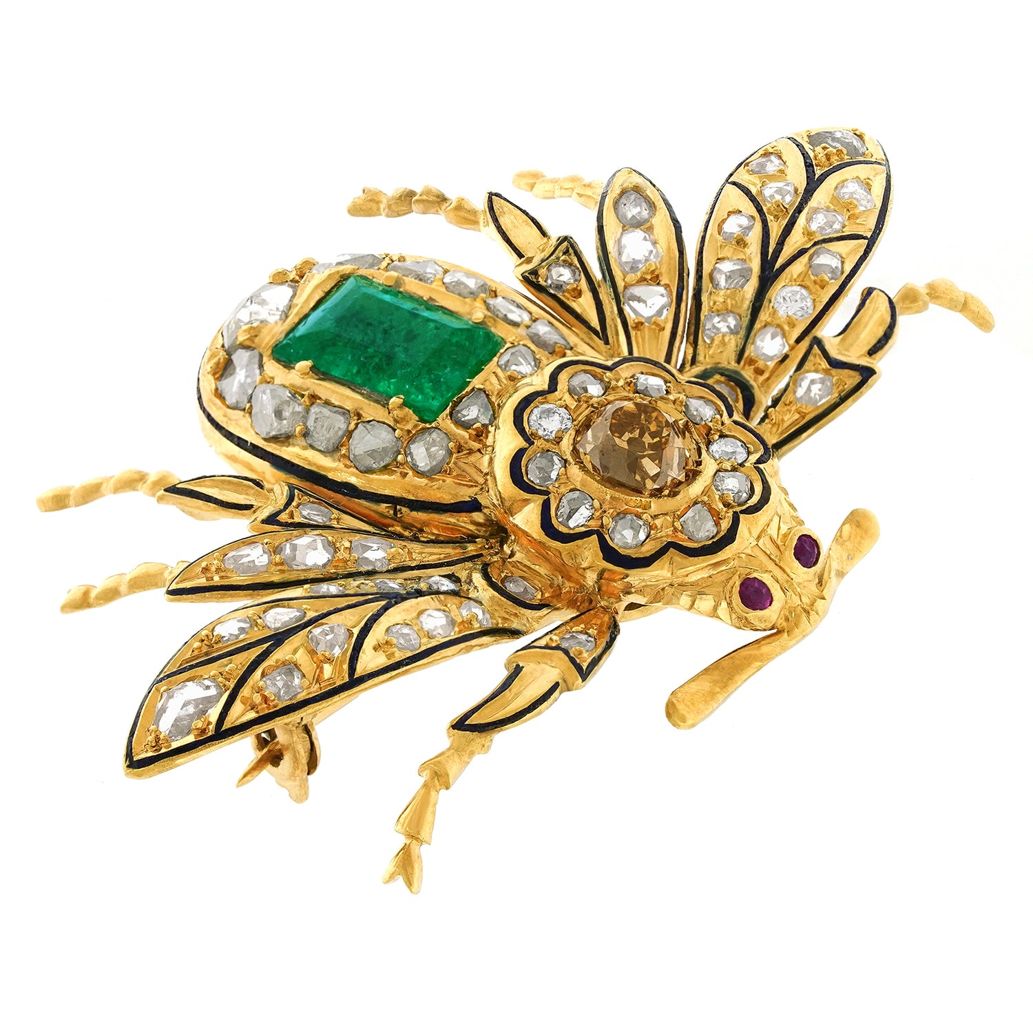 Circa 1870s, 14k. Set with 2.0 carats of rose cut diamonds, a .75 carat cognac diamond (Fancy orangey brown), black enamel, and a 1.50-carat emerald, this fashionably refined 150-year-old Bee brooch is vintage chic at its antique best. Well-made in the traditional manner with meticulous attention to detail, this one-of-a-kind Bee is in excellent condition.
