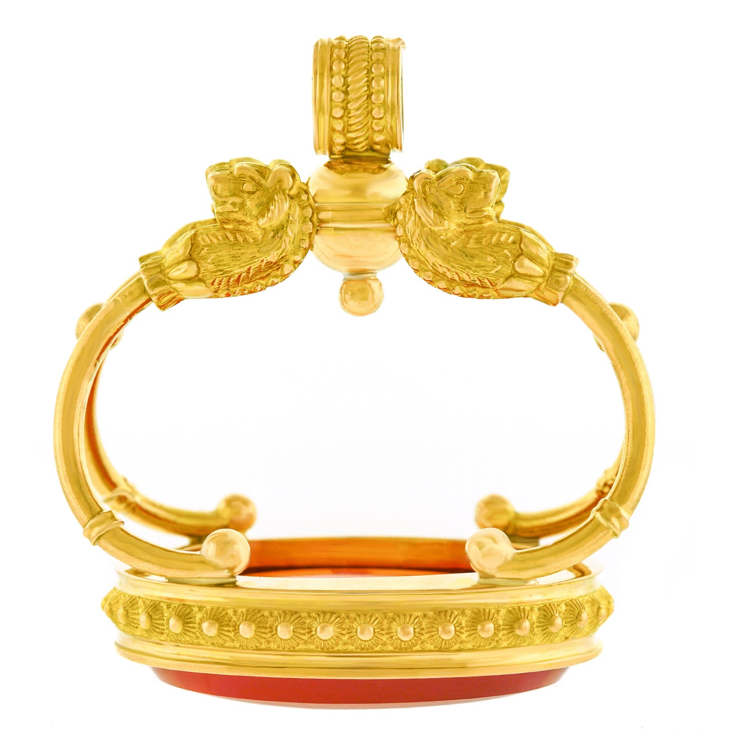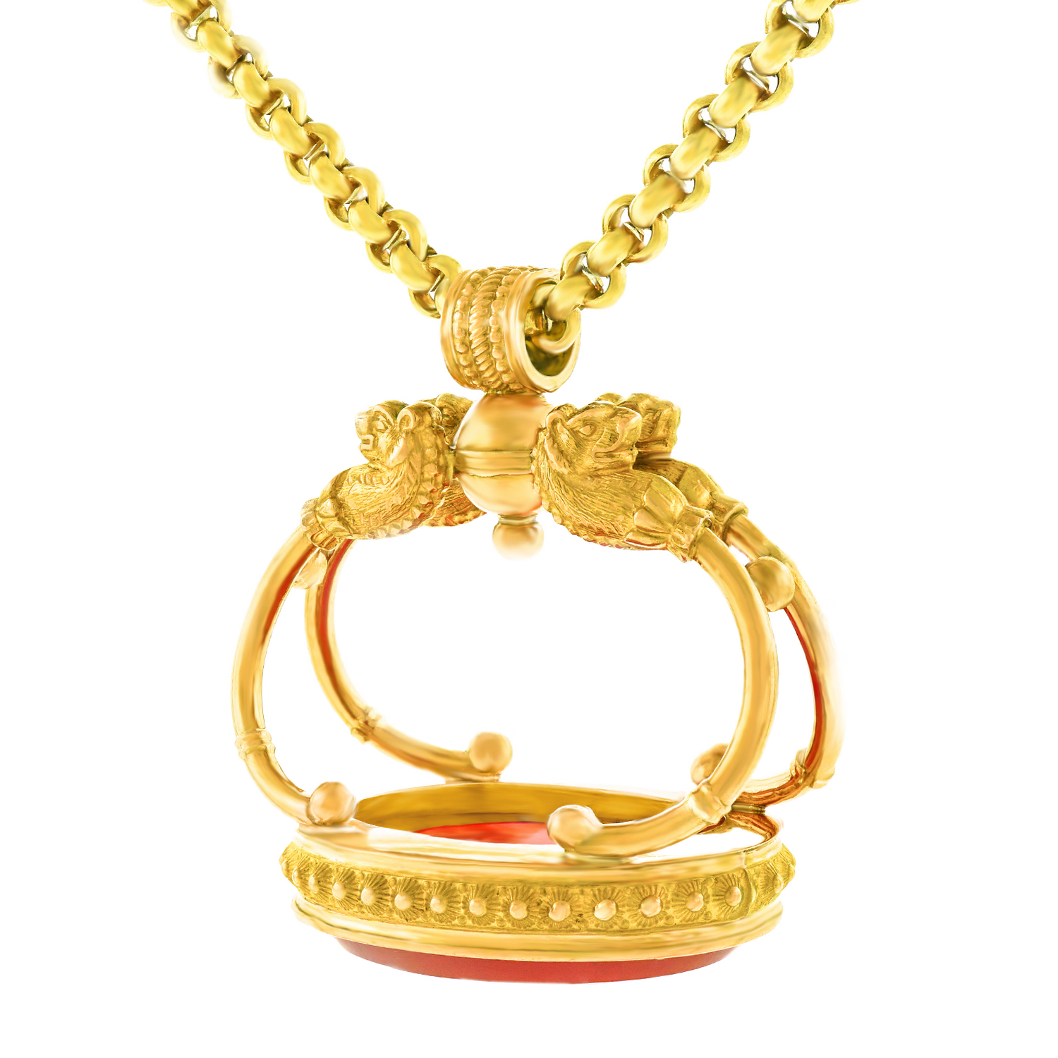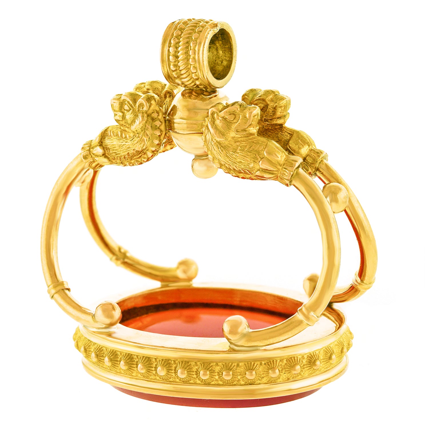 Circa 1880s, 18k, French. This antique fob is a perfect "found object" pendant. Wonderfully decorated with four spectacular lion heads and a delicately hued bright carnelian, the look is Town and Country chic at its Gallic best. Quality hand construction throughout in eighteen-karat gold completes the picture. Excellent condition.