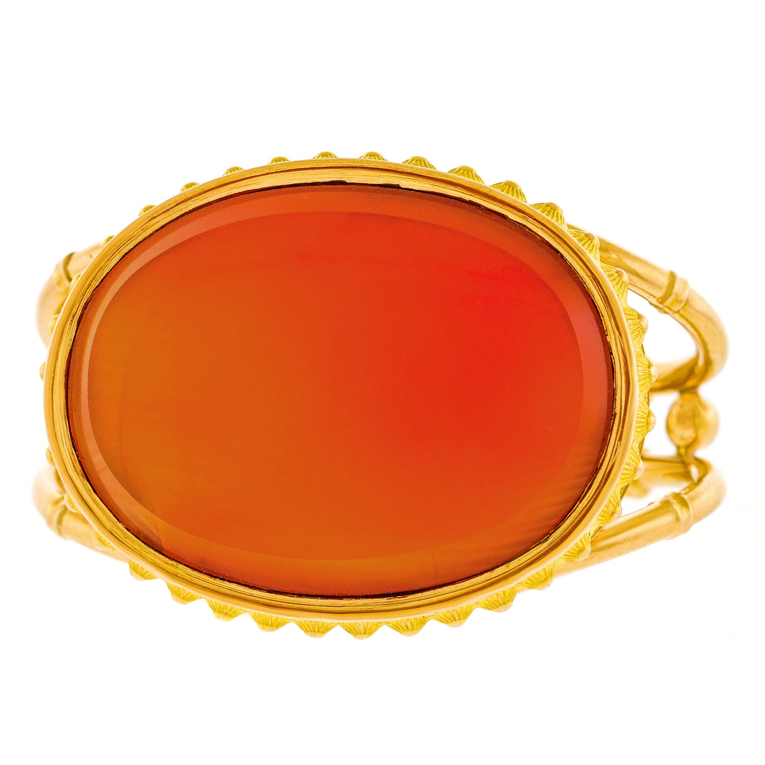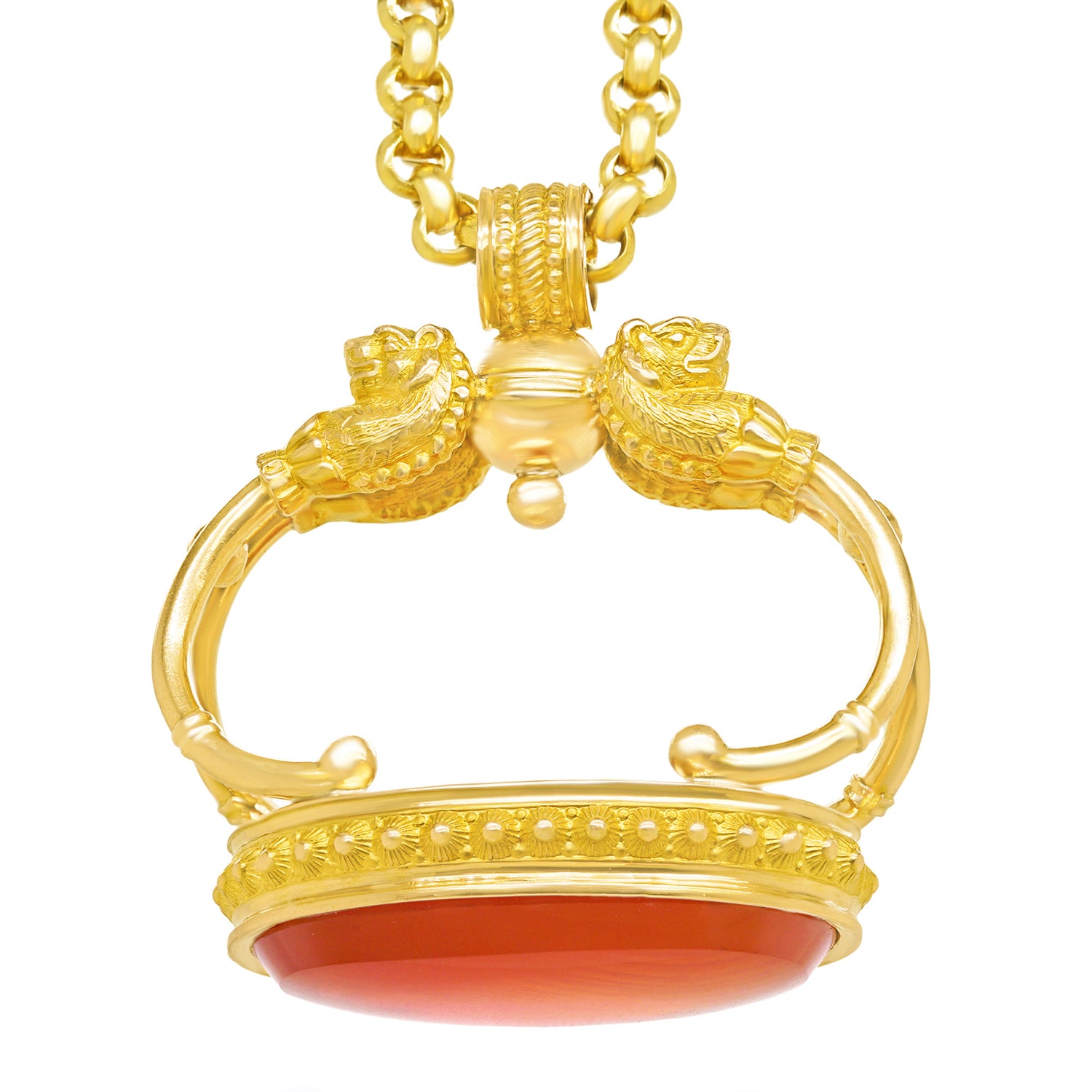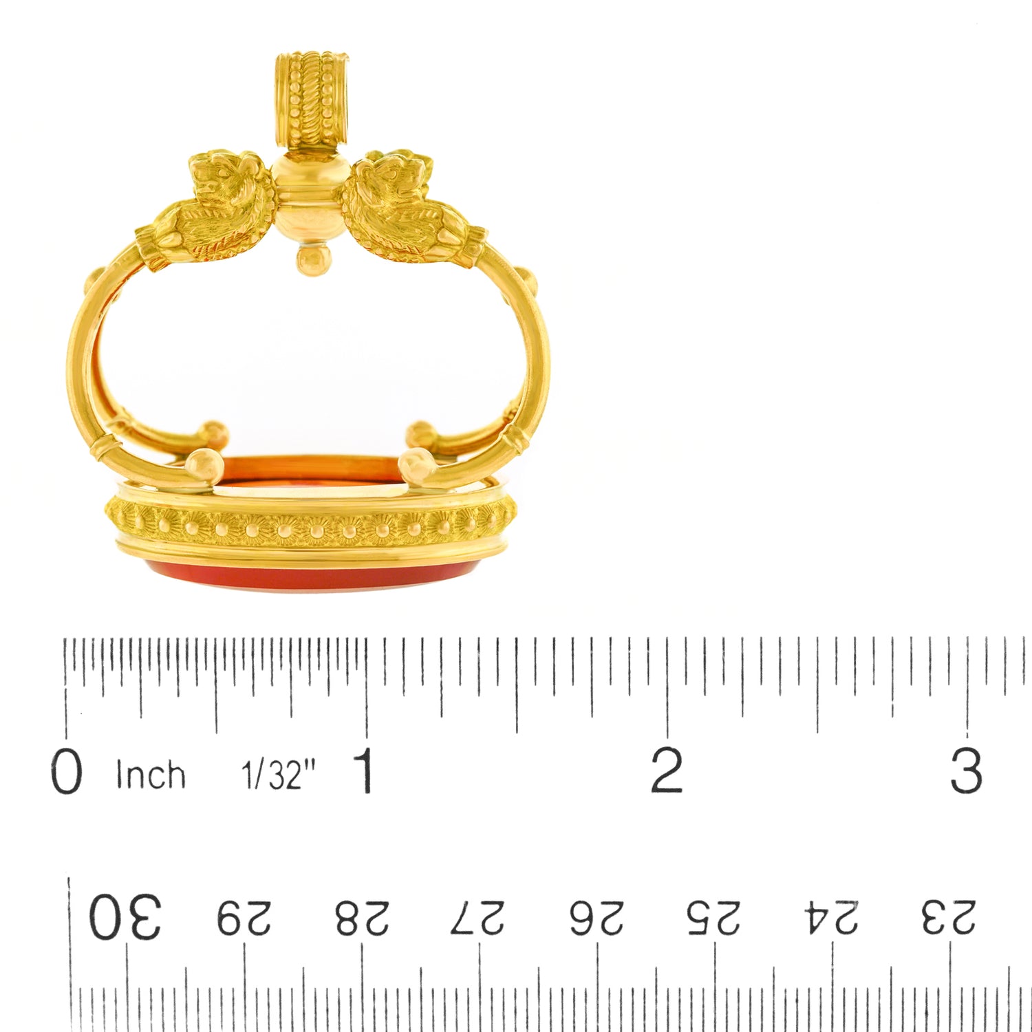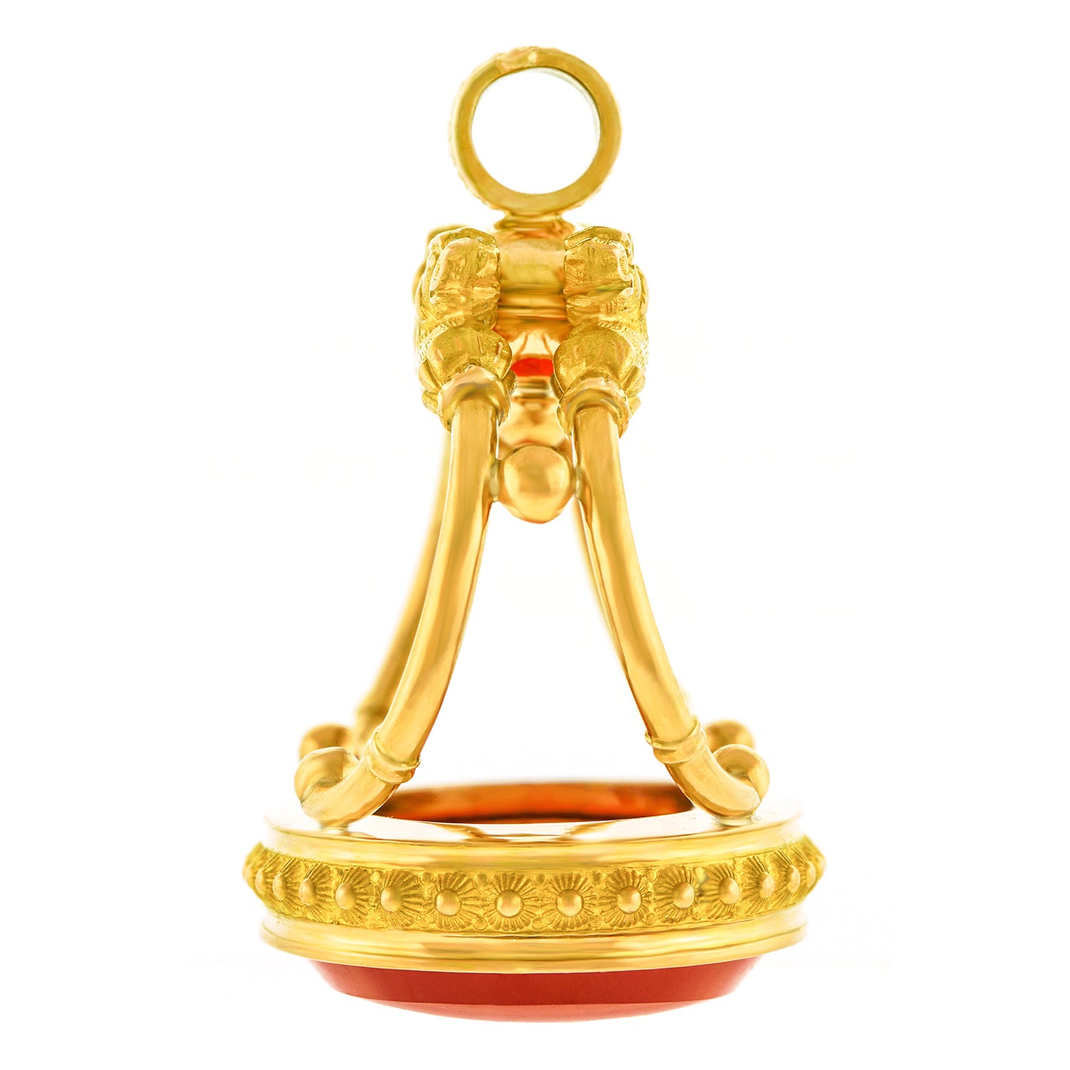 Circa 1880s, 18k, French. This antique fob is a perfect "found object" pendant. Wonderfully decorated with four spectacular lion heads and a delicately hued bright carnelian, the look is Town and Country chic at its Gallic best. Quality hand construction throughout in eighteen-karat gold completes the picture. Excellent condition.