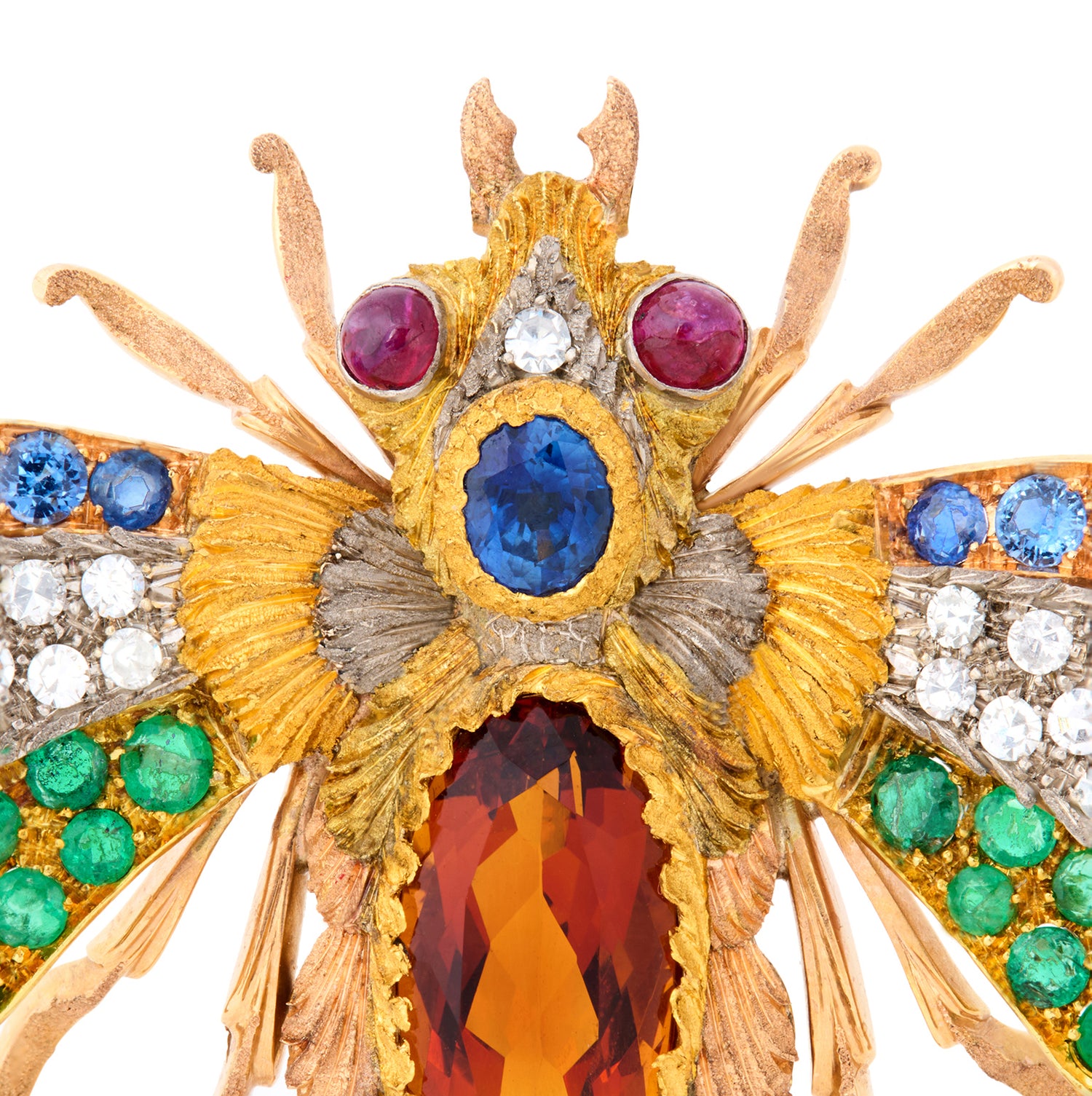 Circa 1970s, 18k, by Cazzaniga, Rome, Italy. This one-of-a-kind jeweled brooch by the renowned House of Cazzaniga is an imaginative fantasy of a bee! The highly ornate design features stunning goldsmithing, complimented by brilliant color … diamonds, sapphires, rubies, emeralds, and a single large citrine. The quality and design work at Cazzaniga is unsurpassed.