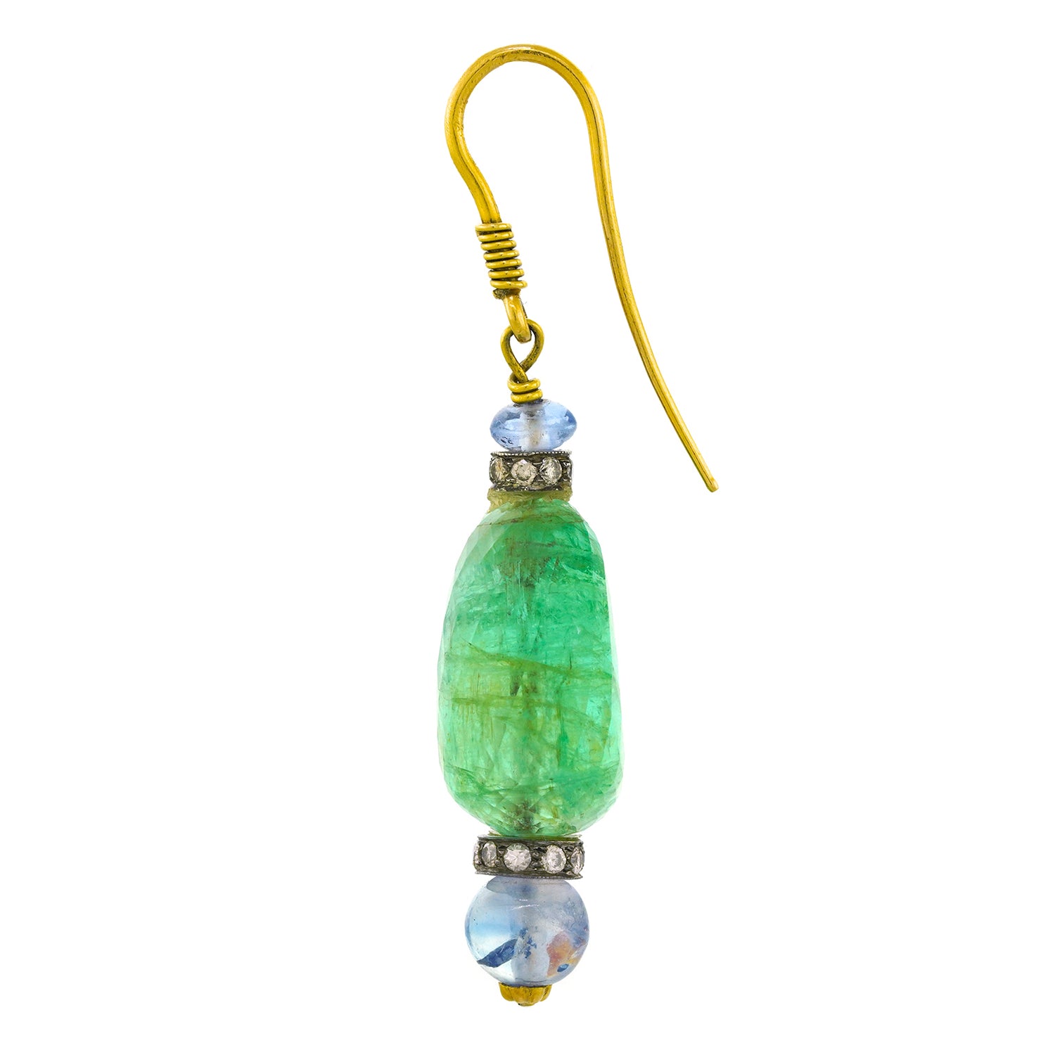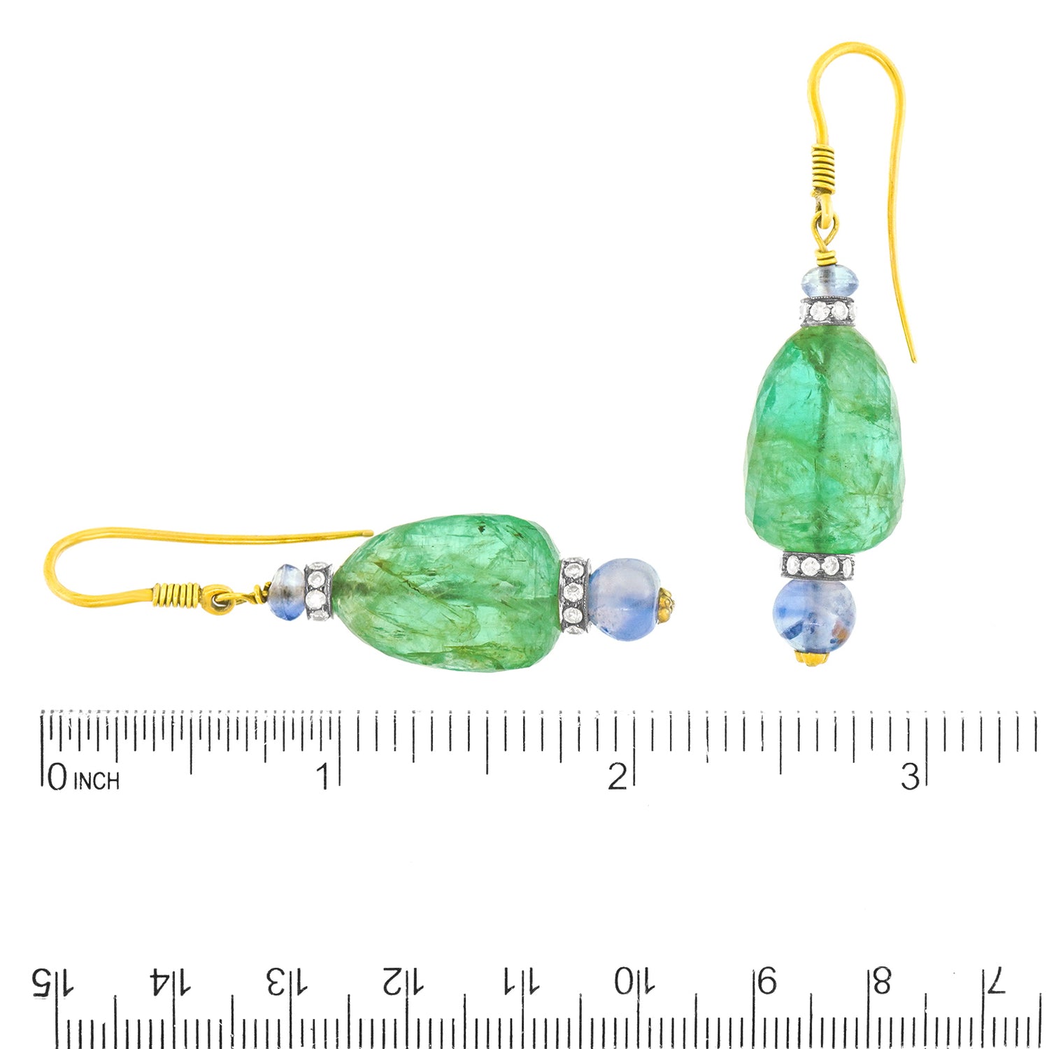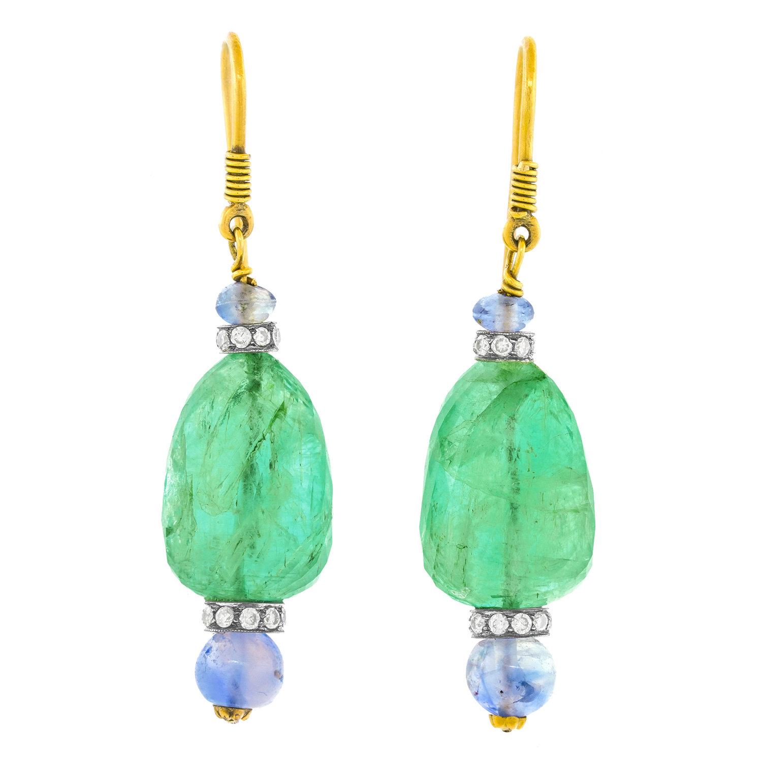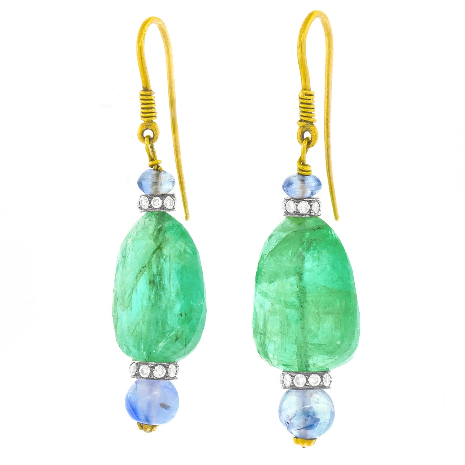 Circa 1990s, 18k. These chic earrings feature luxuriously large, beautiful green emeralds, blue sapphire, and diamond-set rondels. The look is easy breezy, effortlessly pairing with jeans or a dress. Well made, the stones are lively with gorgeous color. Excellent condition.