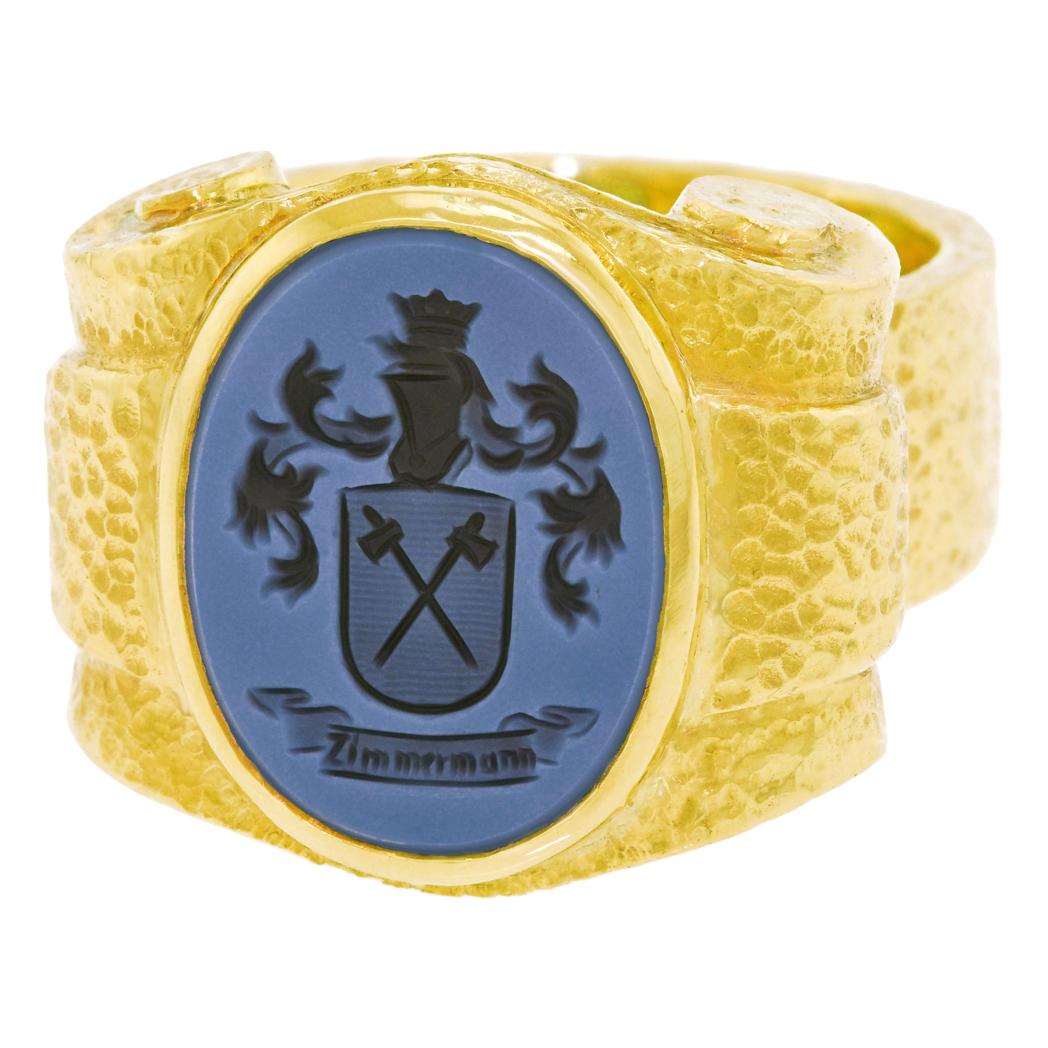 Circa 1900, 18k, Switzerland.  This one-of-a-kind signet ring is set with an intaglio-cut agate. Effortlessly everyday, the look is town and country chic. It is decorated with a crisp coat of arms, meticulously well made, and very heavy.  Excellent condition.