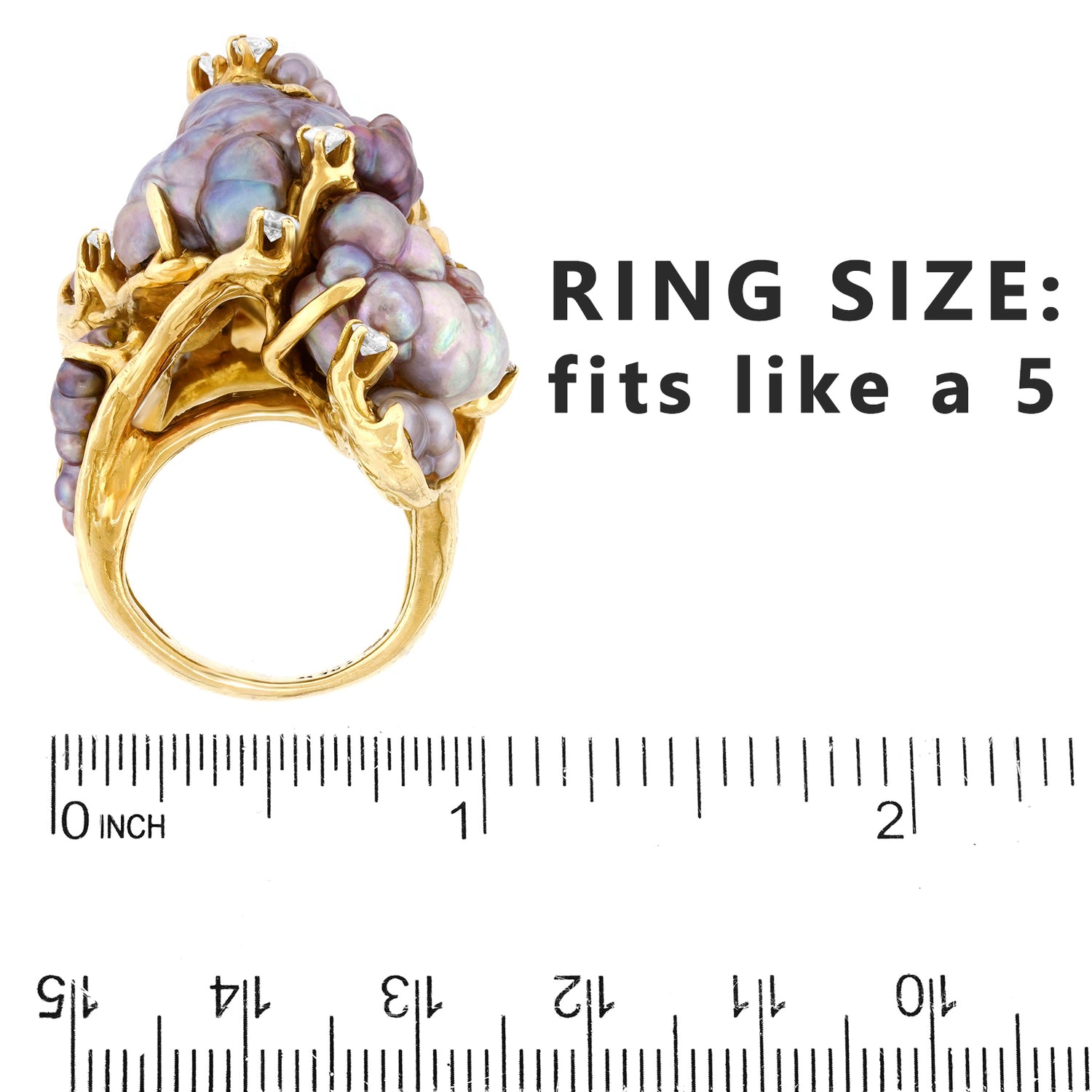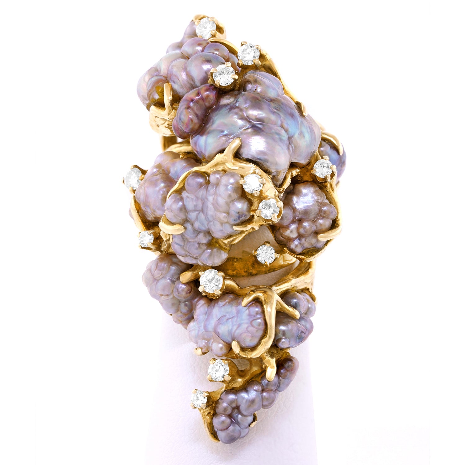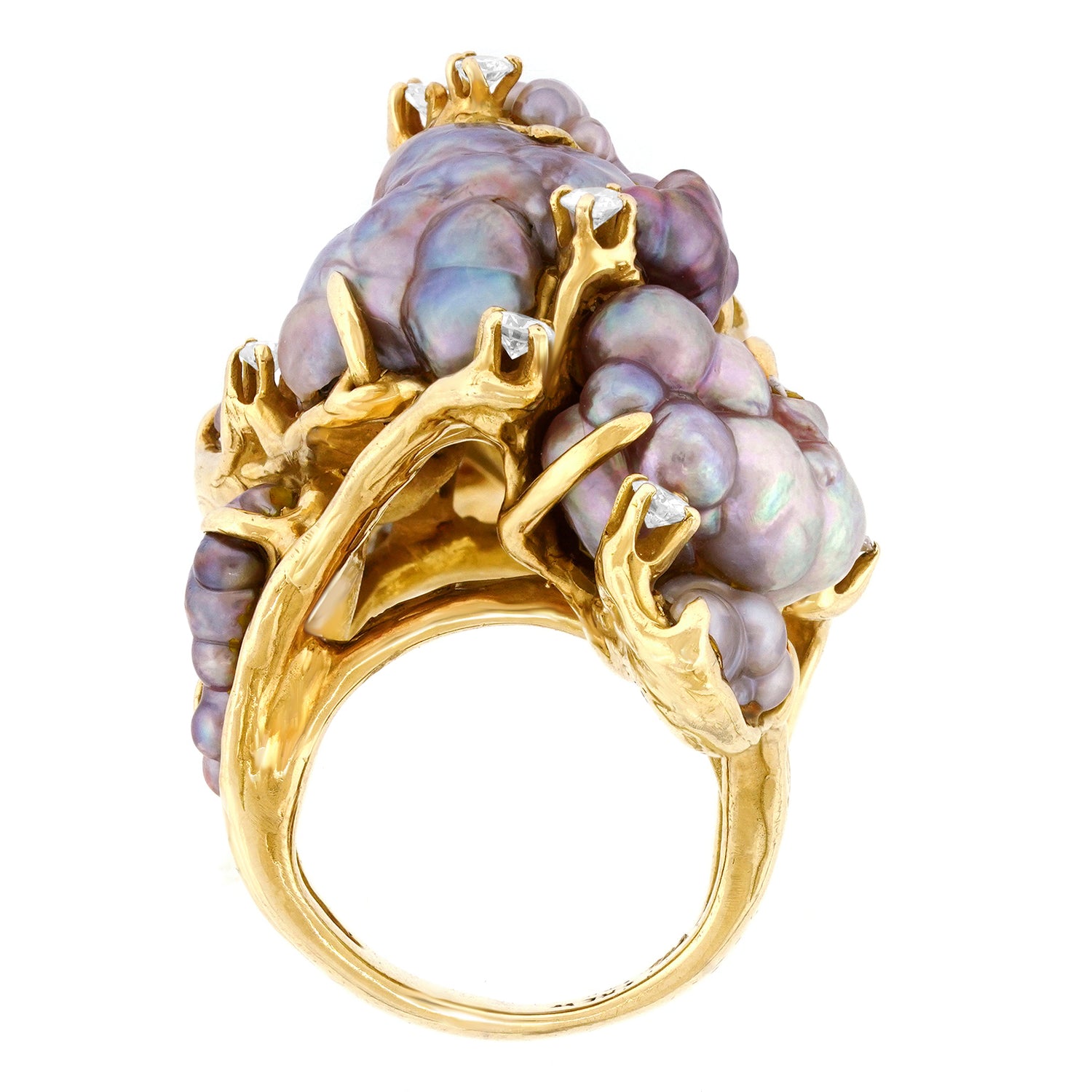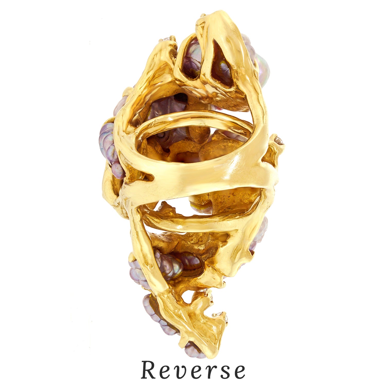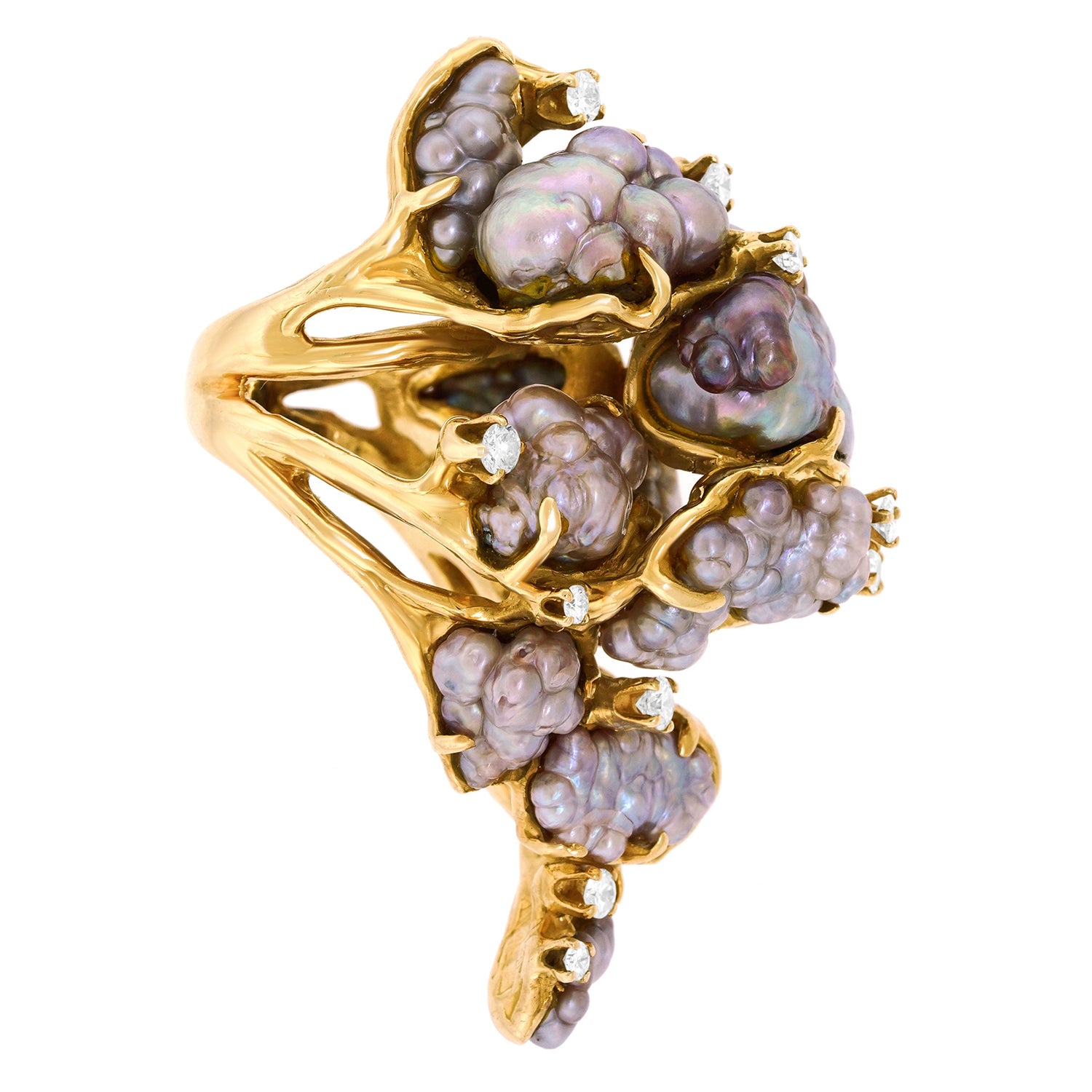 Circa 14k, by J Arnold Frew, American. This impressive Organo-Chic ring by J Arnold Frew features magnificent lavender baroque river pearls in a sinuous eighteen-karat yellow gold mounting. Brilliant white diamonds (H color, SI1 clarity) complete the picture. Highly sought after for their naturalistic look, J Arnold Frew's body of work dates back to its beginnings in 1954.  Excellent condition.
