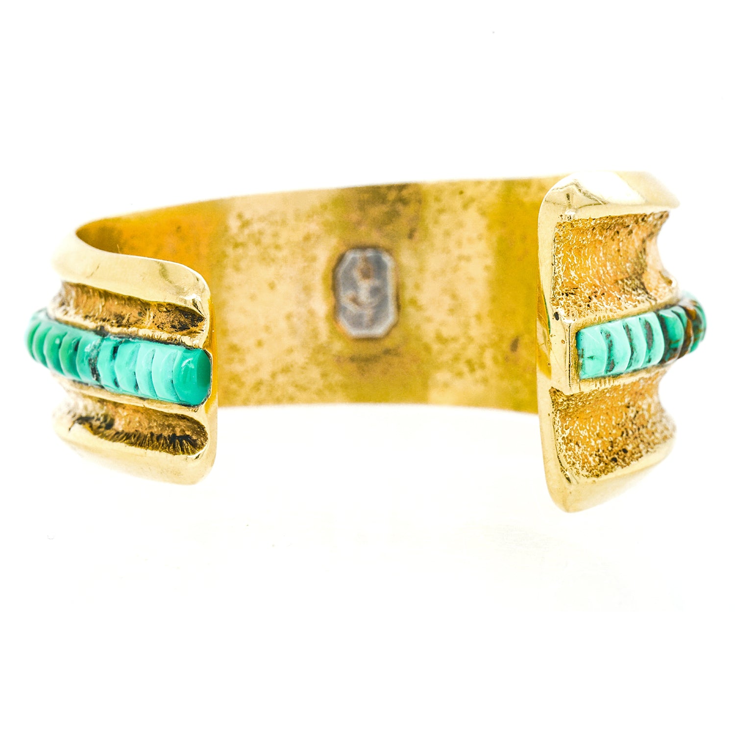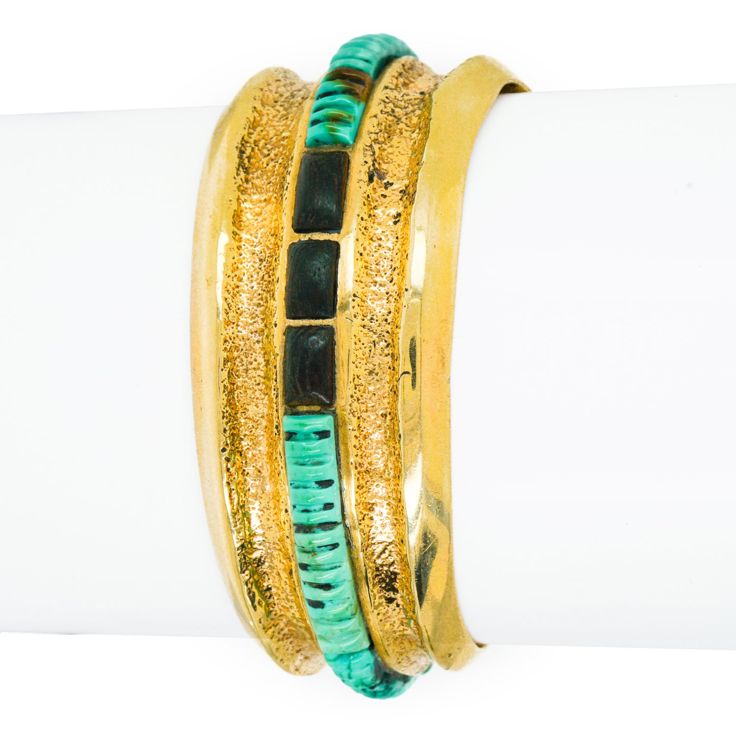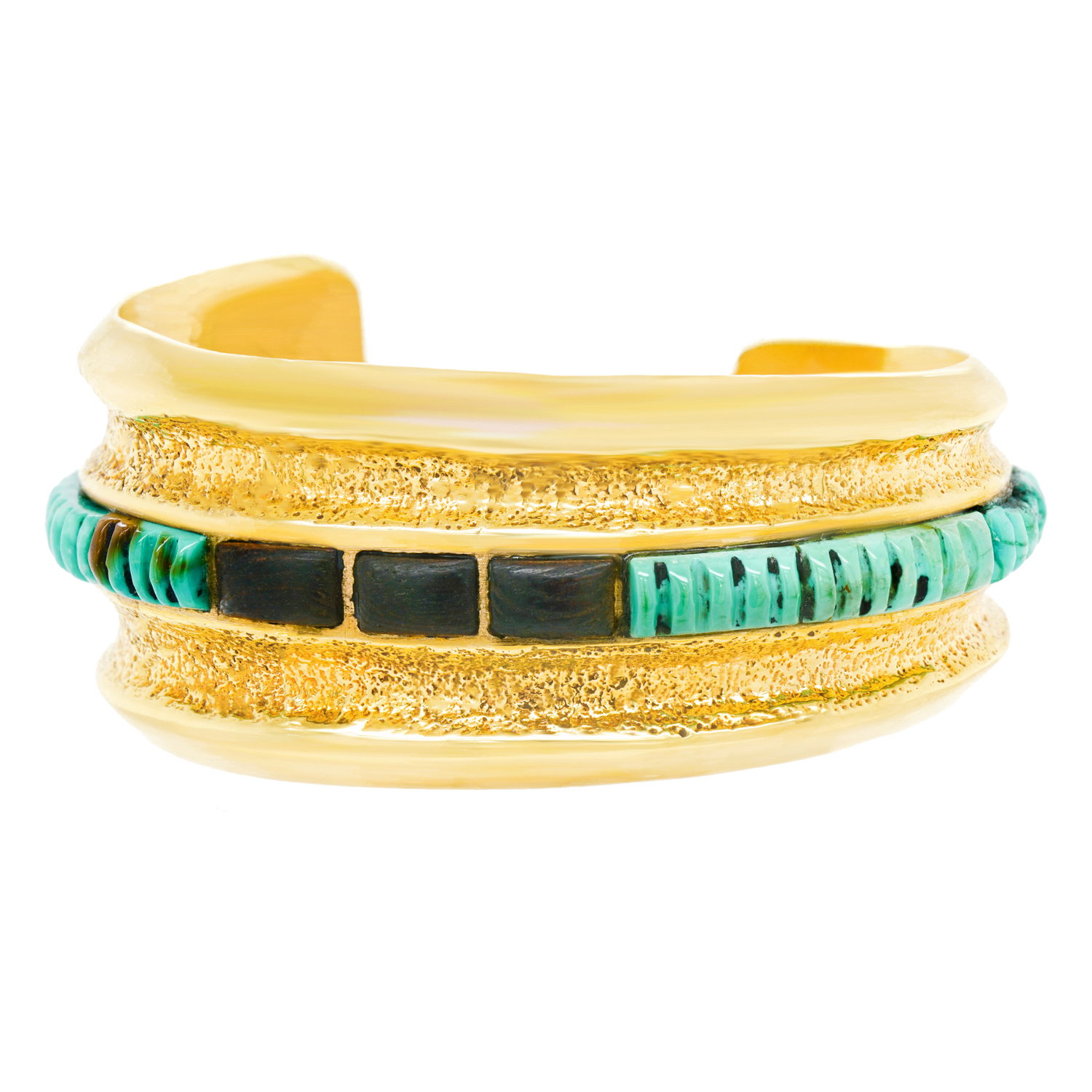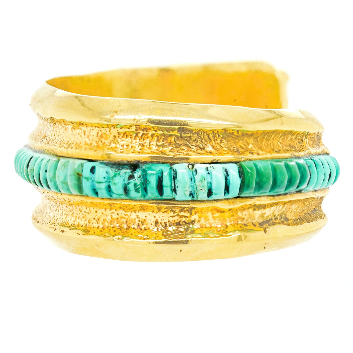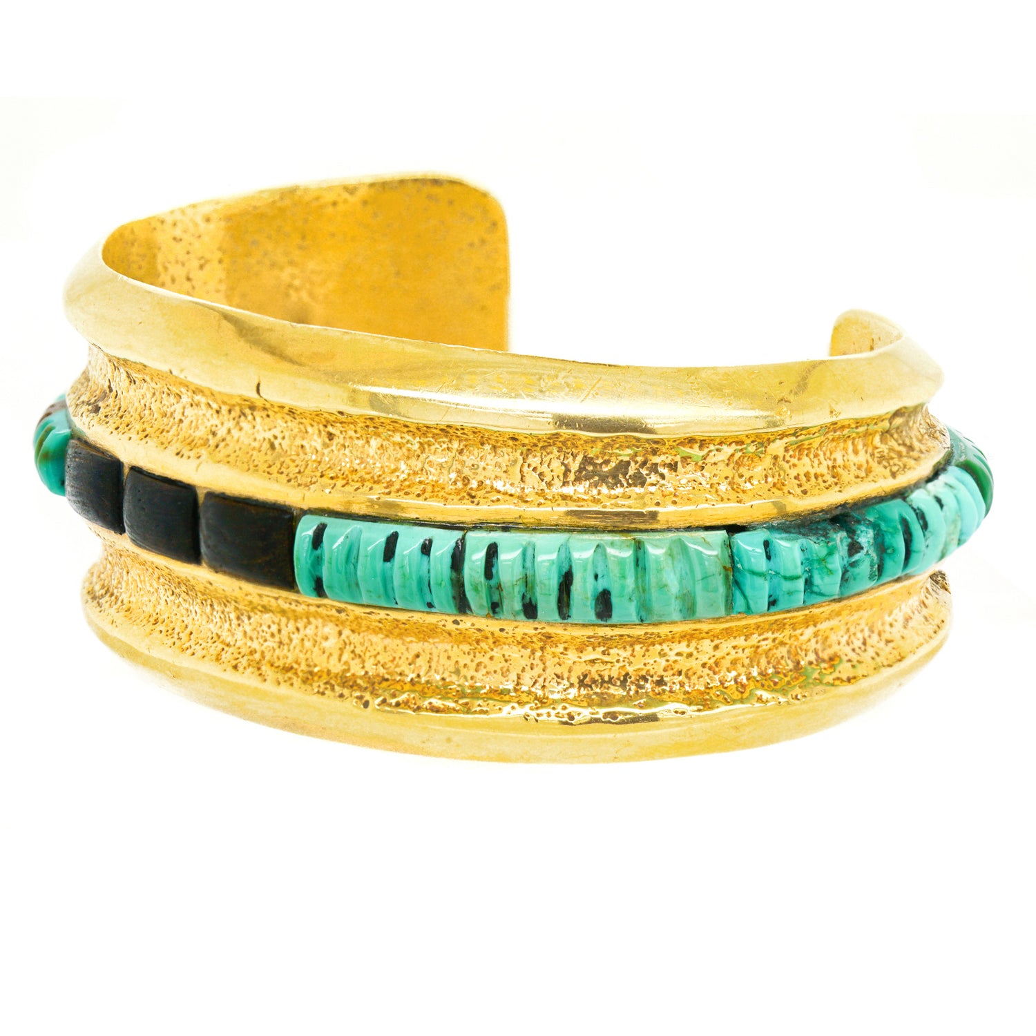 Circa 1950-60s, 14k, by Preston Monongye, Hopi, American. Set with heishi bead motif turquoise and ebony in yellow gold, this early modernist Hopi bracelet flawlessly tempers contemporary design with Southwestern sensibilities. The look is sidewalk to catwalk, as comfortable on the beach as at fashion week. Its creator, Preston Monongye, is a renowned Hopi artist with pieces in major museums and private collections around the world. Excellent condition.