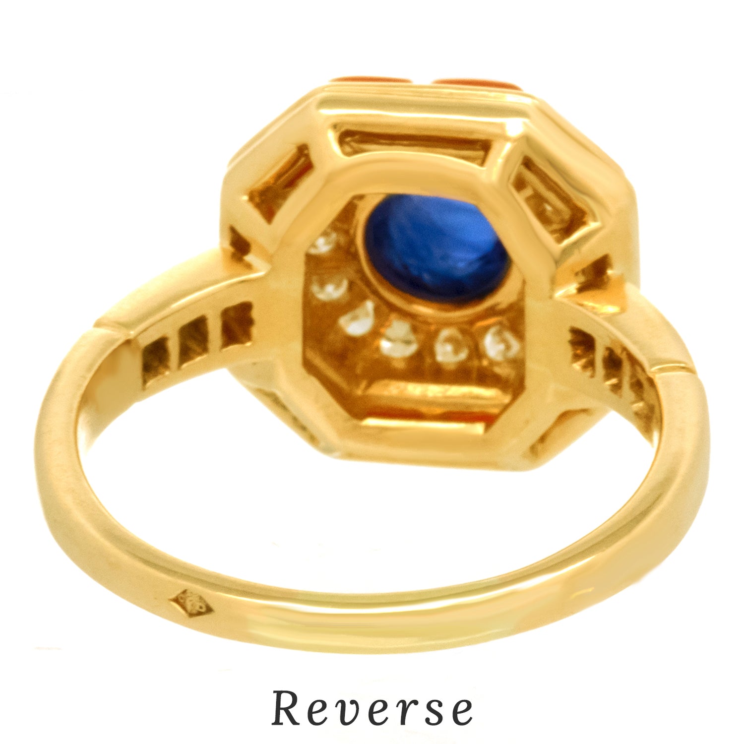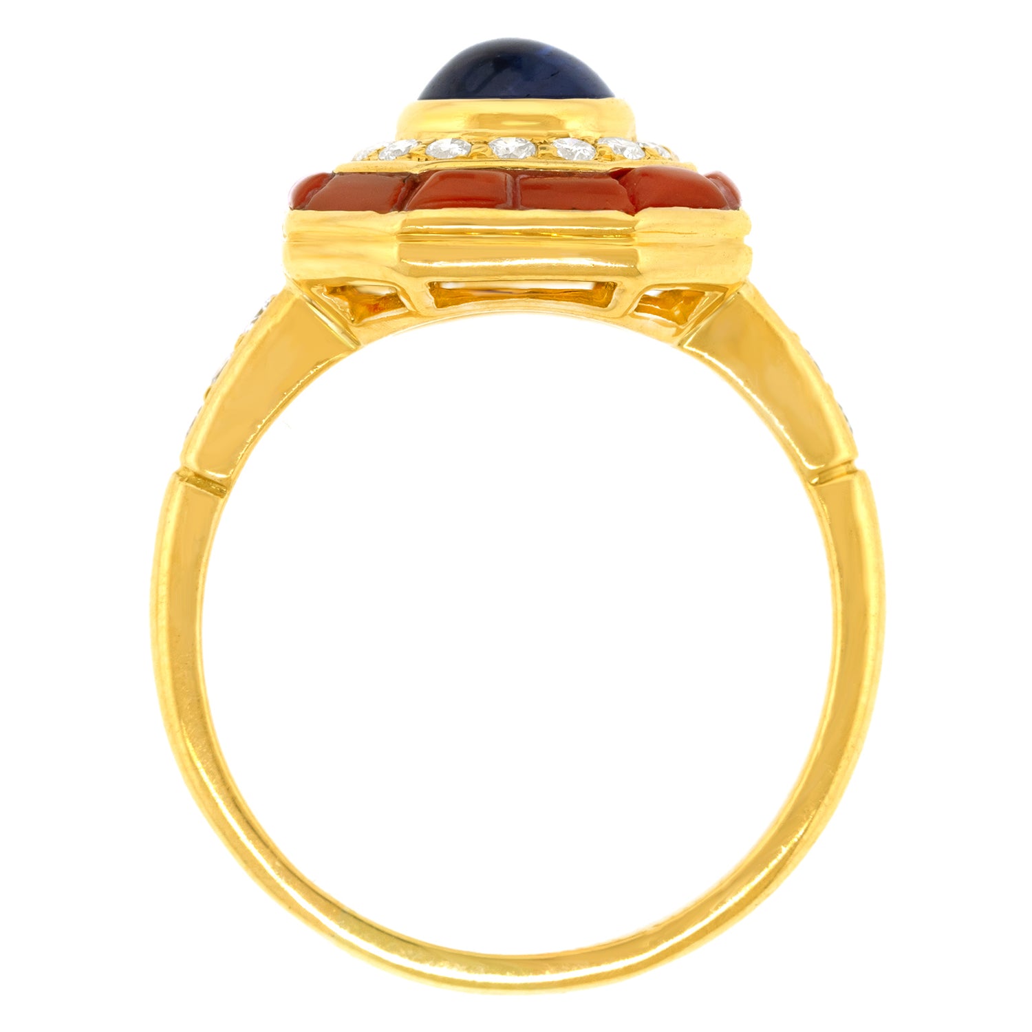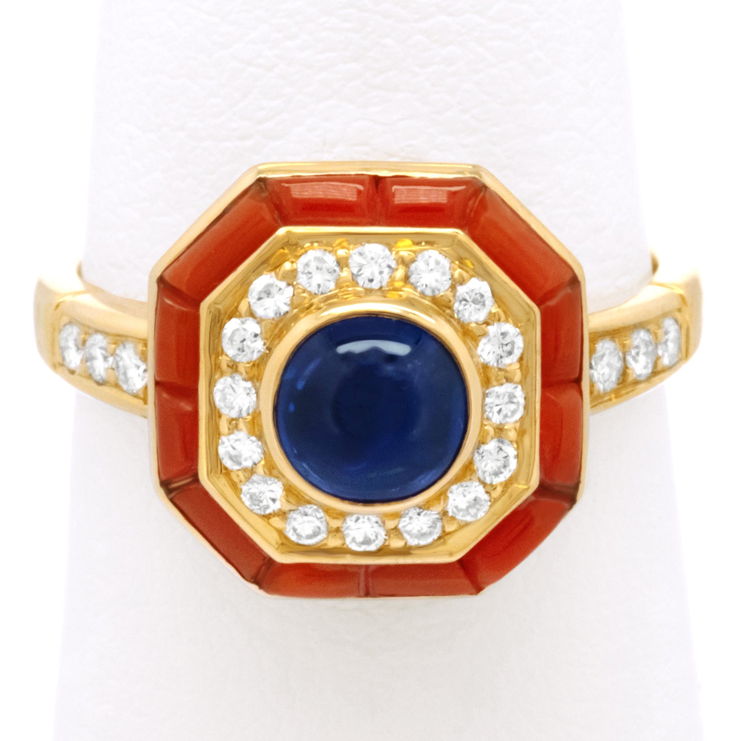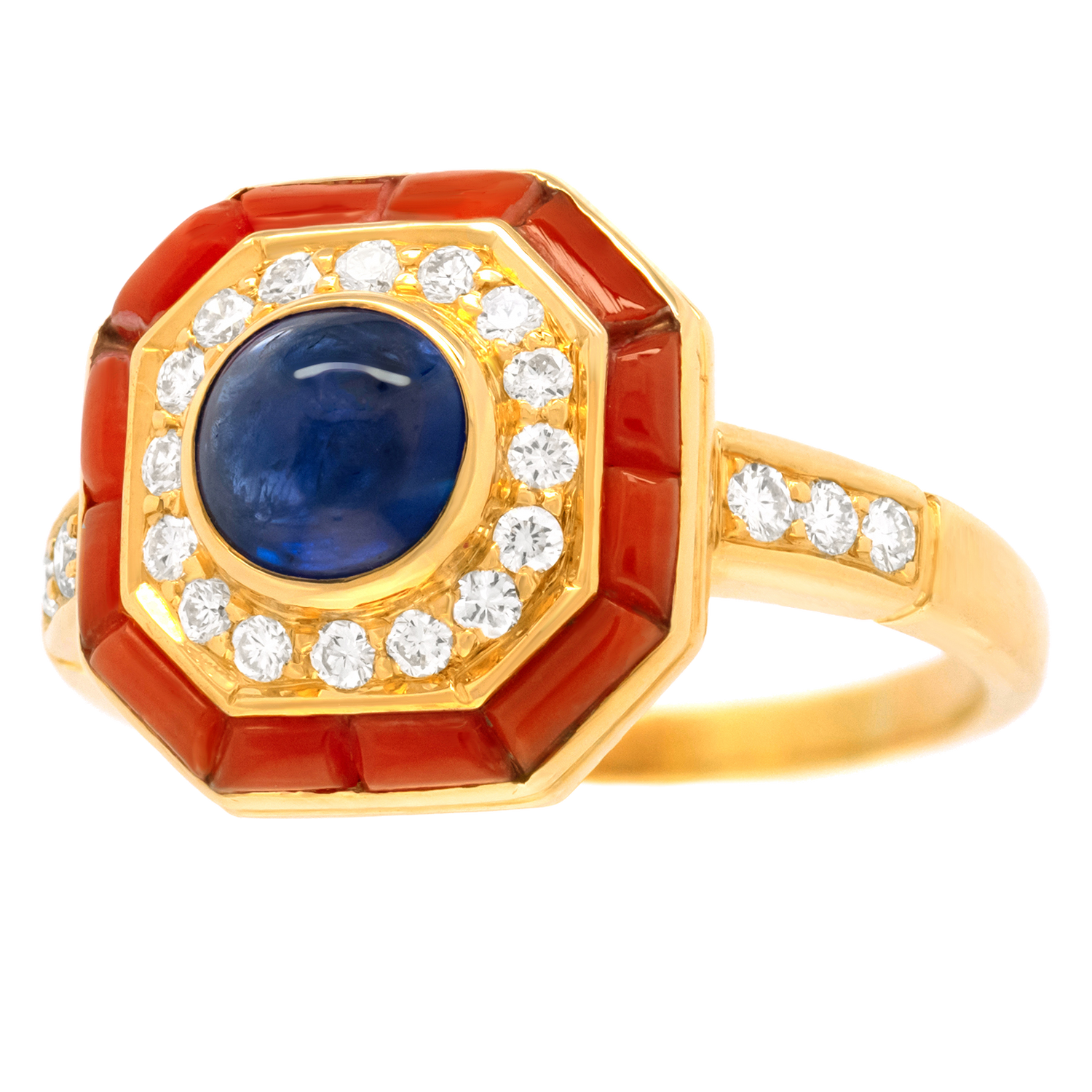 Circa 1970s, 18k, France. This Parisian ring features an octagonal motif set with a gorgeous 1.25-carat royal blue sapphire, surrounded by .22 carats of brilliant white diamonds (F color, VS clarity), and trimmed in bright red-orange coral. The look is seventies Parisian chic! Finely made in 18-karat yellow gold, this striking Gallic ring is in excellent condition.