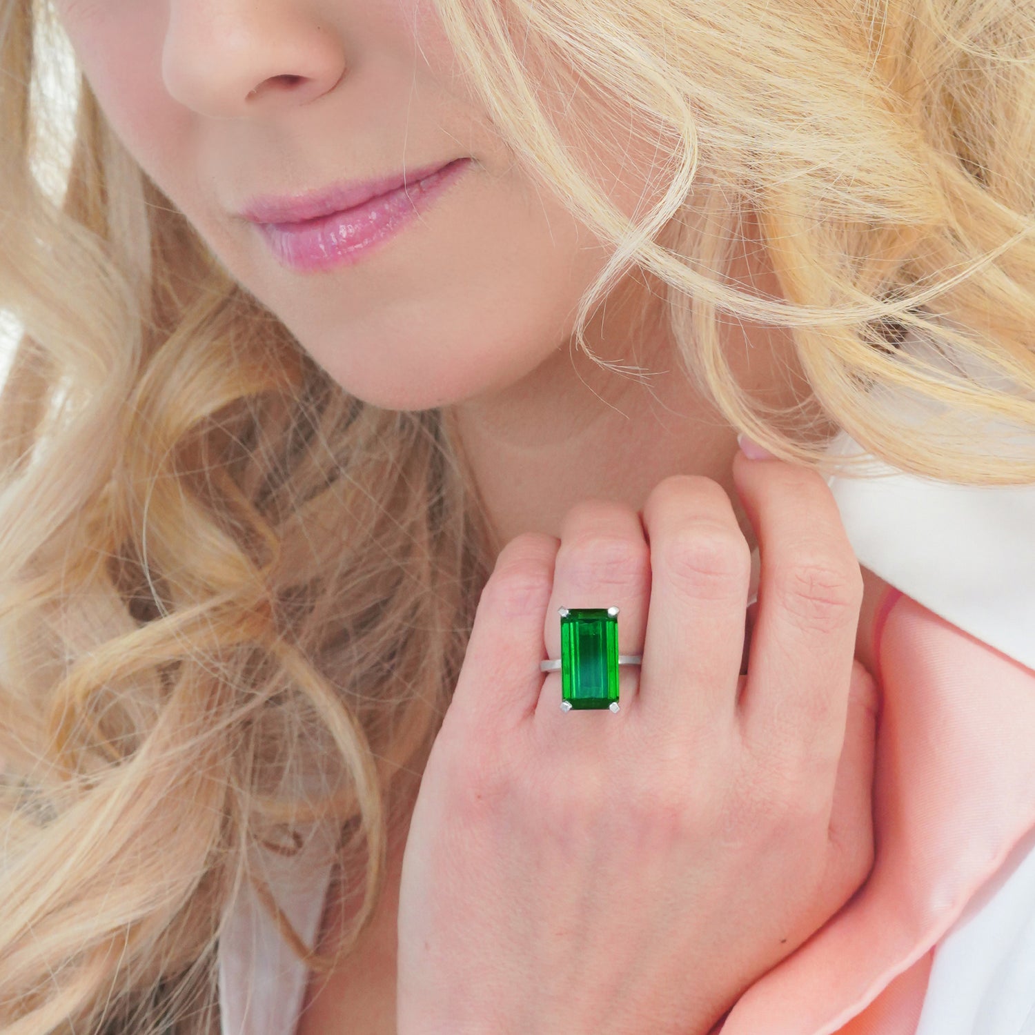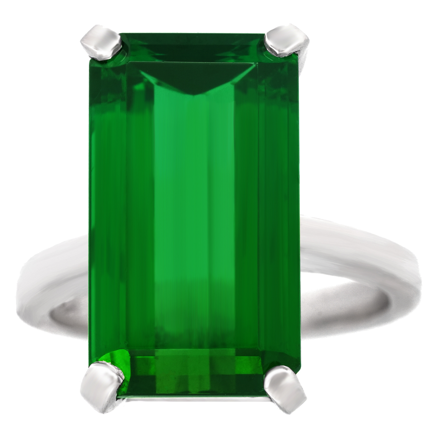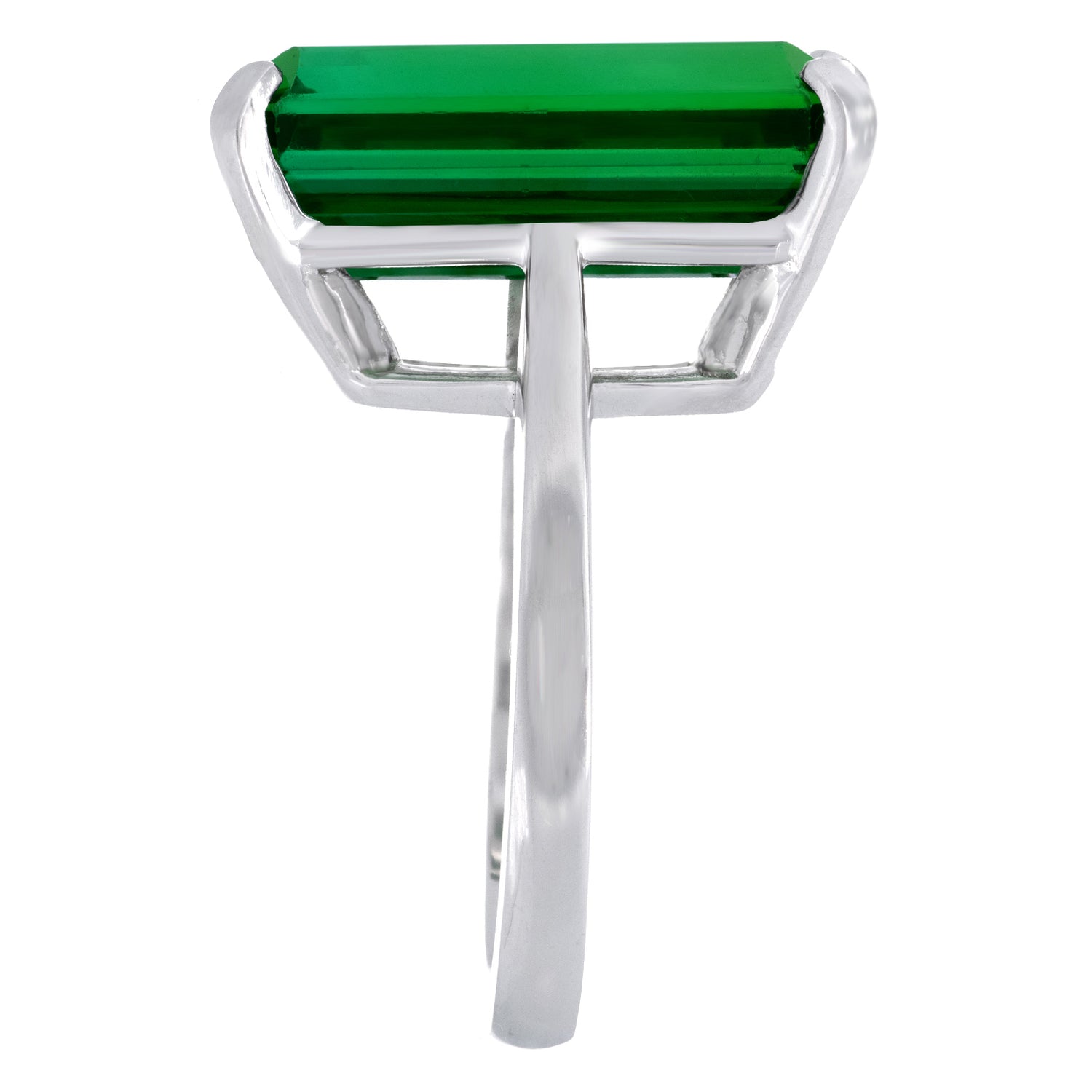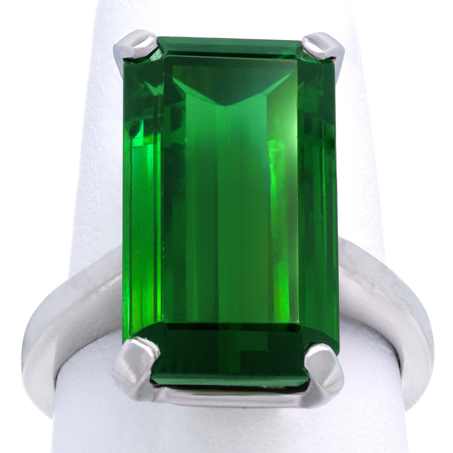 Circa 1960s, Platinum, American. This sleek American modern ring is ablaze with color! The 12.0-carat tourmaline is bright, sparkly, luminous…. The elegant platinum mounting is all about the stone. The look is sixties glamour American style. From jeans to cocktails, make it part of your signature fashion adventure! Excellent condition.