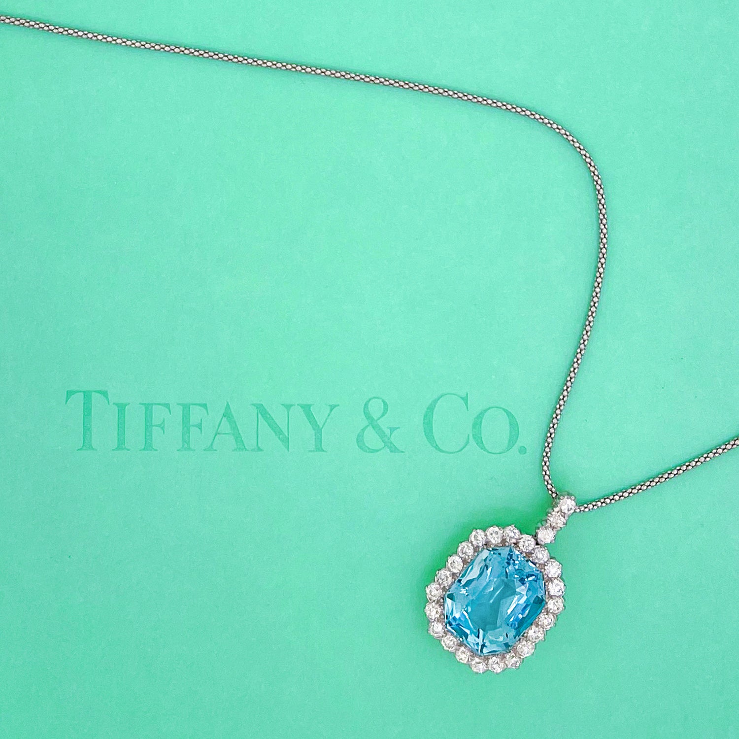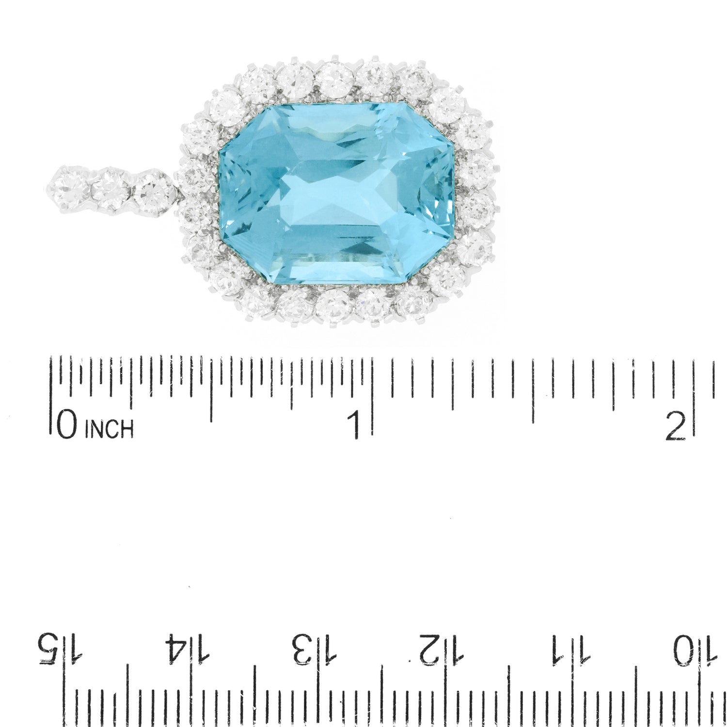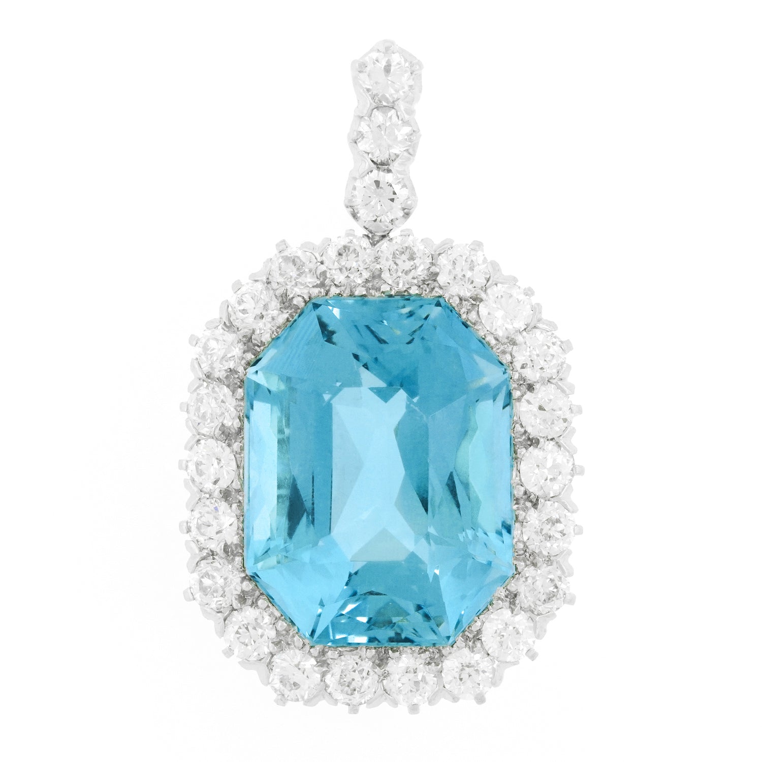 Circa 1910, 18k/Platinum, by Tiffany & Co, New York. Captivating in its elegance, this gorgeous Tiffany & Co. pendant features a 22.0-carat Santa Maria aquamarine, surrounded by 3.0 carats of fine white diamonds (G color and VS clarity). The bale of the pendant is removable and can be replaced by an appliance mounted with a pin stem. Finely crafted in platinum and 18k yellow gold to the highest Tiffany & Co. standard of quality, the look is antique chic at its tasteful and luxurious best. Excellent condition. In our opinion the pin appliance is original and the pendant appliance is a restoration, (we made the tool to change appliances).