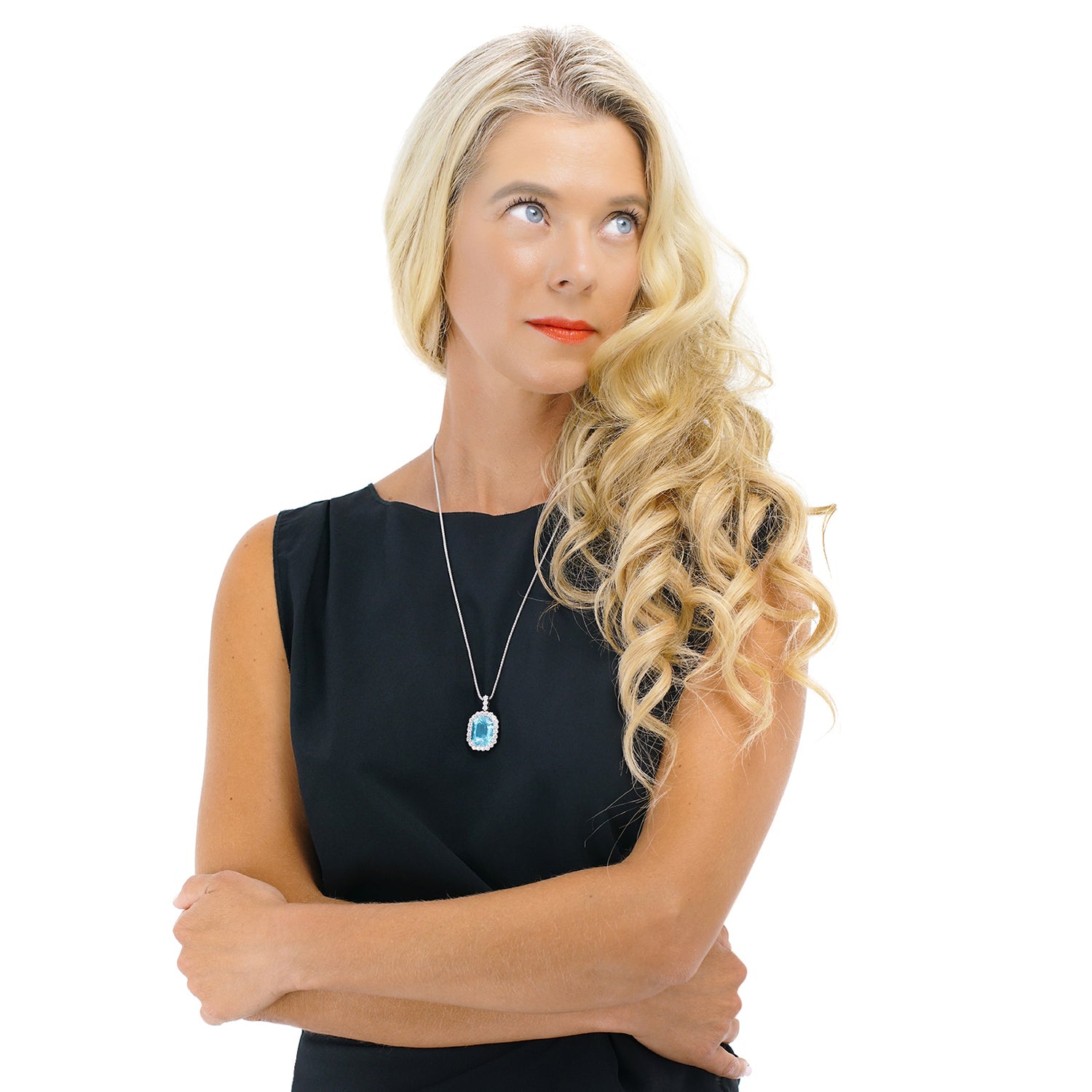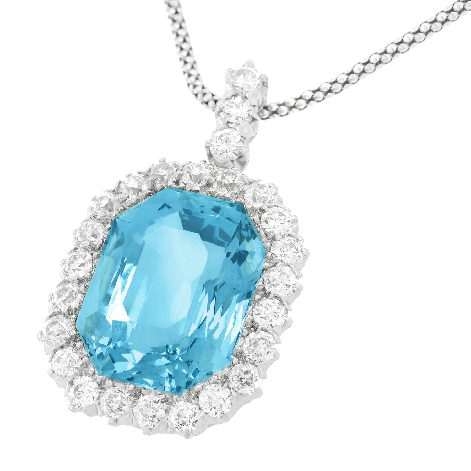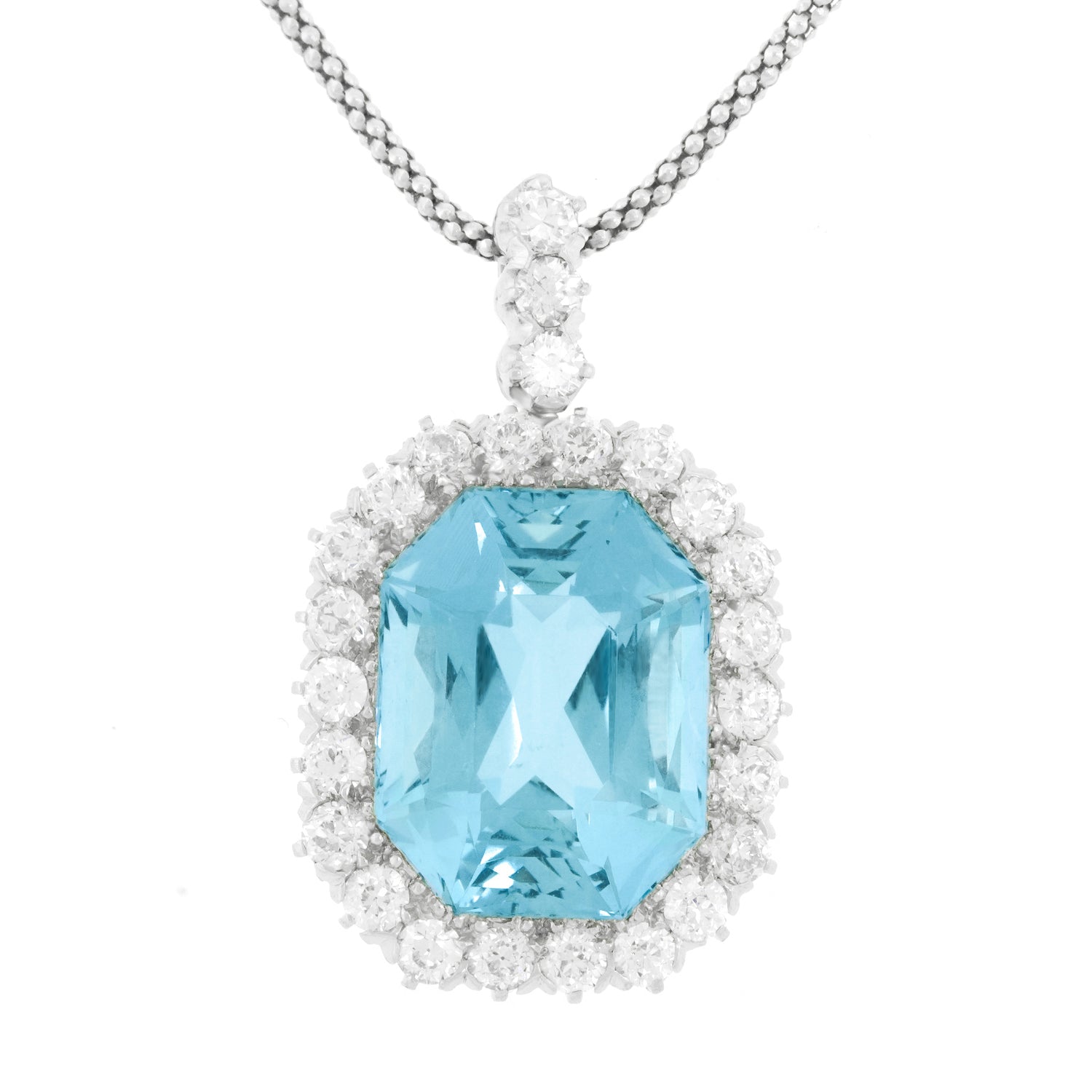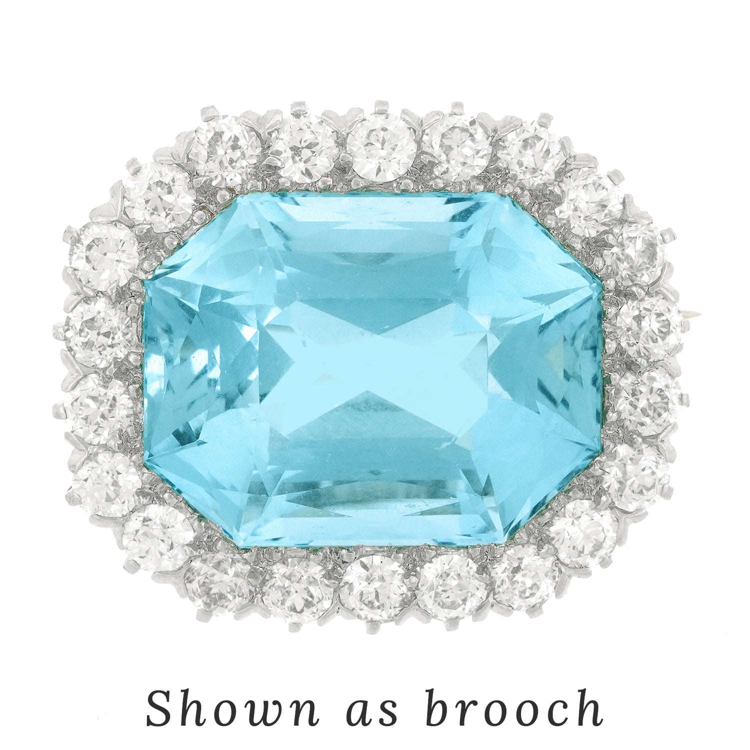 Circa 1910, 18k/Platinum, by Tiffany & Co, New York. Captivating in its elegance, this gorgeous Tiffany & Co. pendant features a 22.0-carat Santa Maria aquamarine, surrounded by 3.0 carats of fine white diamonds (G color and VS clarity). The bale of the pendant is removable and can be replaced by an appliance mounted with a pin stem. Finely crafted in platinum and 18k yellow gold to the highest Tiffany & Co. standard of quality, the look is antique chic at its tasteful and luxurious best. Excellent condition. In our opinion the pin appliance is original and the pendant appliance is a restoration, (we made the tool to change appliances).
