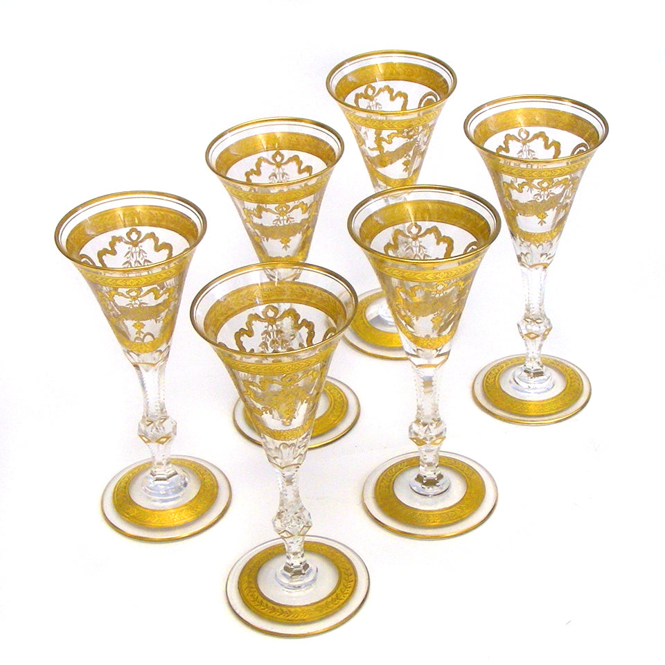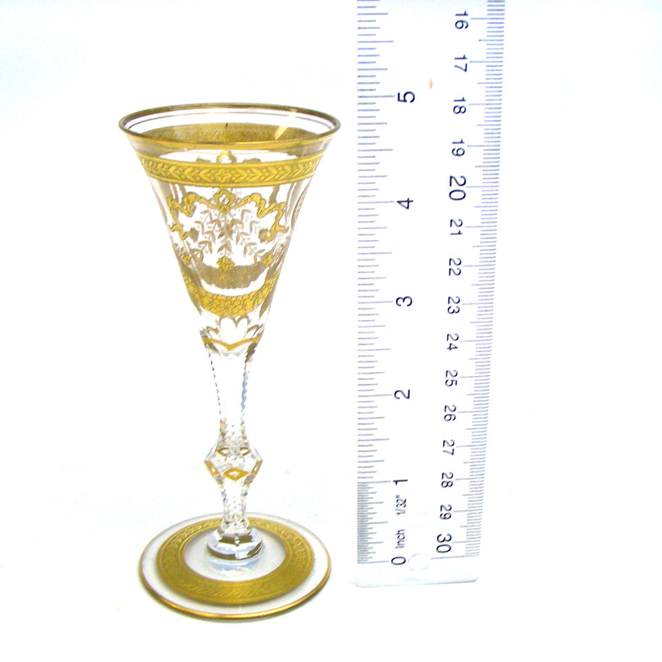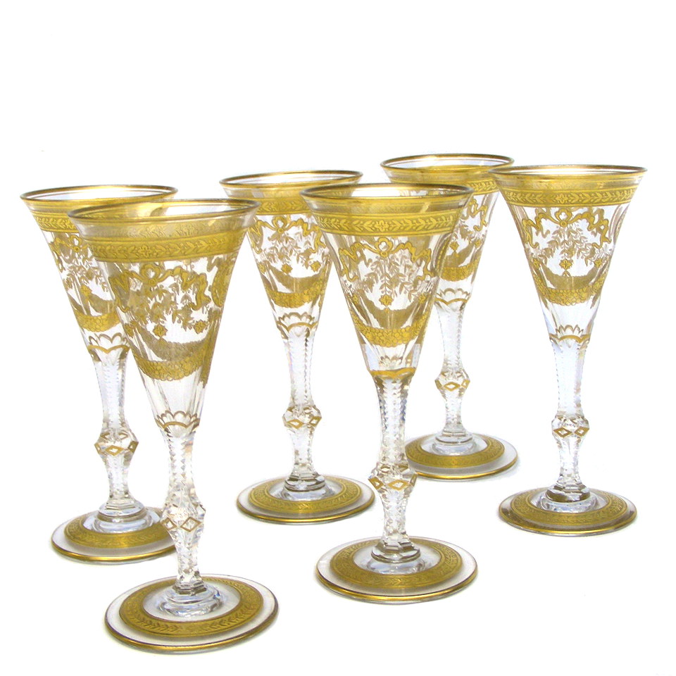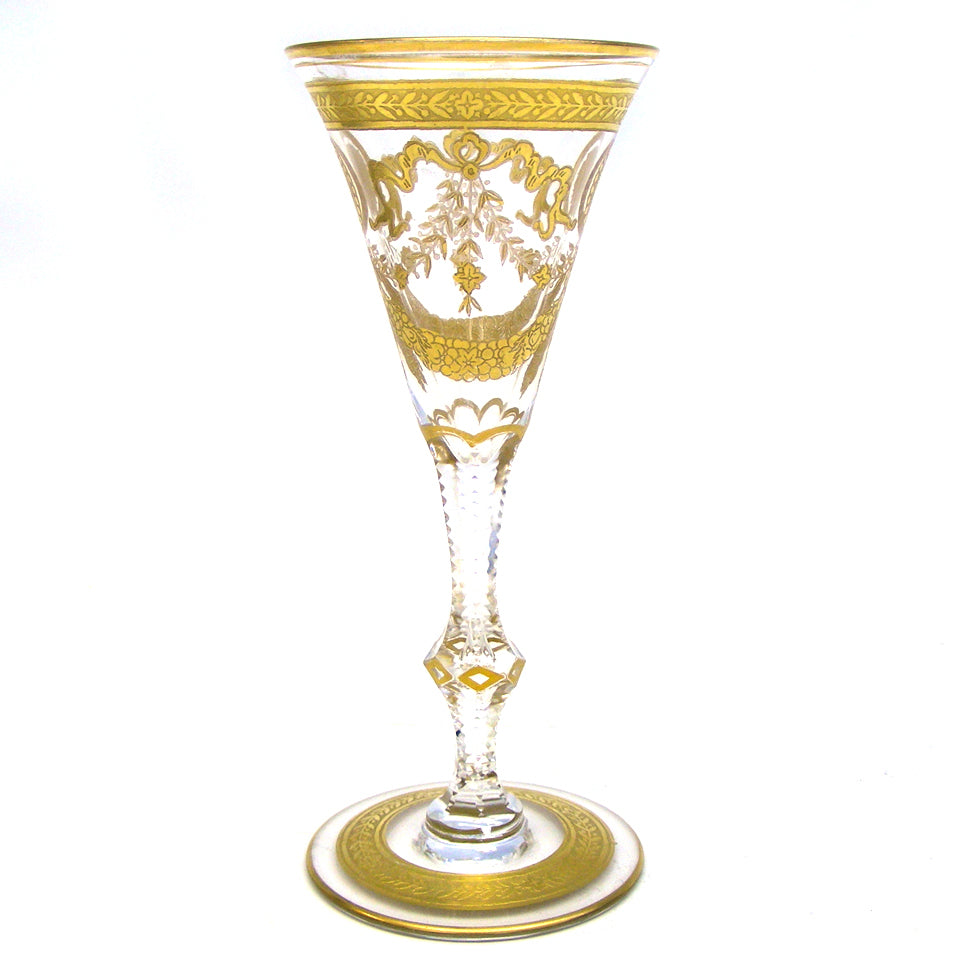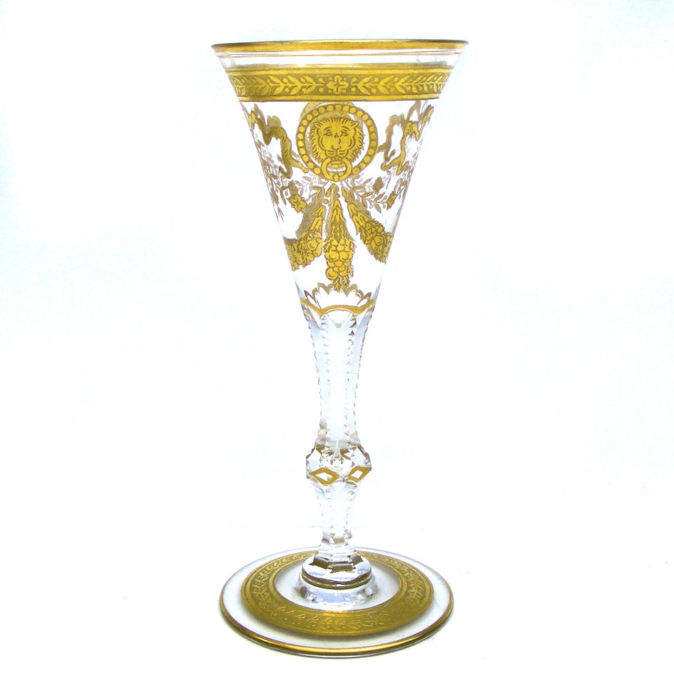 Circa 1930s, St. Louis, France. These splendid glasses come from Saint-Louis, the oldest and one of the most renowned glassmaking companies in Europe. The gilded “Congress” pattern displays an opulent floral swag, ribbons, and a wonderful lion’s head knocker. The cutting work on the stems is precise and crisp. These rare glasses are in excellent condition.