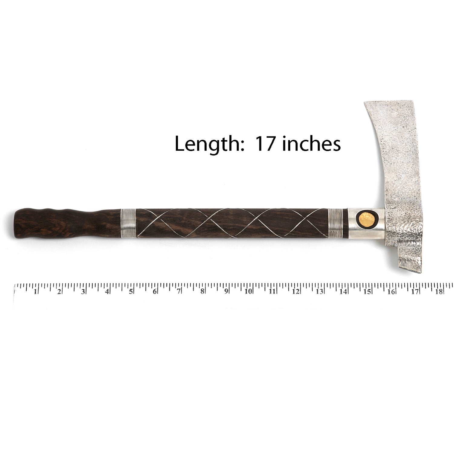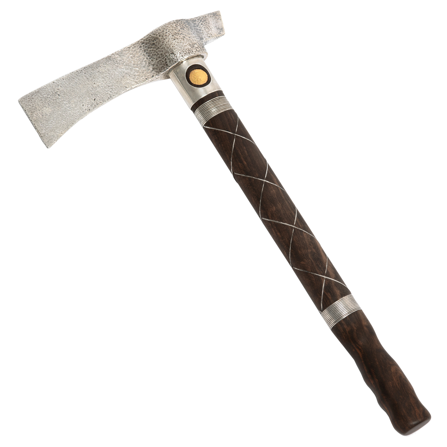 Circa 1920s, Sterling, 22k, American.   A one-of-a-kind objet, this sterling ax was made in the 1920s. Set with a 1925 gold piece, it suggests a tomahawk and is also very similar to Norse axes of the 10th century. We do not who made it or why, sometimes a mystery is good for the soul! Excellent condition.