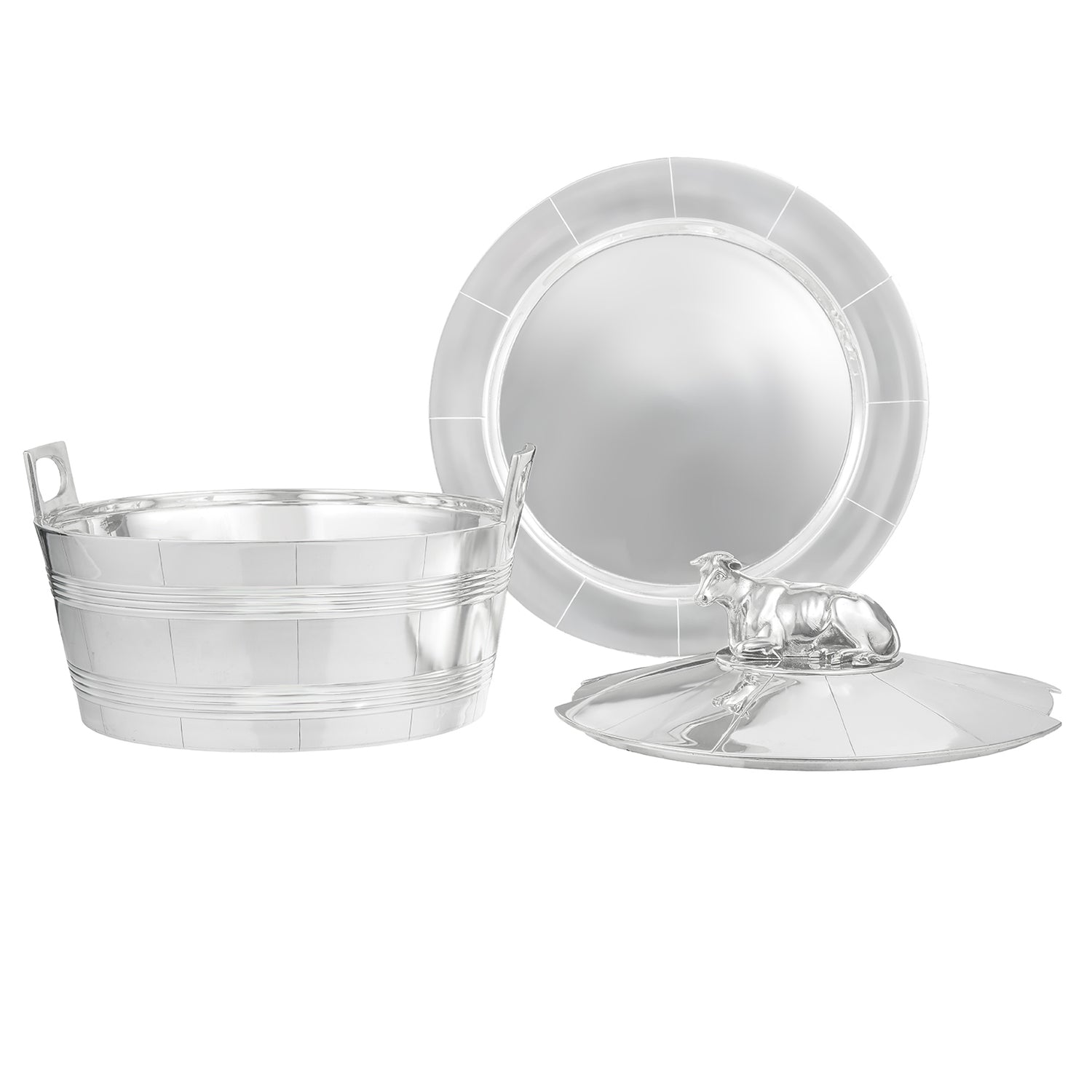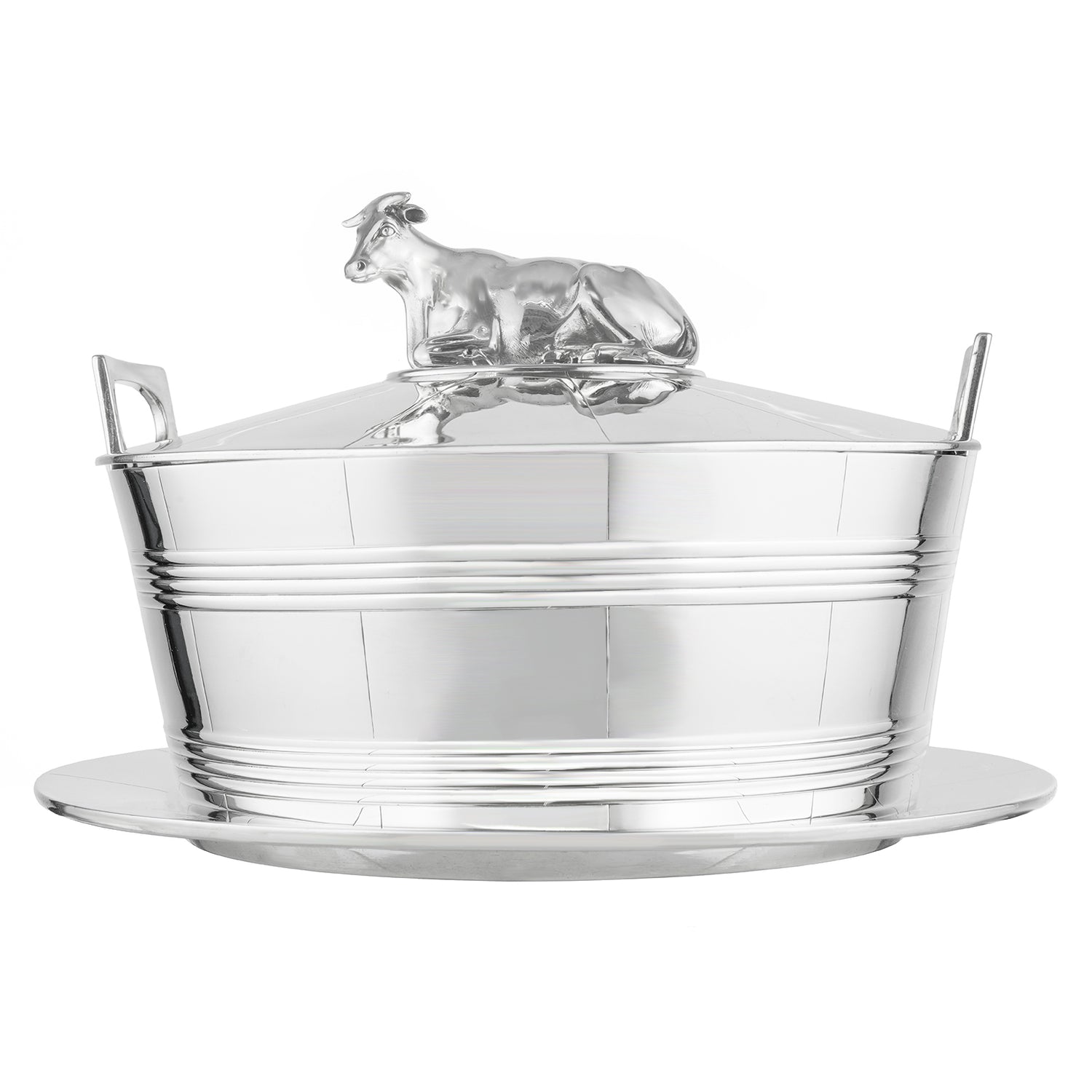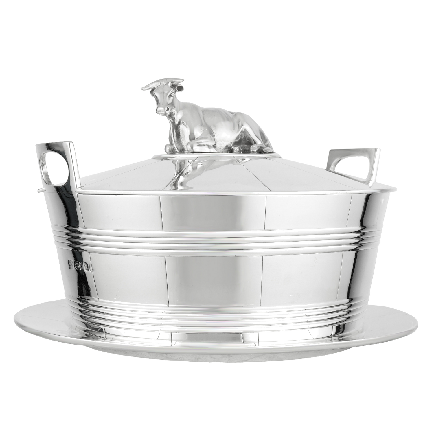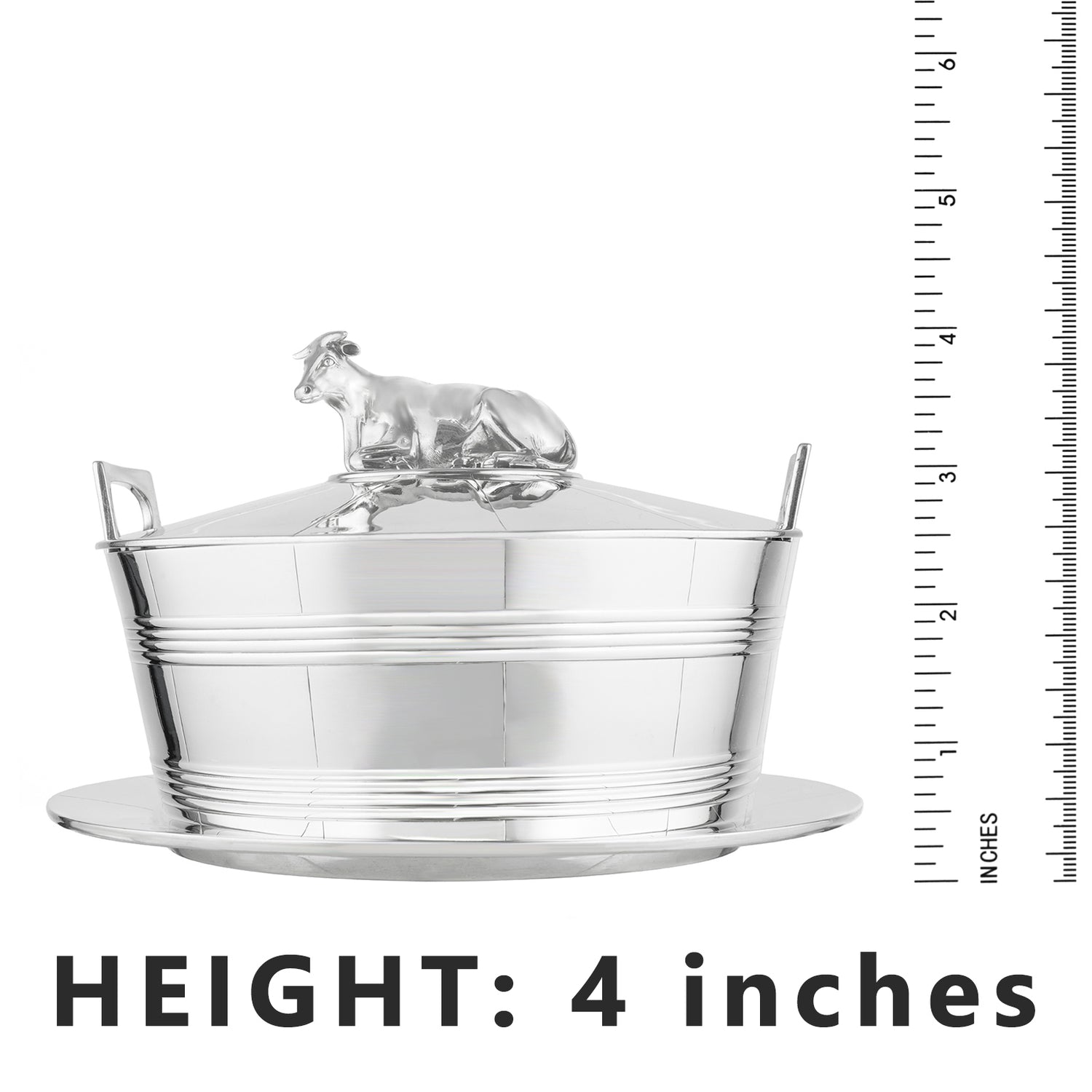 Circa 1837, Sterling, by John, Edward, & William Barnard, London. This fabulous sterling butter dish in the form of a wooden staved water tub sports a lid surmounted by a fine figural cow as well as a matching underplate. The perfect accessory for any table or sideboard, it would be magnificent in the kitchen of an urban farmhouse! Superbly made in Victoria's first year, it is London sterling at its finest. Excellent condition.