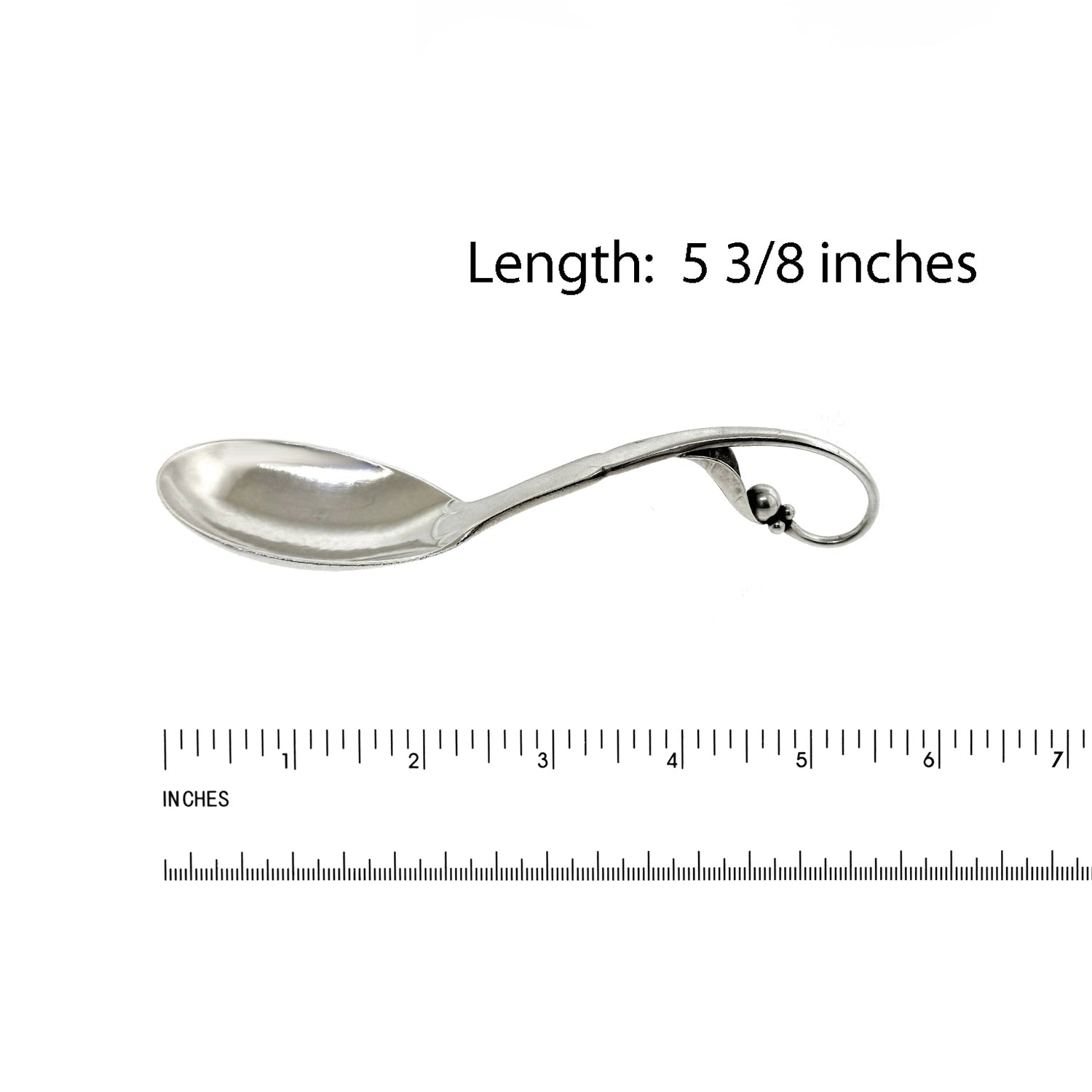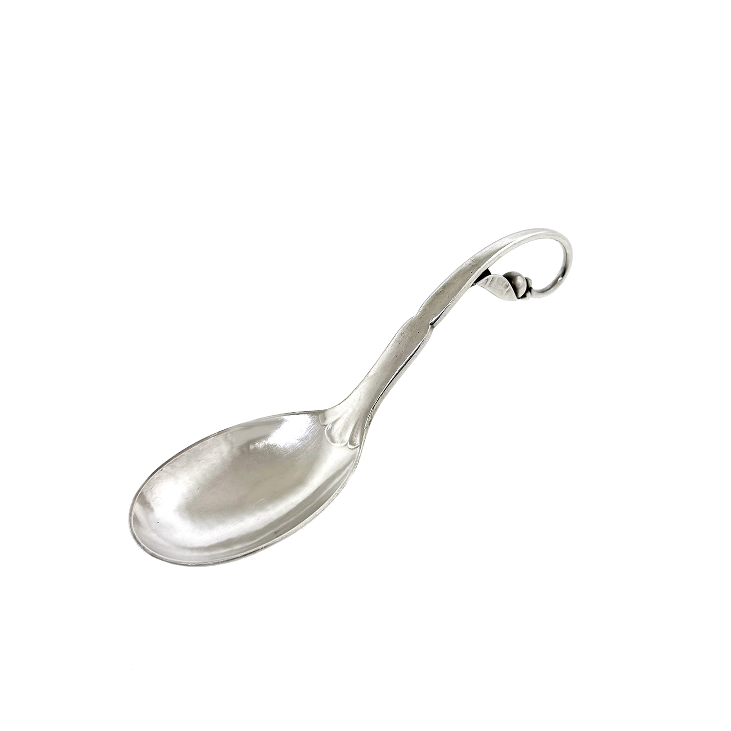 Circa 1920, Sterling, by Georg Jensen, Denmark. This classic pea pod design known as Ornamental #21 pattern jam spoon was made between 1915 and 1918. Excellent condition.