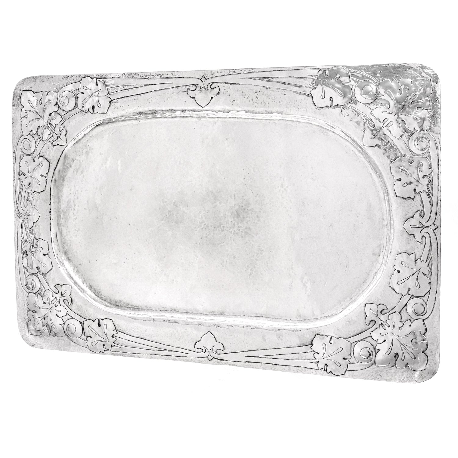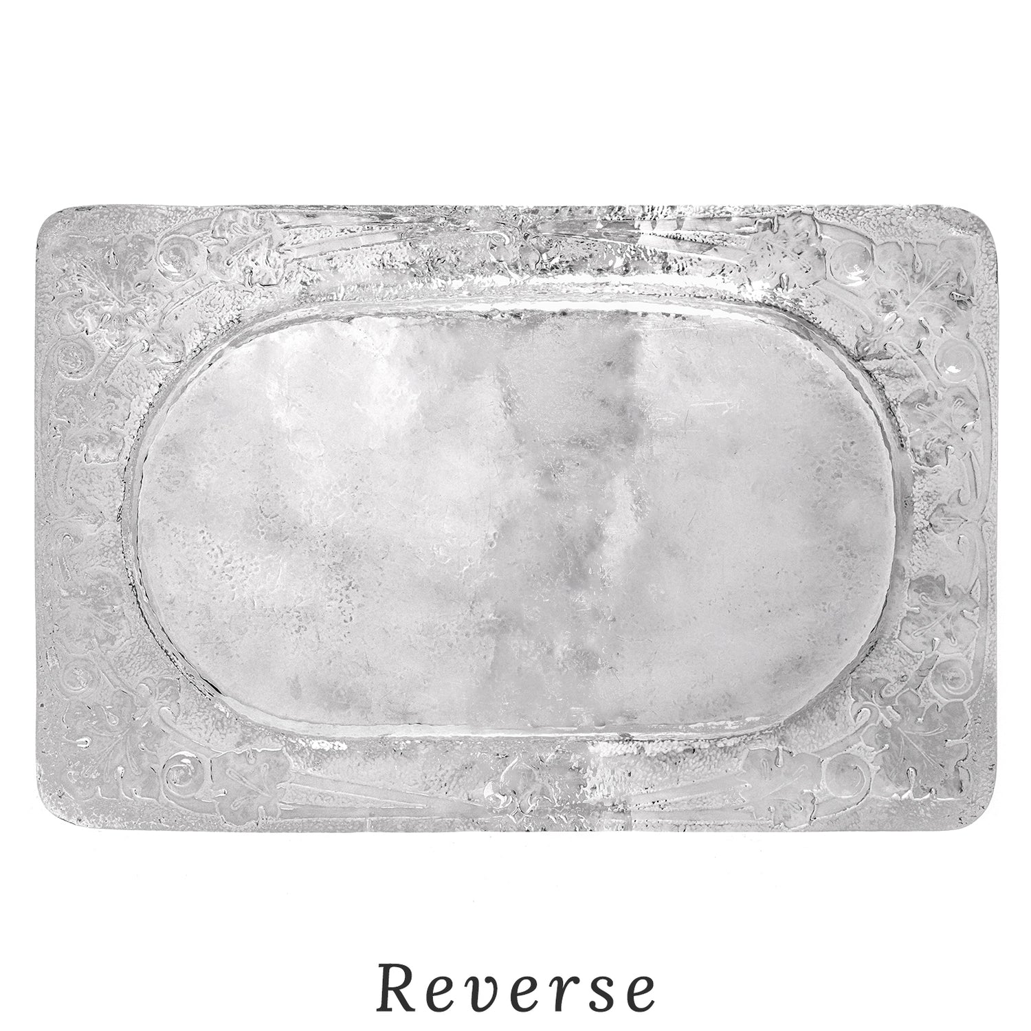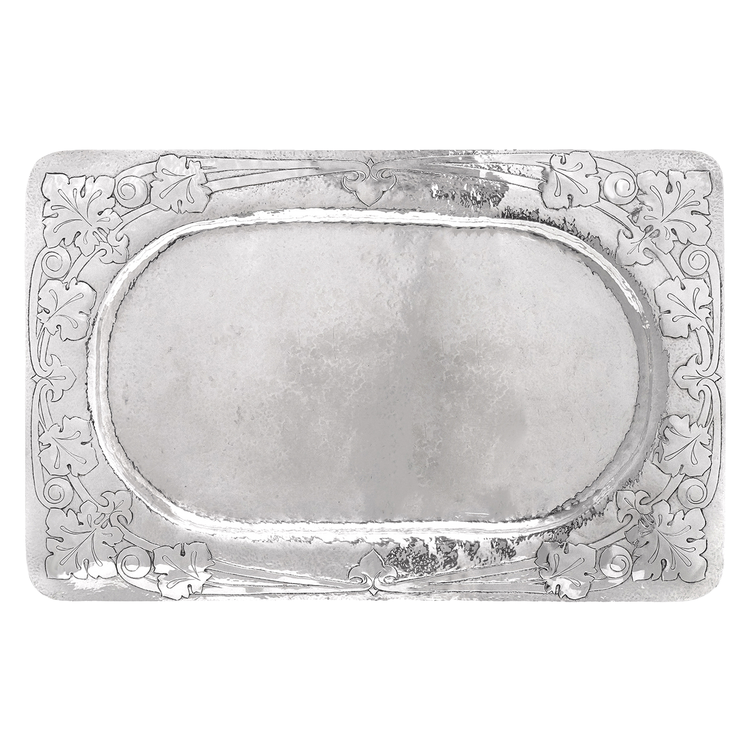 Circa 1890s, Sterling, American. This beautiful sterling Arts & Crafts tray is fully hand-formed with a hammered surface and hand-raised decorations. On display in your dining room or dressing room, this tray is versatile and useful in size. Excellent condition.