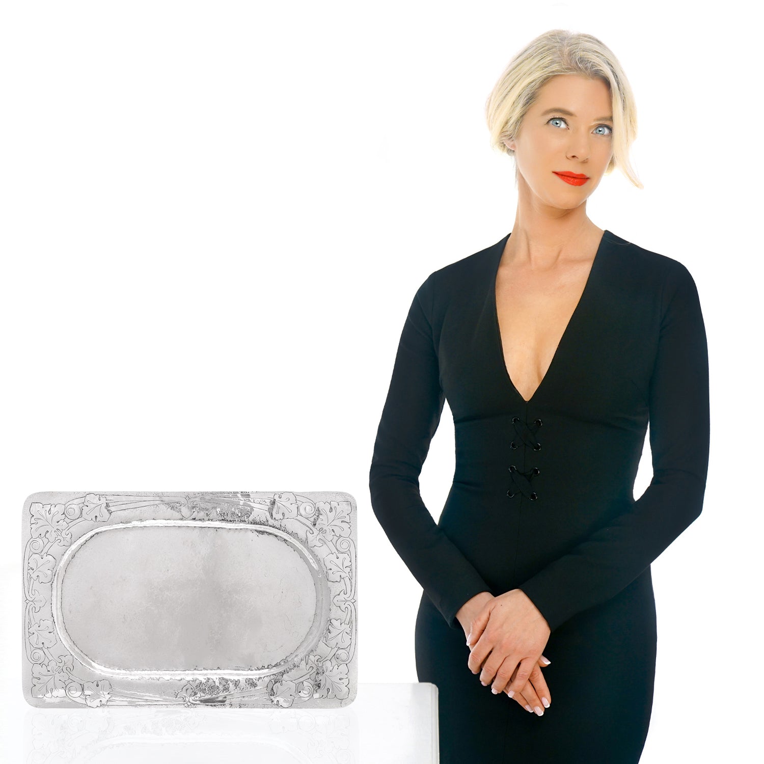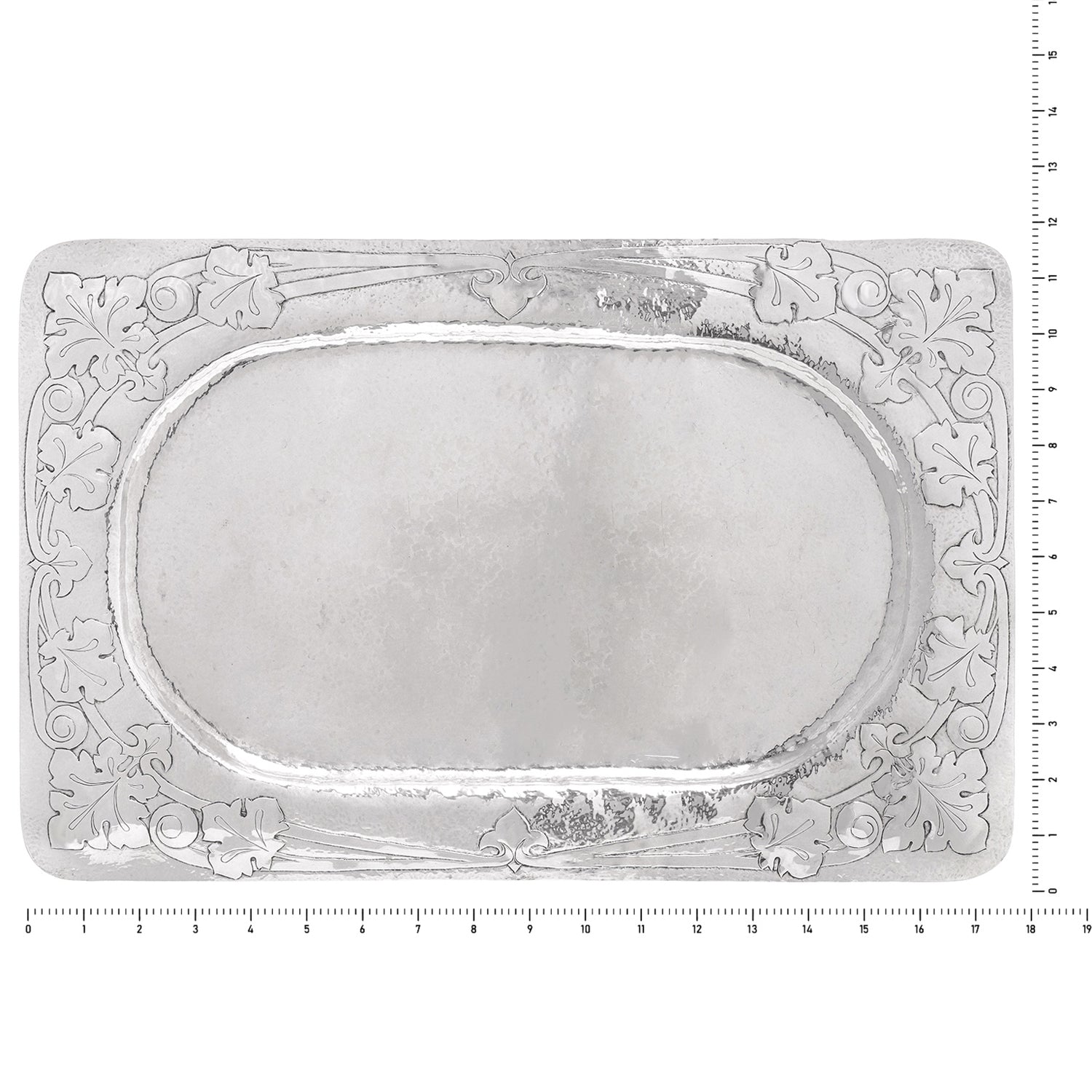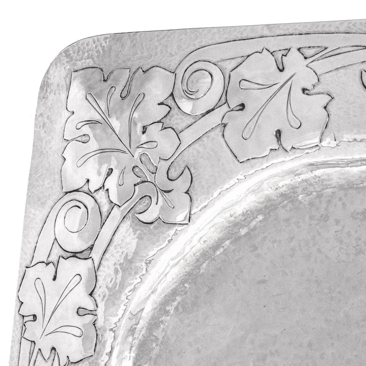Circa 1890s, Sterling, American. This beautiful sterling Arts & Crafts tray is fully hand-formed with a hammered surface and hand-raised decorations. On display in your dining room or dressing room, this tray is versatile and useful in size. Excellent condition.
