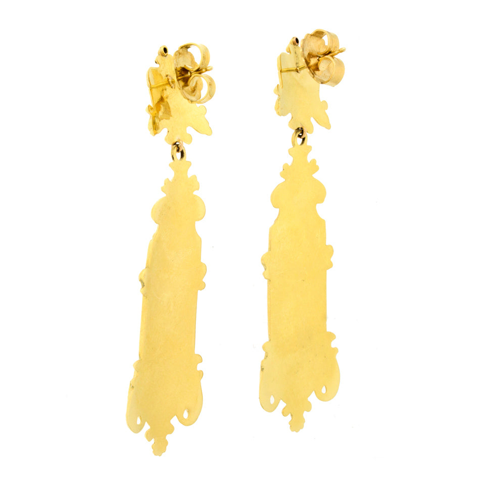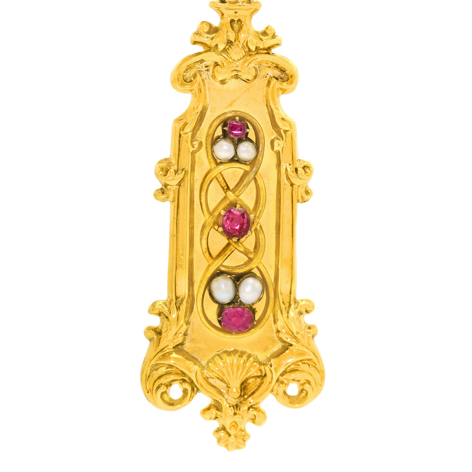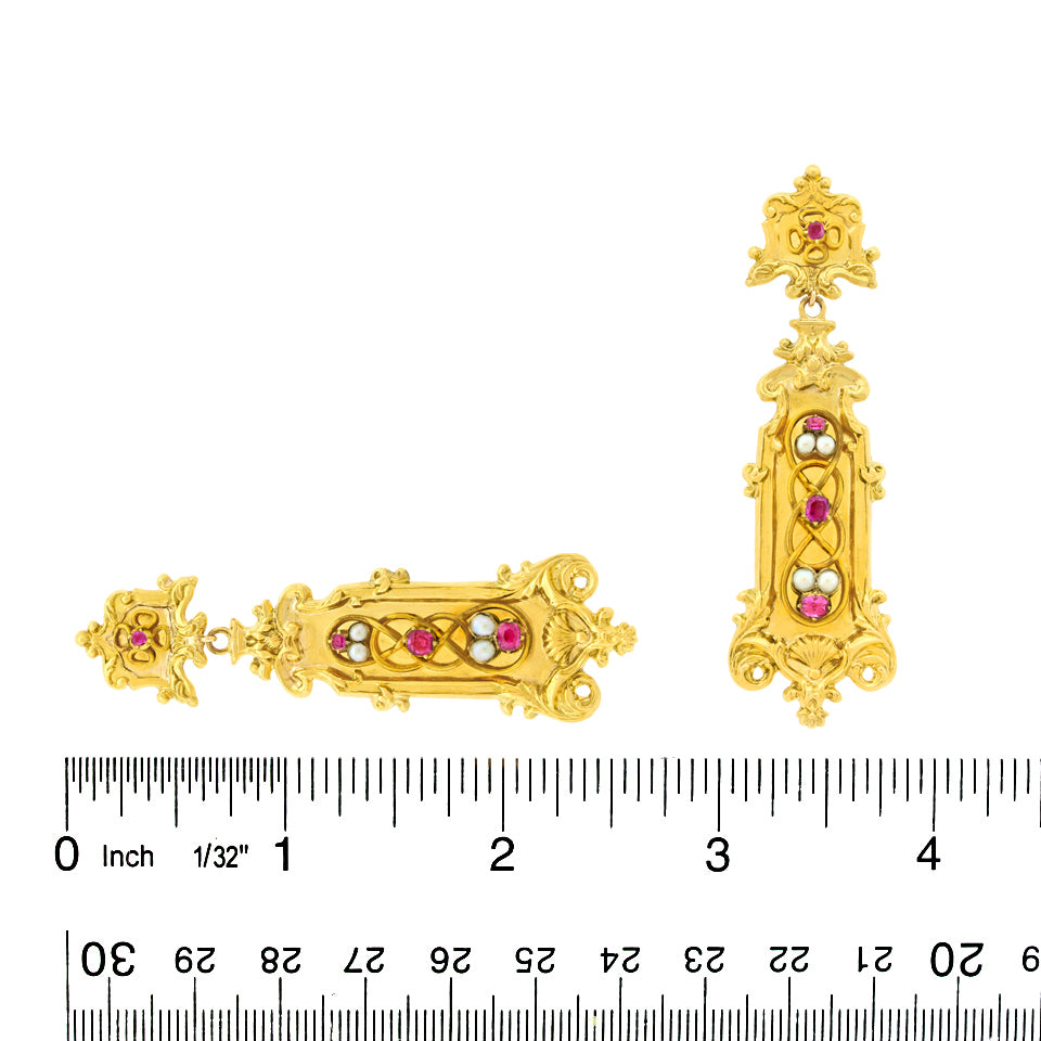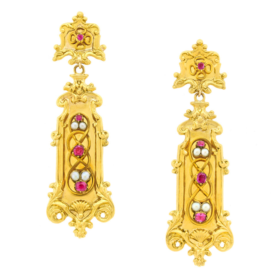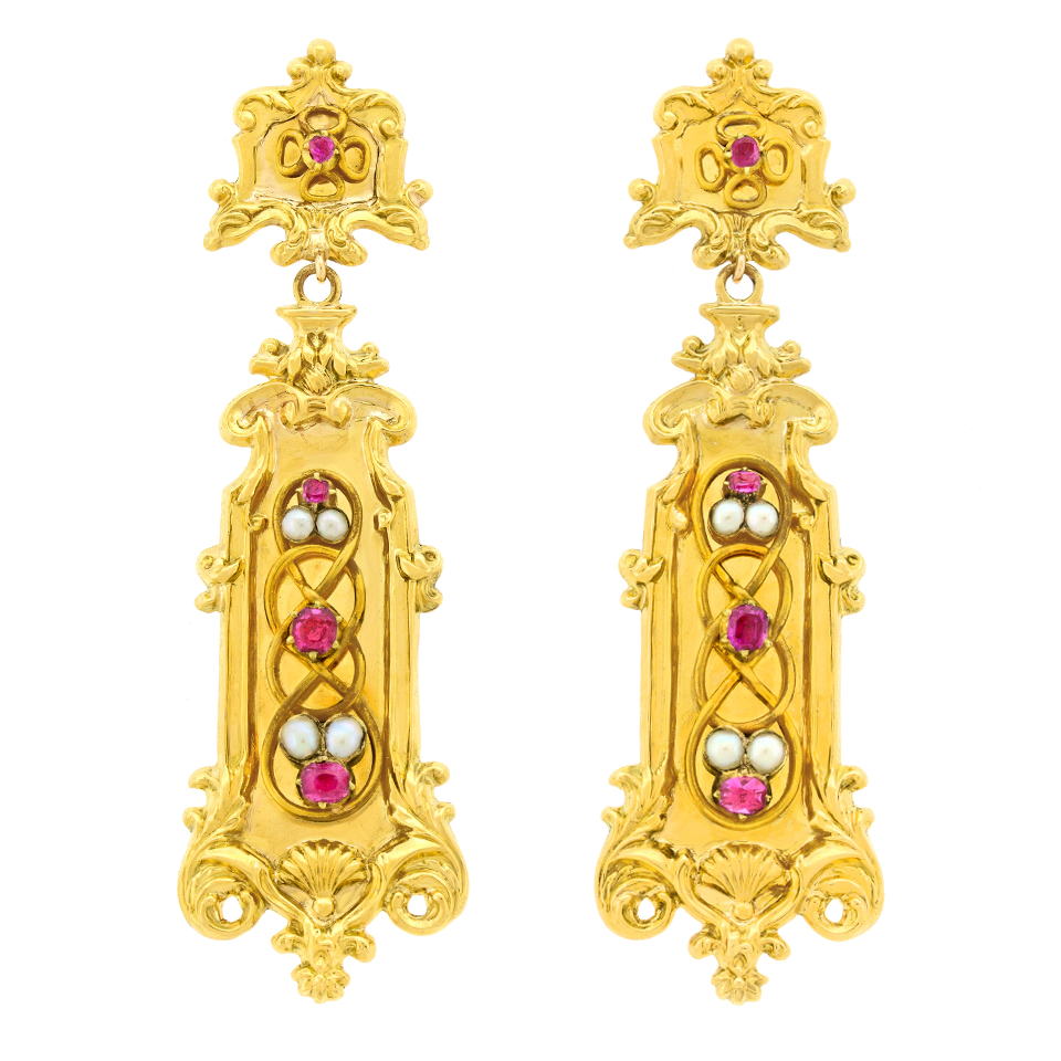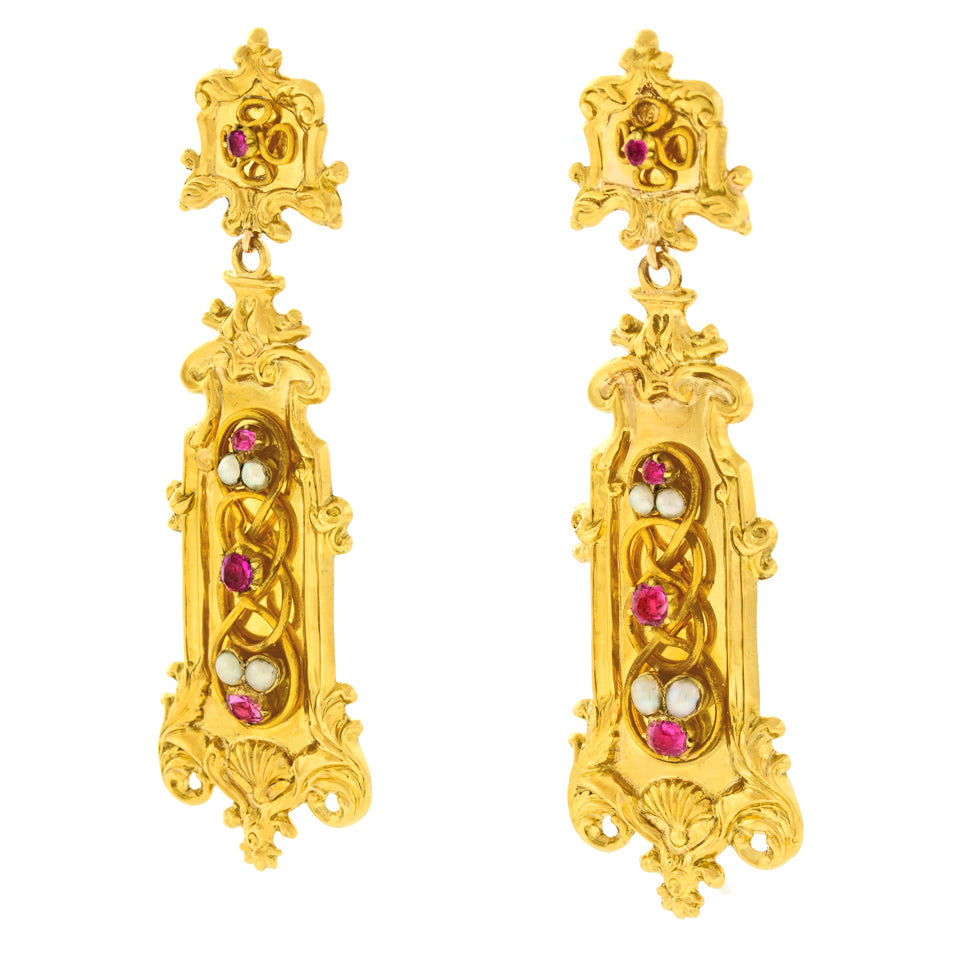 Circa 1860-70s, 18k+ (high karat).  These baroque revival earrings have the pomp and circumstance I love about all things Victorian. Decorated with foliate swags, shells, natural pearls, and pink sapphires, their sumptuous baronial vibe projects an elegant presence and their lively movement is playful and flirty. At just under three inches long, these jewels are well-designed, superbly made, and extravagantly wonderful. Excellent condition.