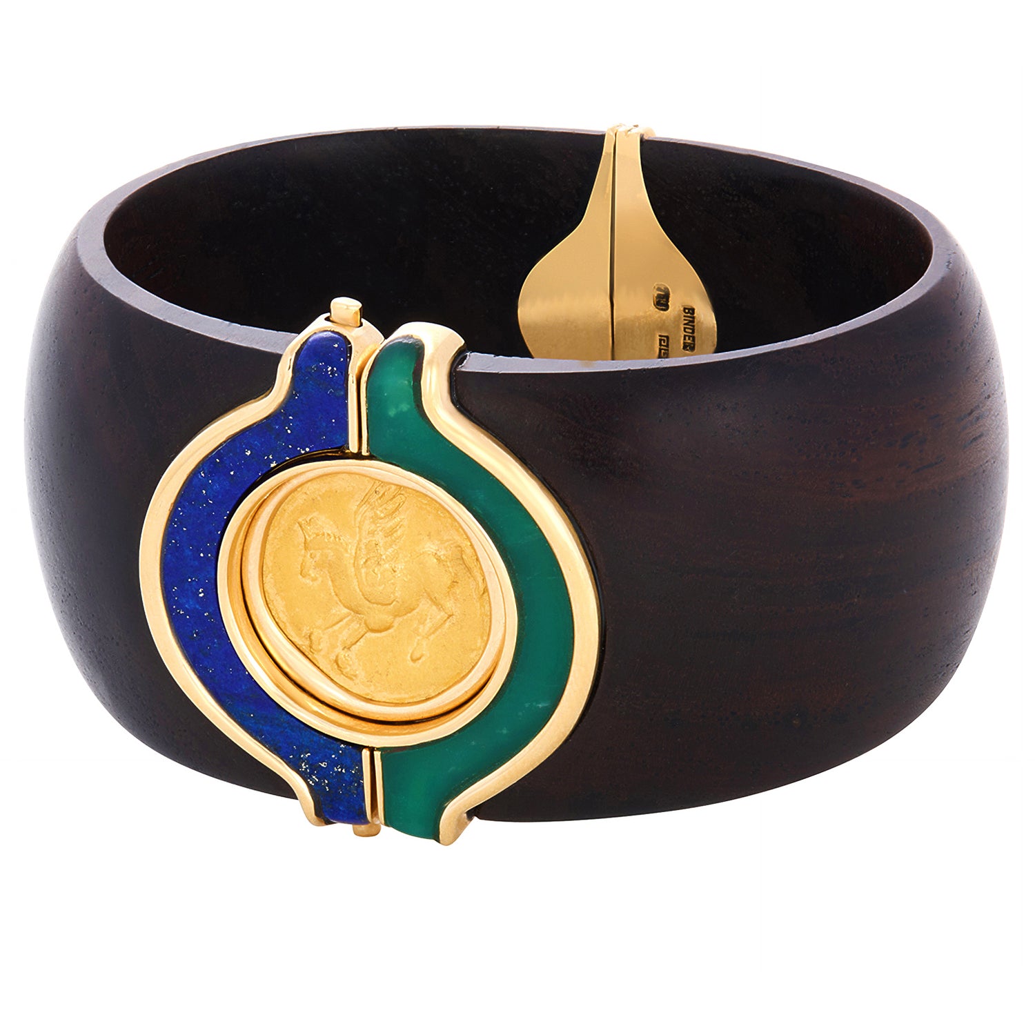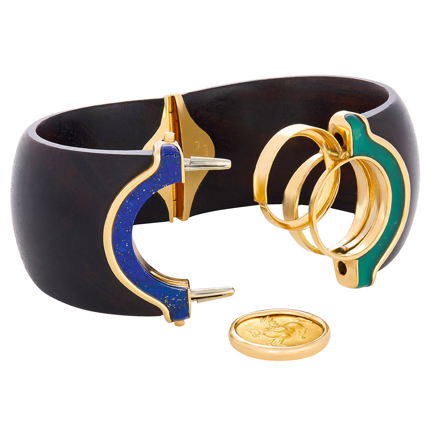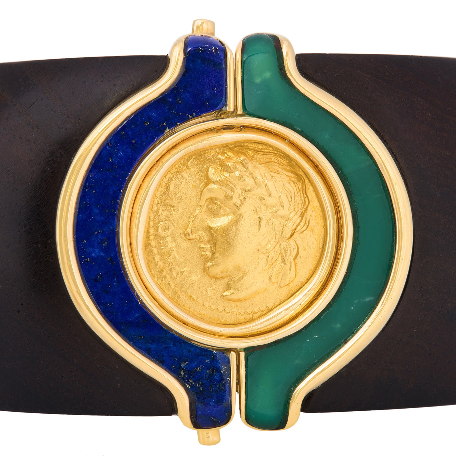 Circa 1970s, 18k, by Paul Binder, Zurich, Switzerland. The juxtaposition of materials, wood, gold, lapis lazuli, green onyx, and an ancient coin creates a fresh, sleek, visual narrative. The look is Swiss Modern, Zurich style. Known for his breathtaking contemporary styling, Paul Binder was renowned as the finest goldsmith of his generation. His dedication to producing only one-of-a-kind pieces, in the Swiss tradition, has left us with a spectacular body of work. Excellent condition.