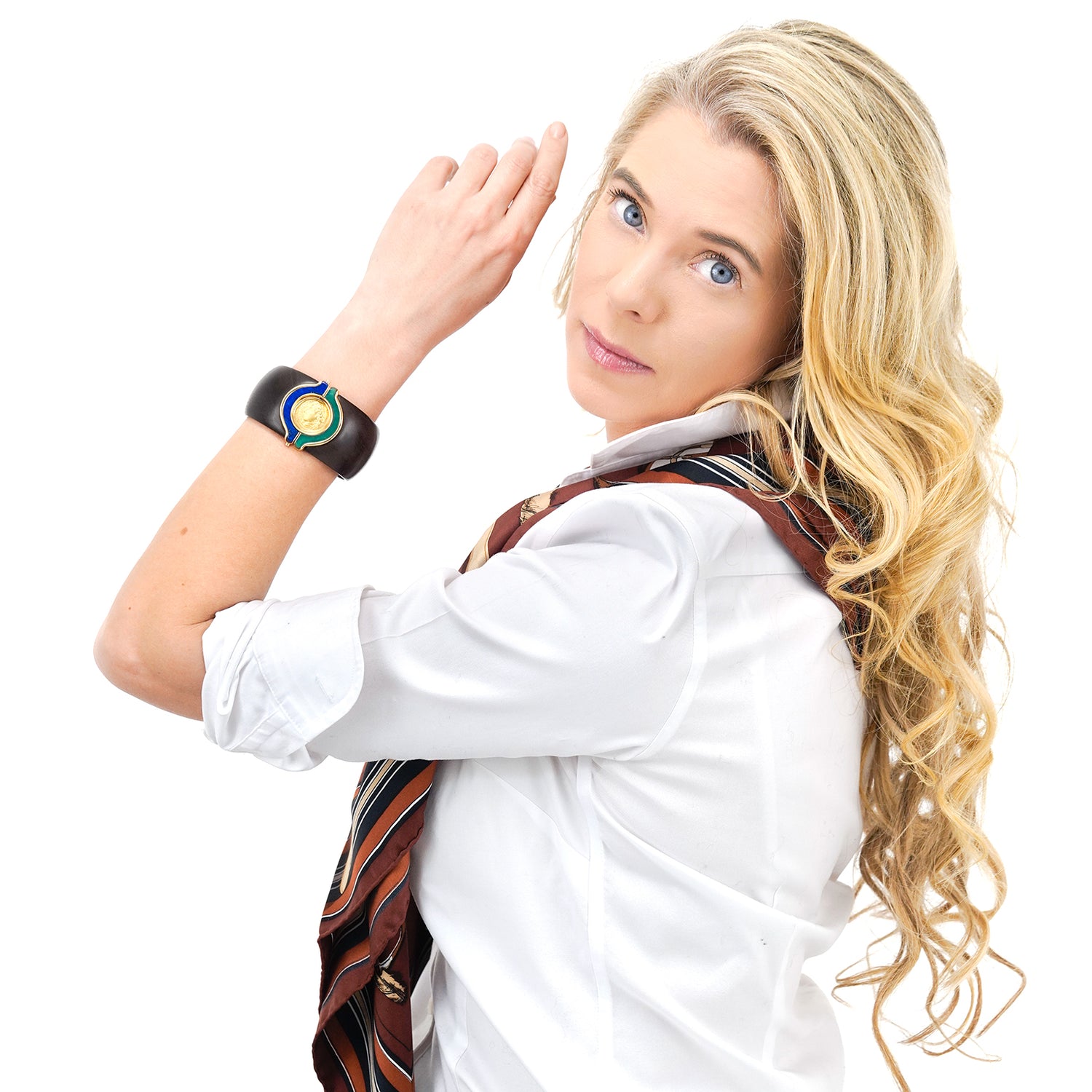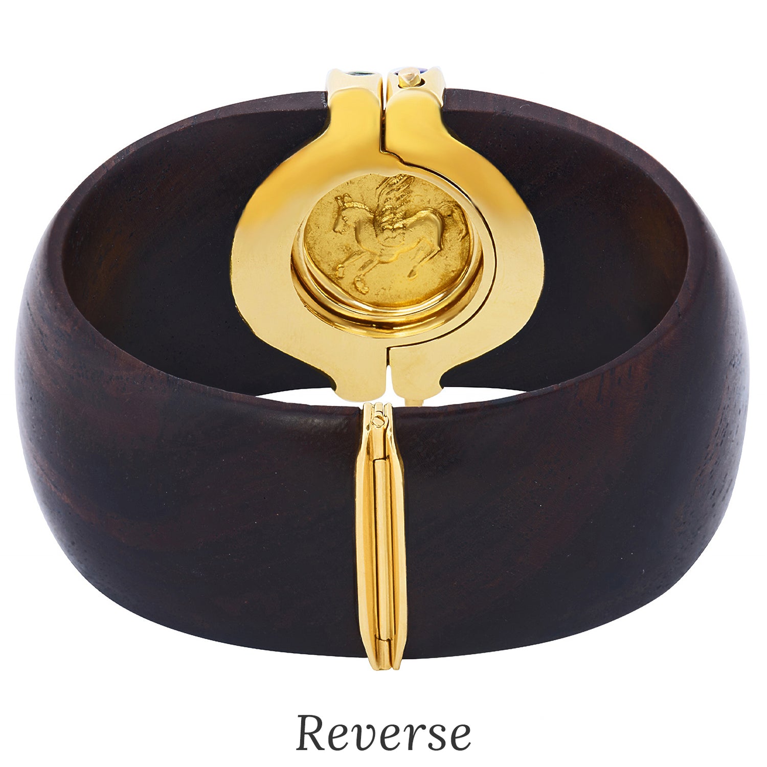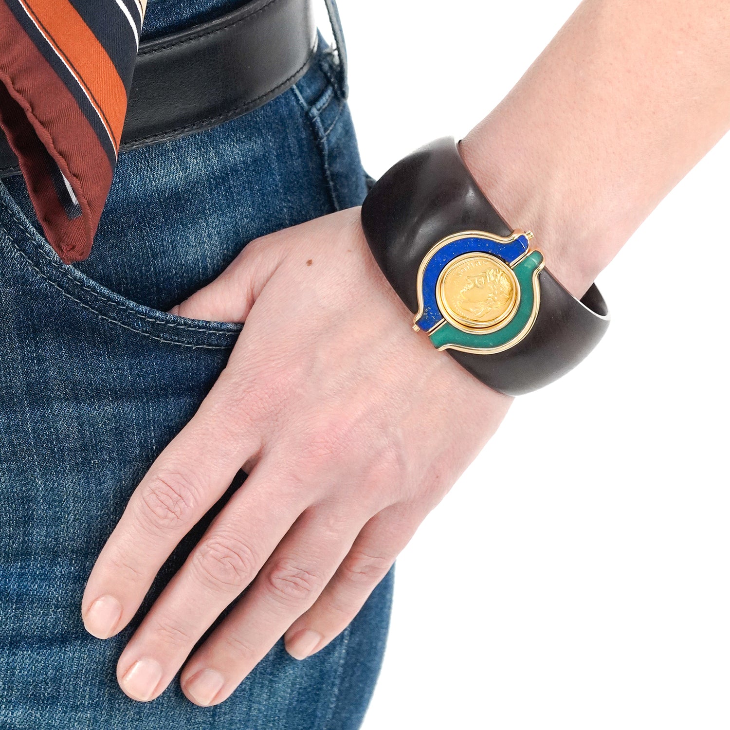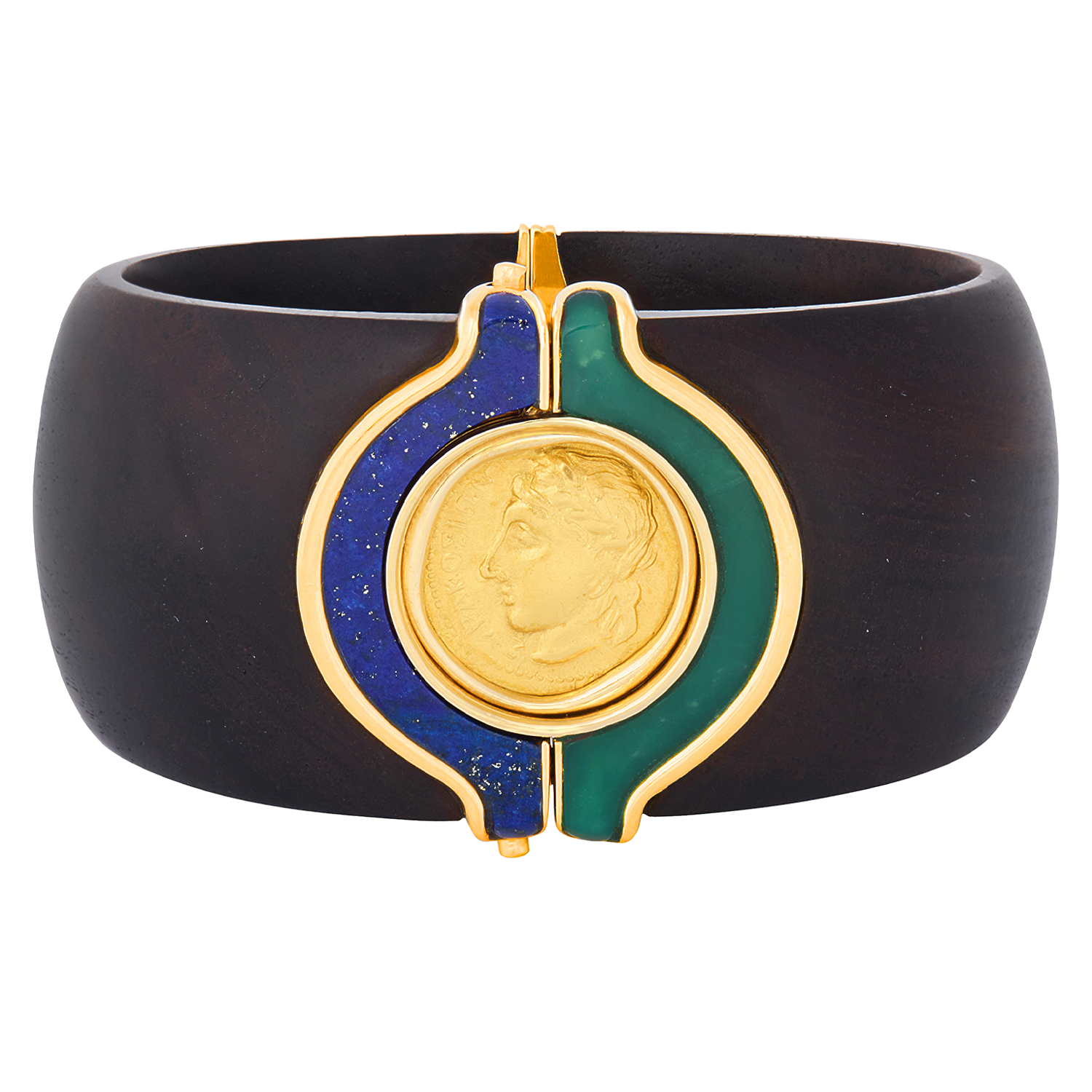 Circa 1970s, 18k, by Paul Binder, Zurich, Switzerland. The juxtaposition of materials, wood, gold, lapis lazuli, green onyx, and an ancient coin creates a fresh, sleek, visual narrative. The look is Swiss Modern, Zurich style. Known for his breathtaking contemporary styling, Paul Binder was renowned as the finest goldsmith of his generation. His dedication to producing only one-of-a-kind pieces, in the Swiss tradition, has left us with a spectacular body of work. Excellent condition.