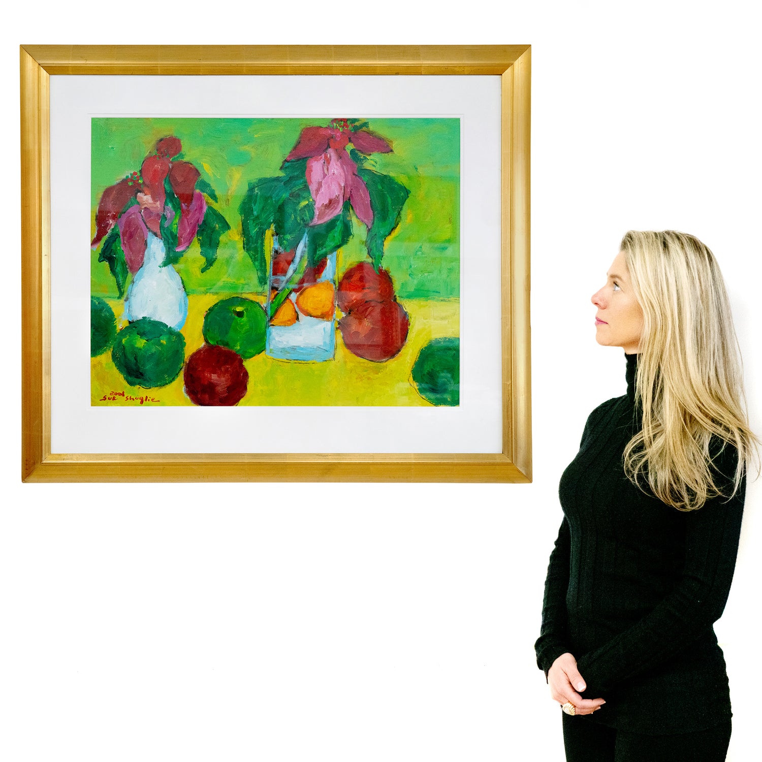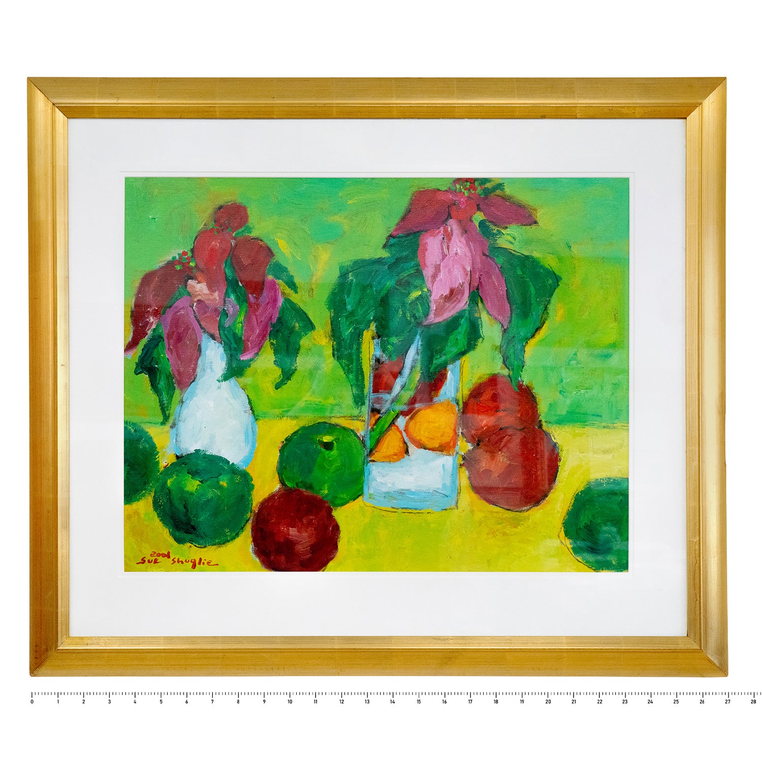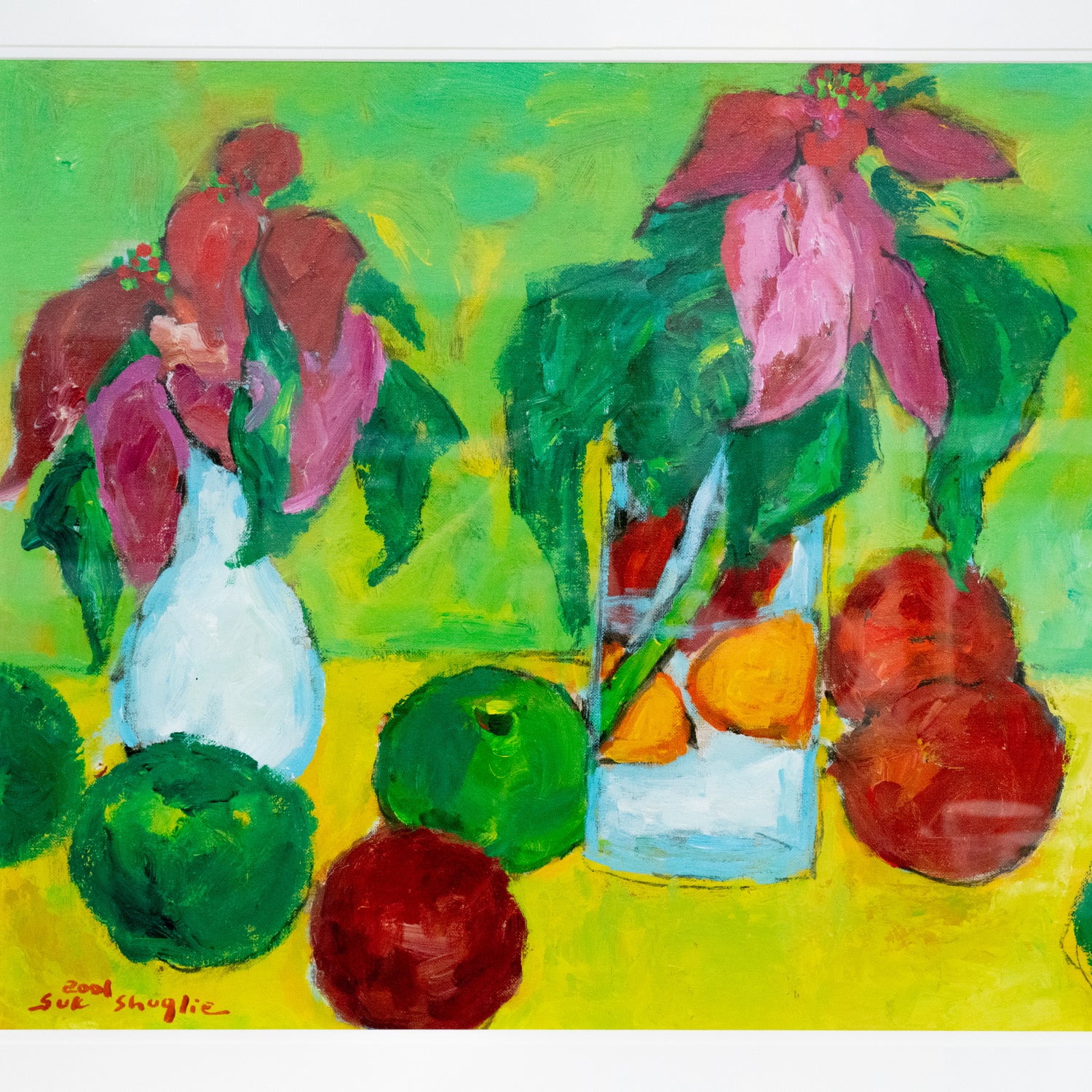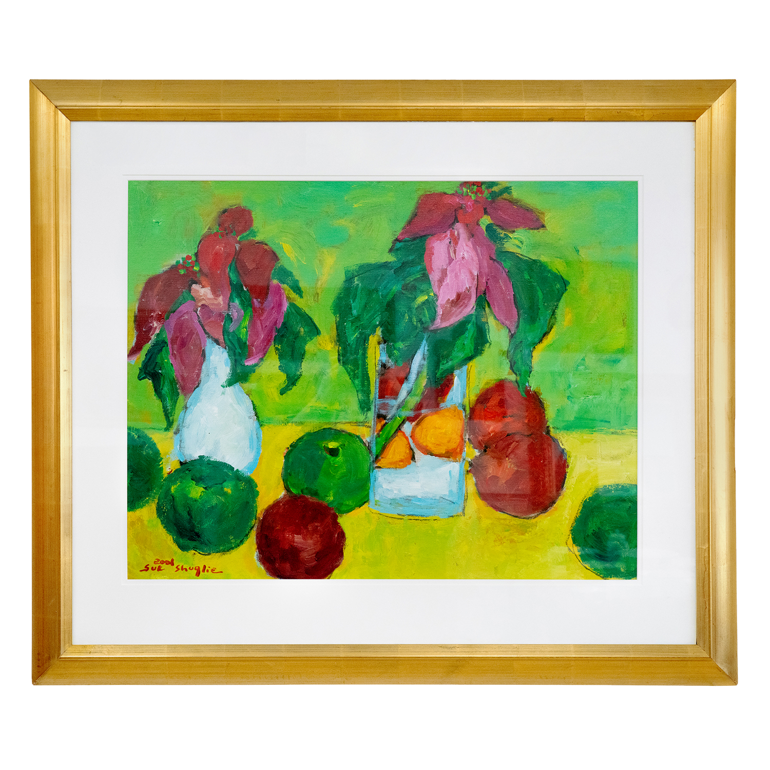 Circa 2001, Acrylic on "Canvas on board", by Suk Shuglie,  Pennsylvania.   Colorful and bright, this insouciant still life by Pennsylvania artist Suk Shuglie is titled "Poinsettias and Apples". Born on a farm in rural Korea, Suk Shuglie came to America in 1980 where she studied and painted with distinction, earning regional and international recognition for her work.  A particularly large example of her work, this painting is an acrylic on canvas board. It is signed lower left "Suk Shuglie 2001", artist's label on the reverse. Excellent condition.