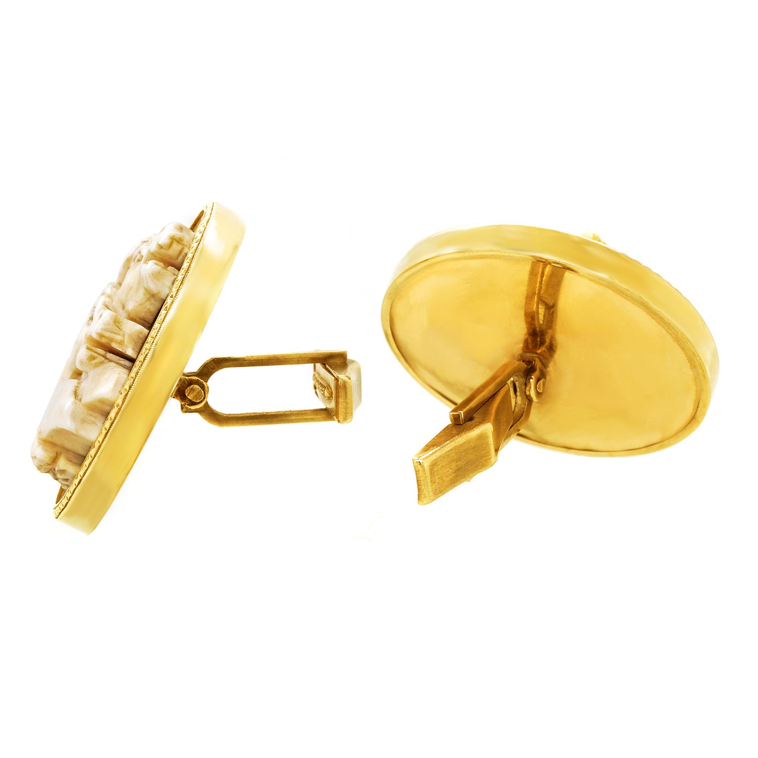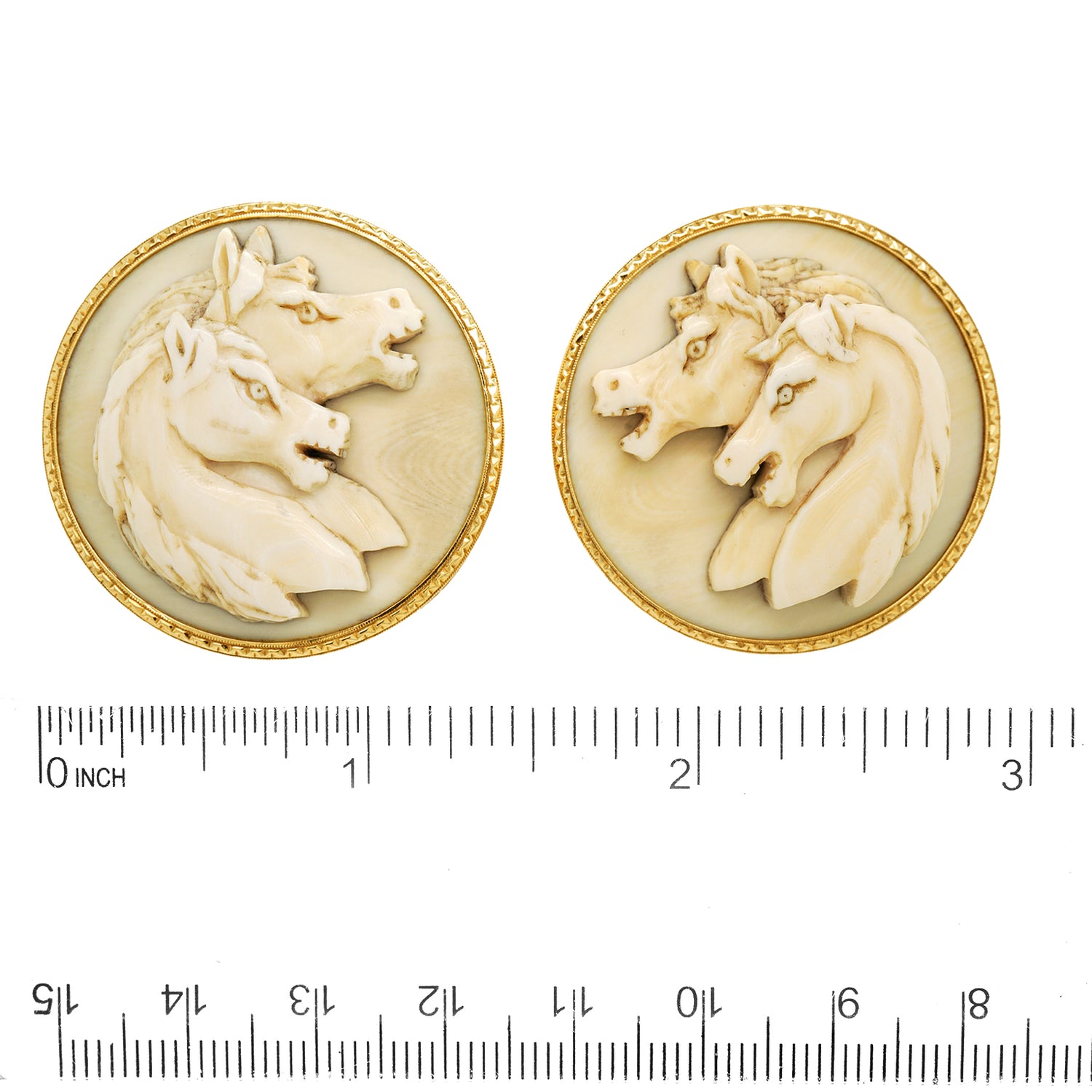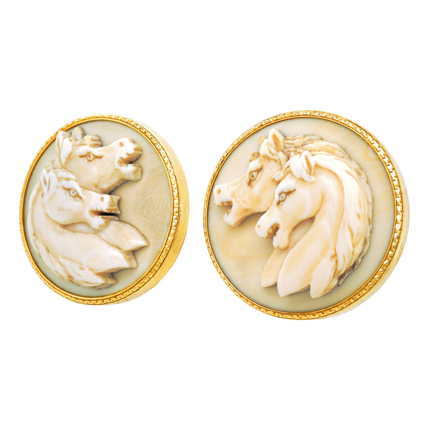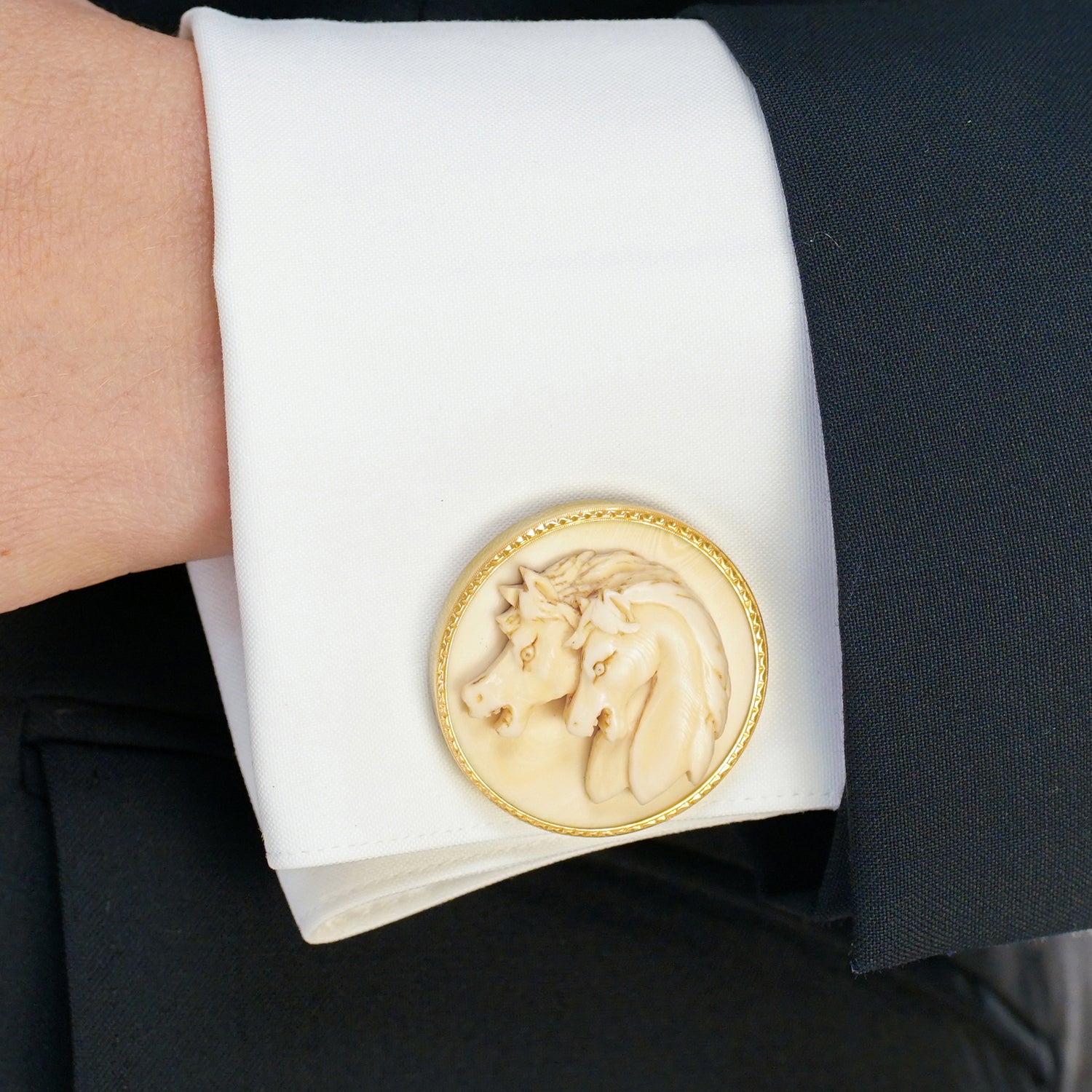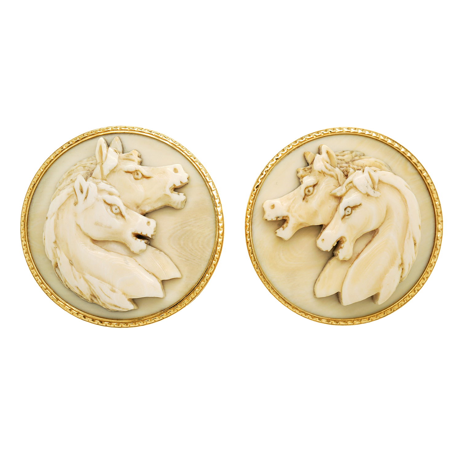 Circa 1960s, 14k, American. Decorated with what are clearly Japanese warhorses, these 14k gold cufflinks combine our fascination with all things Japanese with all things equine. Fabulously oversized with beautiful bone carvings, they are well-made and in excellent condition.