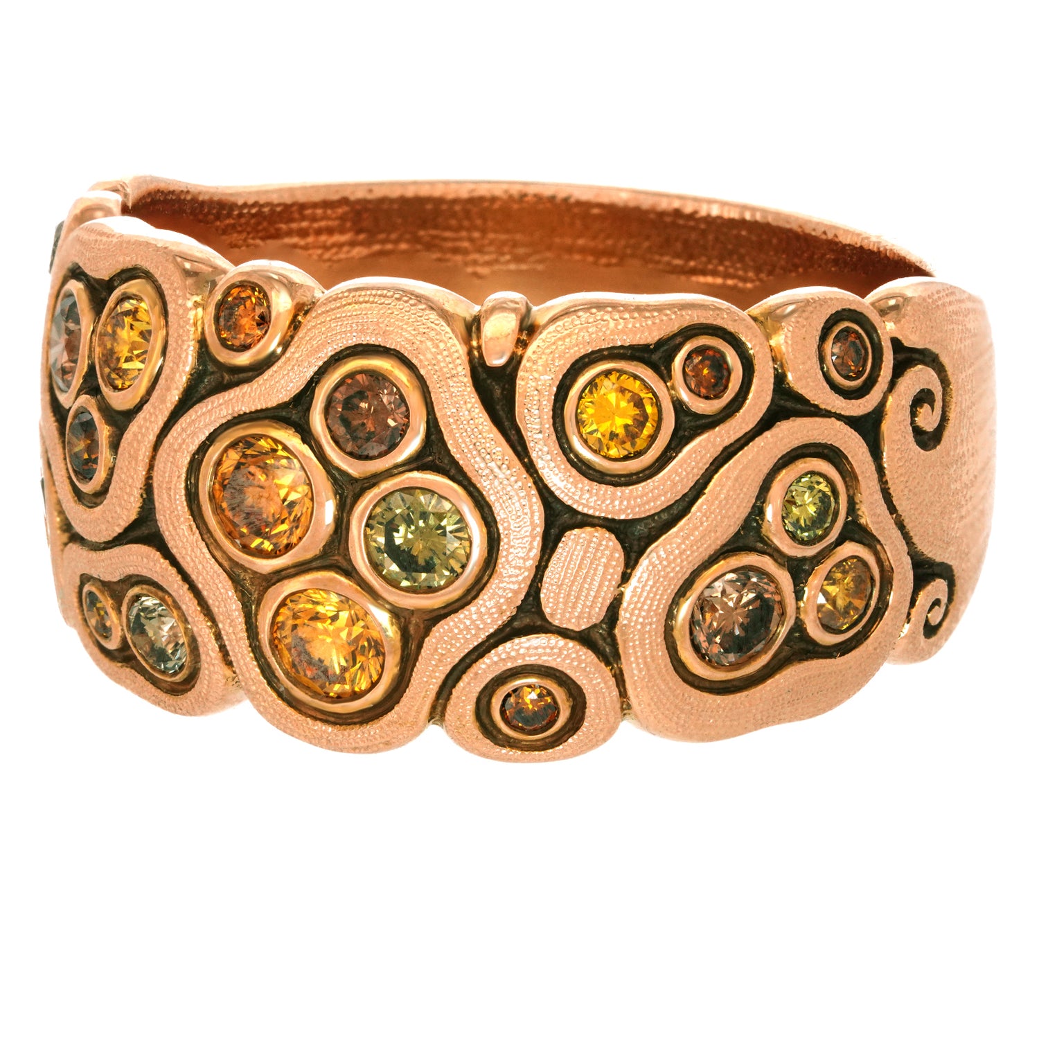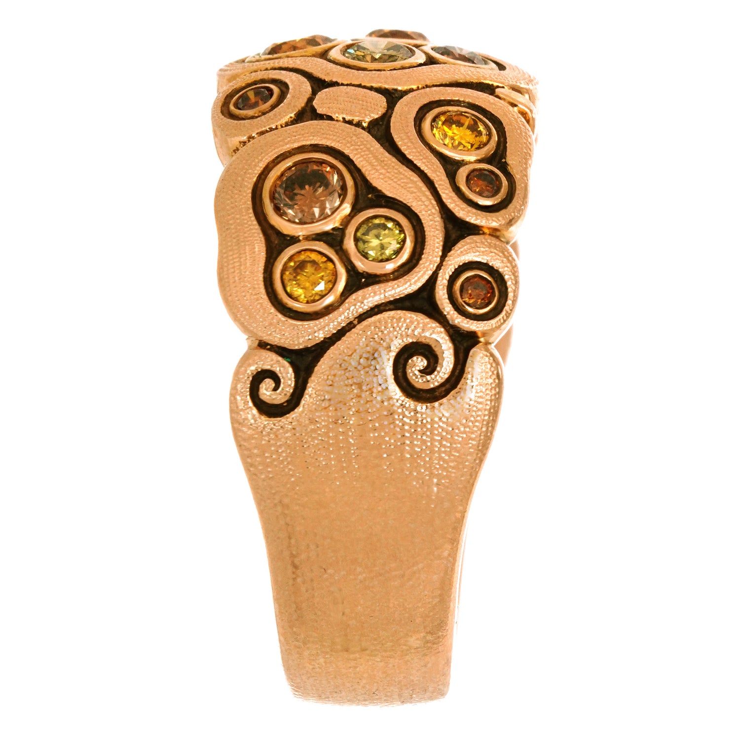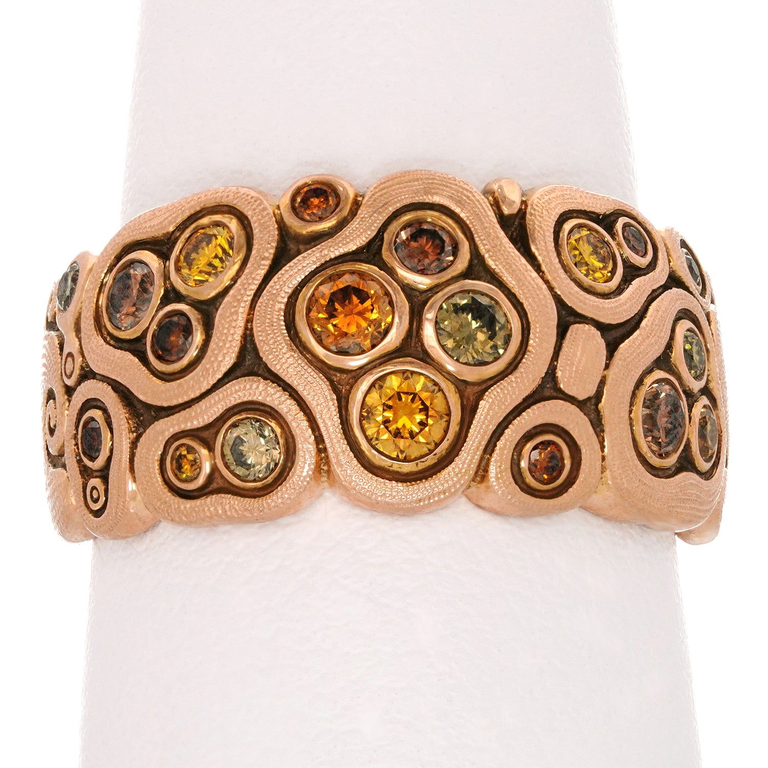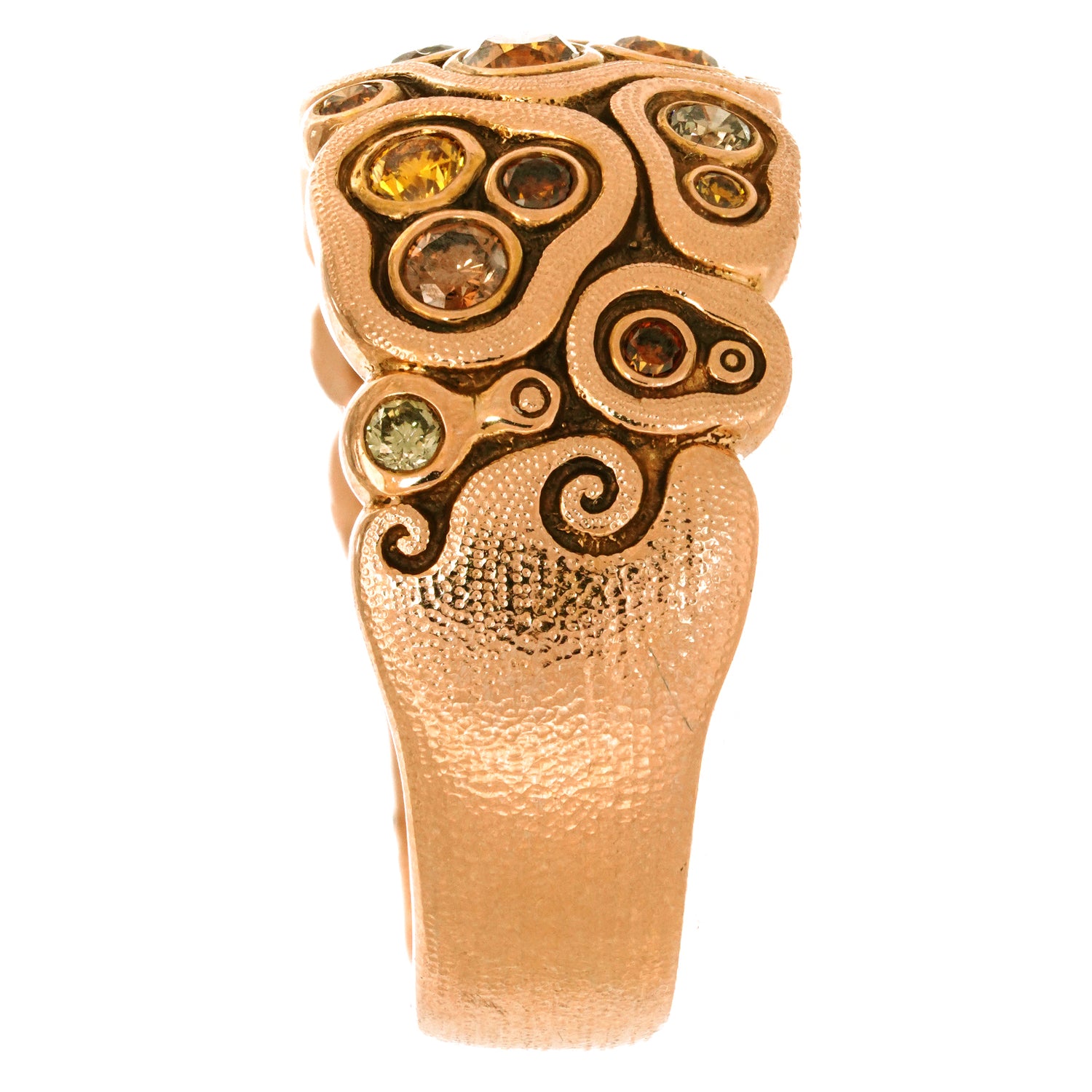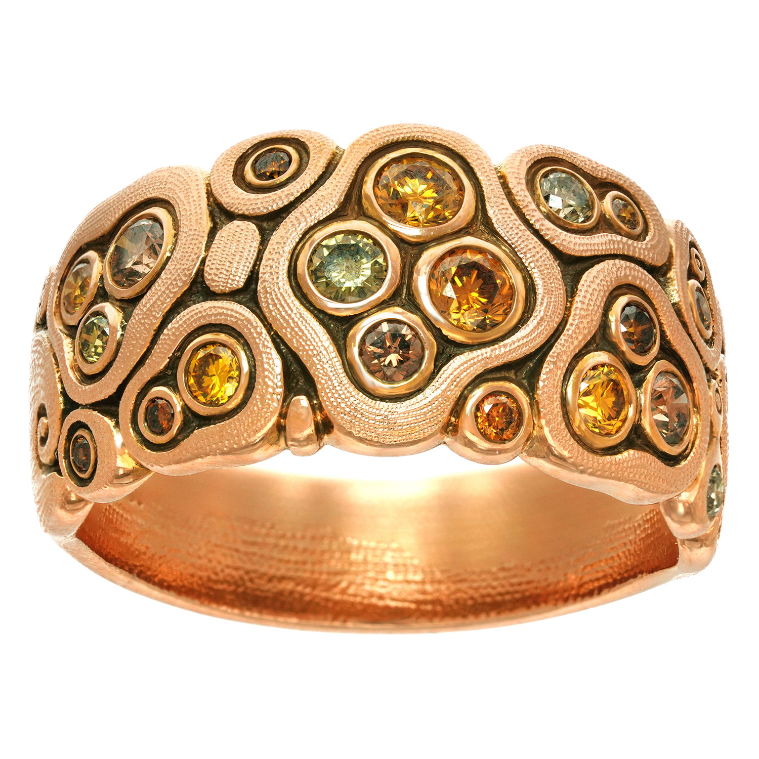 Circa 2000s, 18k, by Alex Sepkus, American. This gorgeous "Swirling Waters" ring by Alex Sepkus has a stunning visual narrative. Set with .50 carats of rich fancy colored diamonds, the look is a technicolor candy store dream. Well-made in warm eighteen-karat gold, this ring is in excellent condition.
