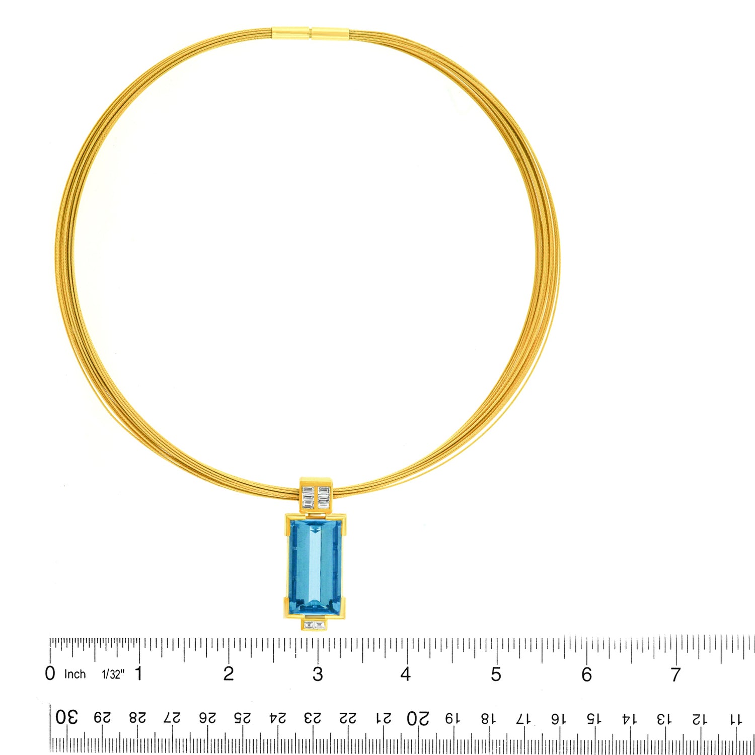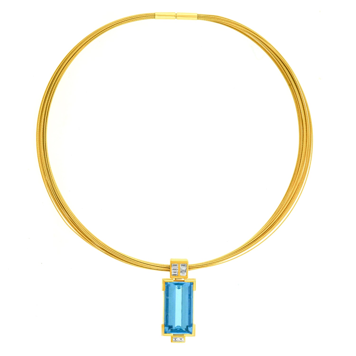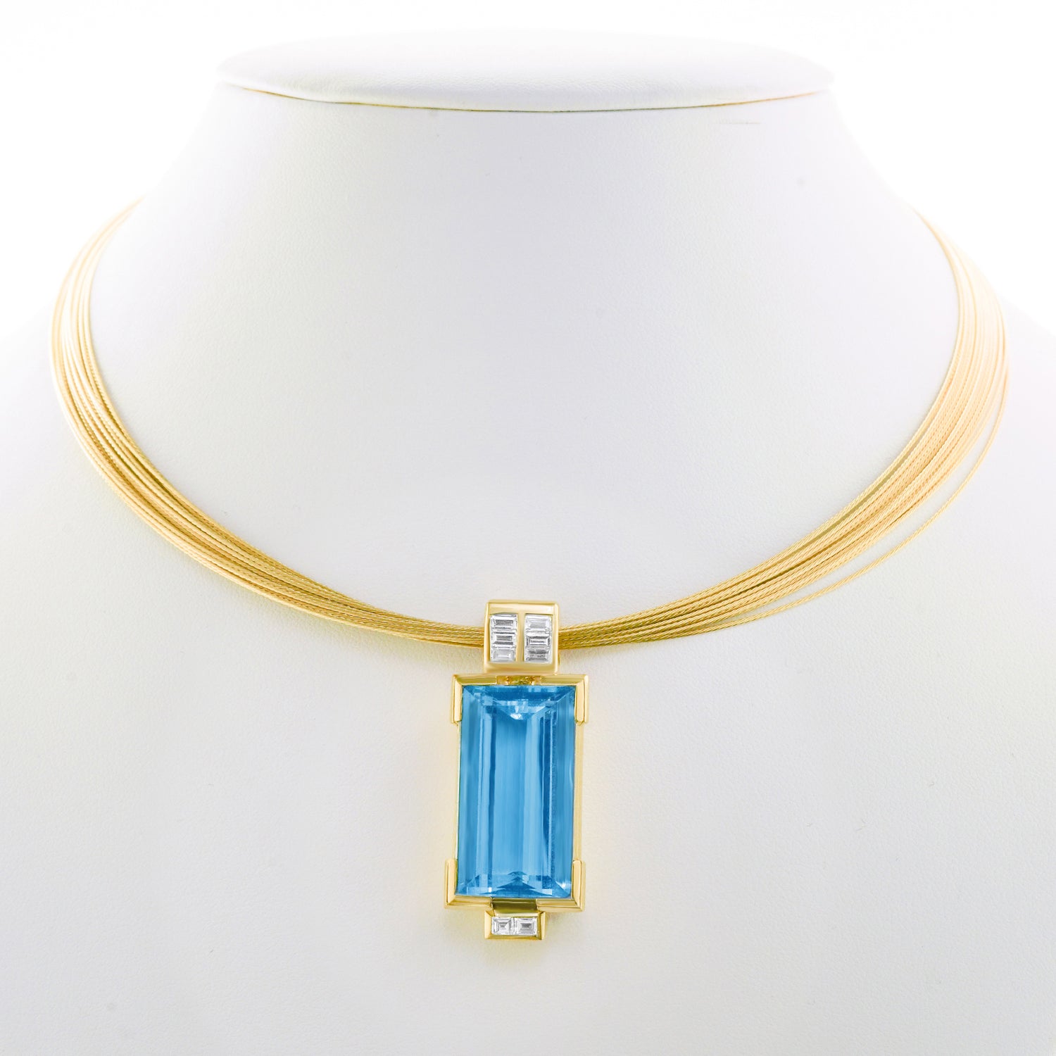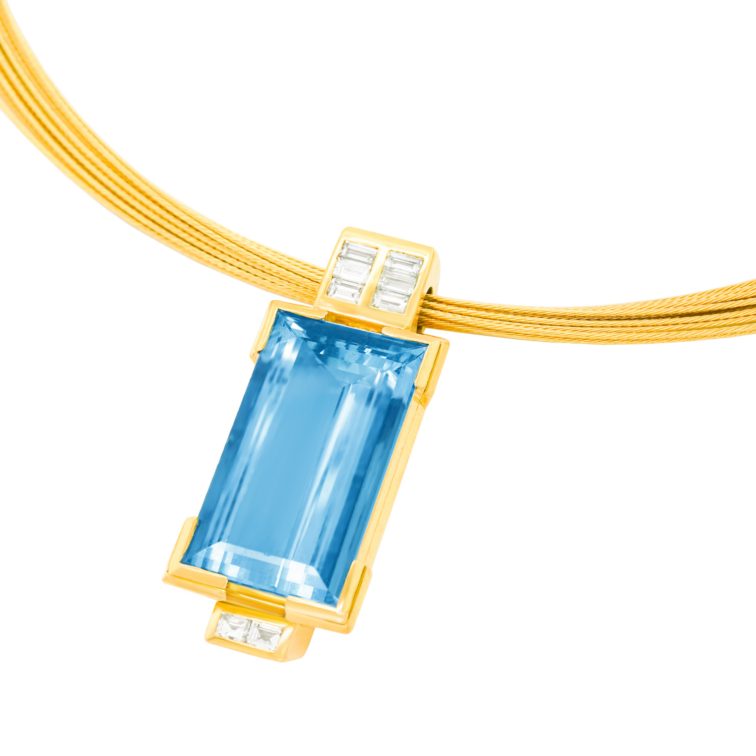 Circa 1970s, 18k, Switzerland. Swiss Modern at its elegant best, this sleek seventies necklace is set with a spectacular 30.0 carat deep blue Santa Maria aquamarine. Clean lines, brilliant white diamonds, and exquisite geometry complete the look of this high-fashion jewel. From the sidewalk to the catwalk, this sculpture-to-go is all chic all the time. Finely fabricated to exacting Swiss standards, this necklace is in excellent condition.
