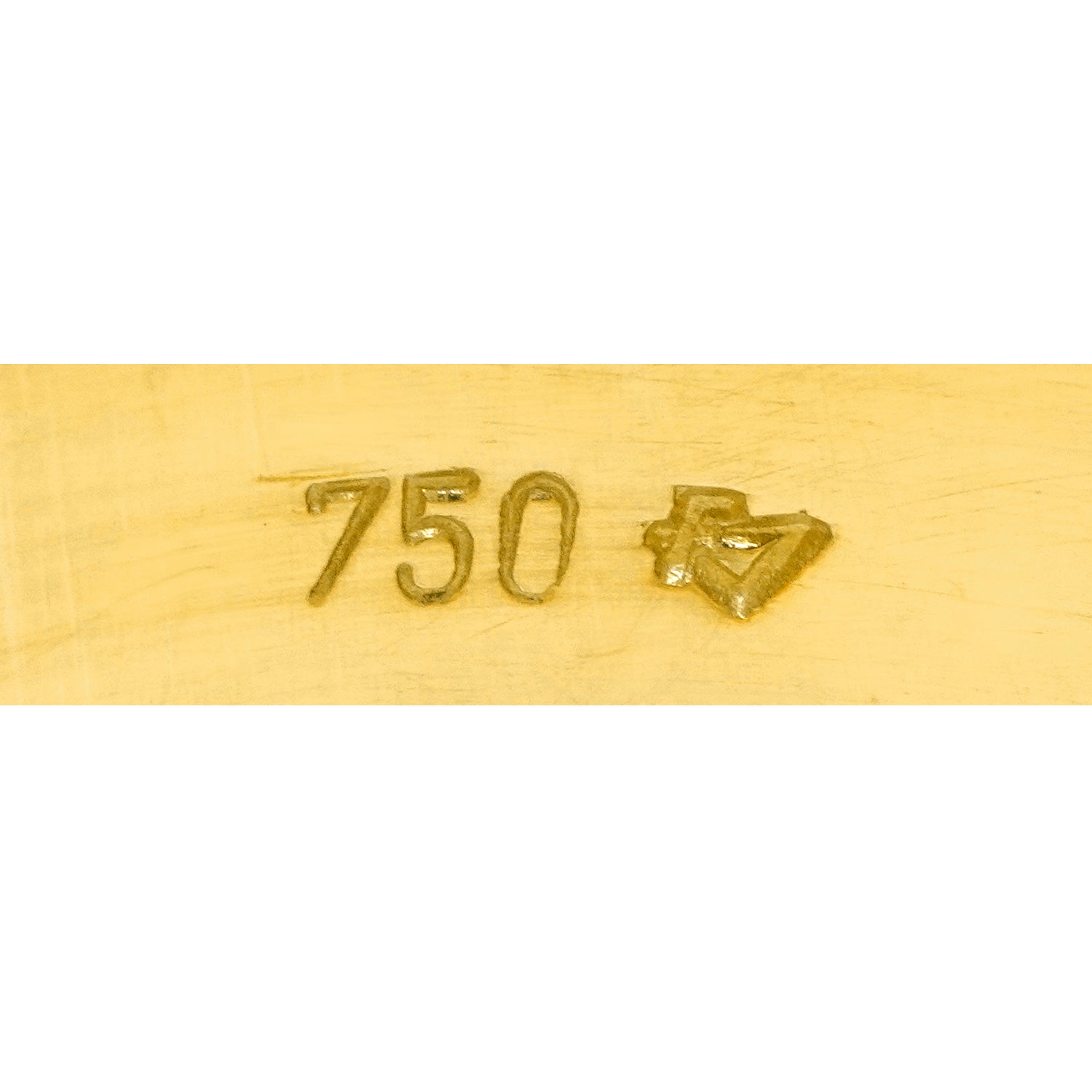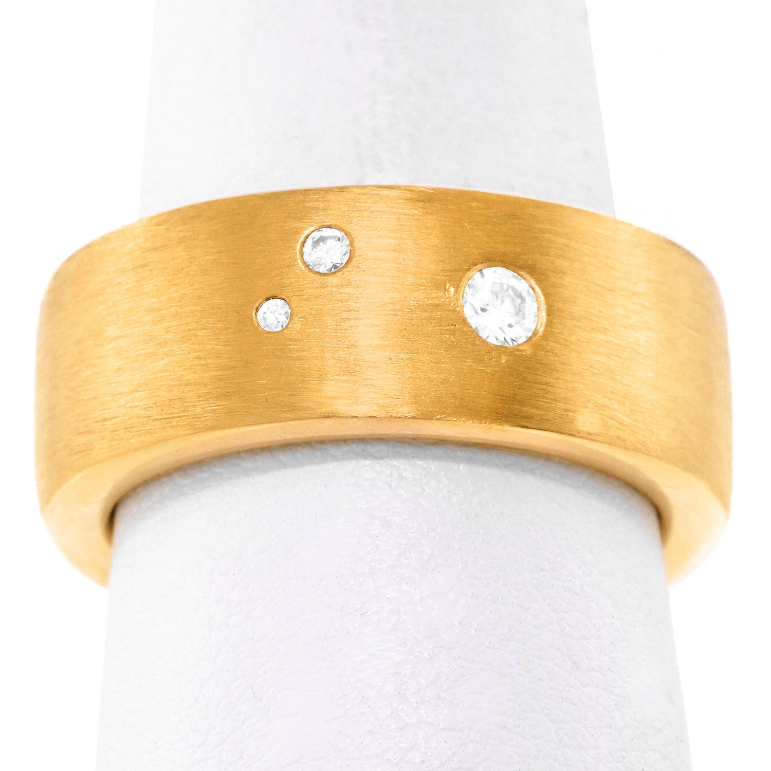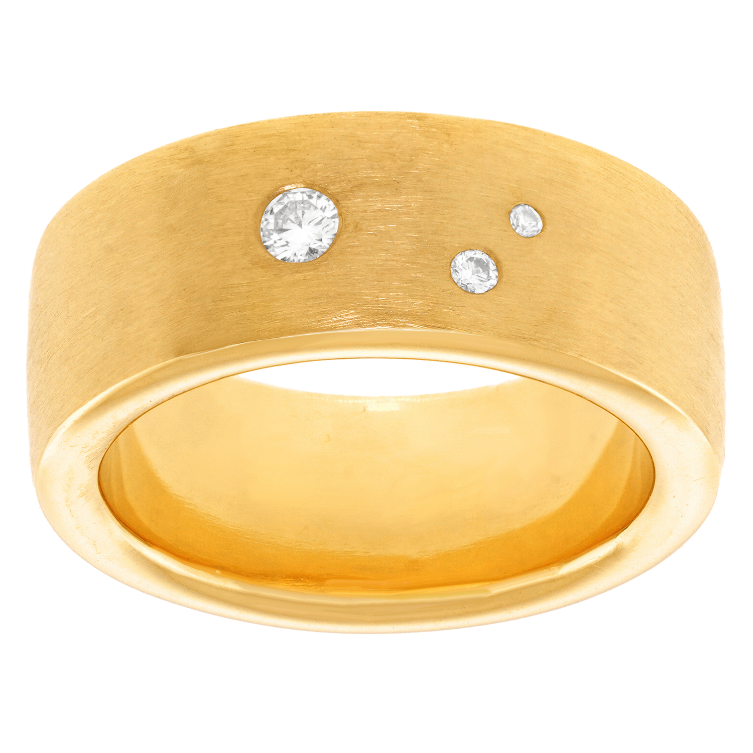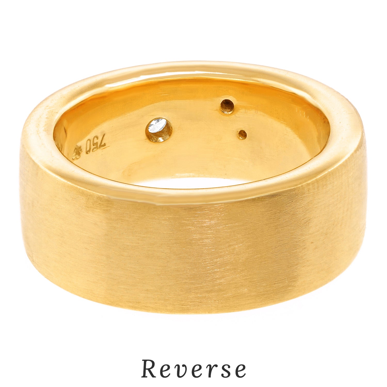 Circa 1970s, 18k, Swiss. This elegant Modernist ring features a timeless, yellow gold look with a shimmer of diamonds. The feel on the hand is heavy, without peer. I would go as far as to call it wonderfully overbuilt! Made to last a lifetime, this jewel is in excellent condition.