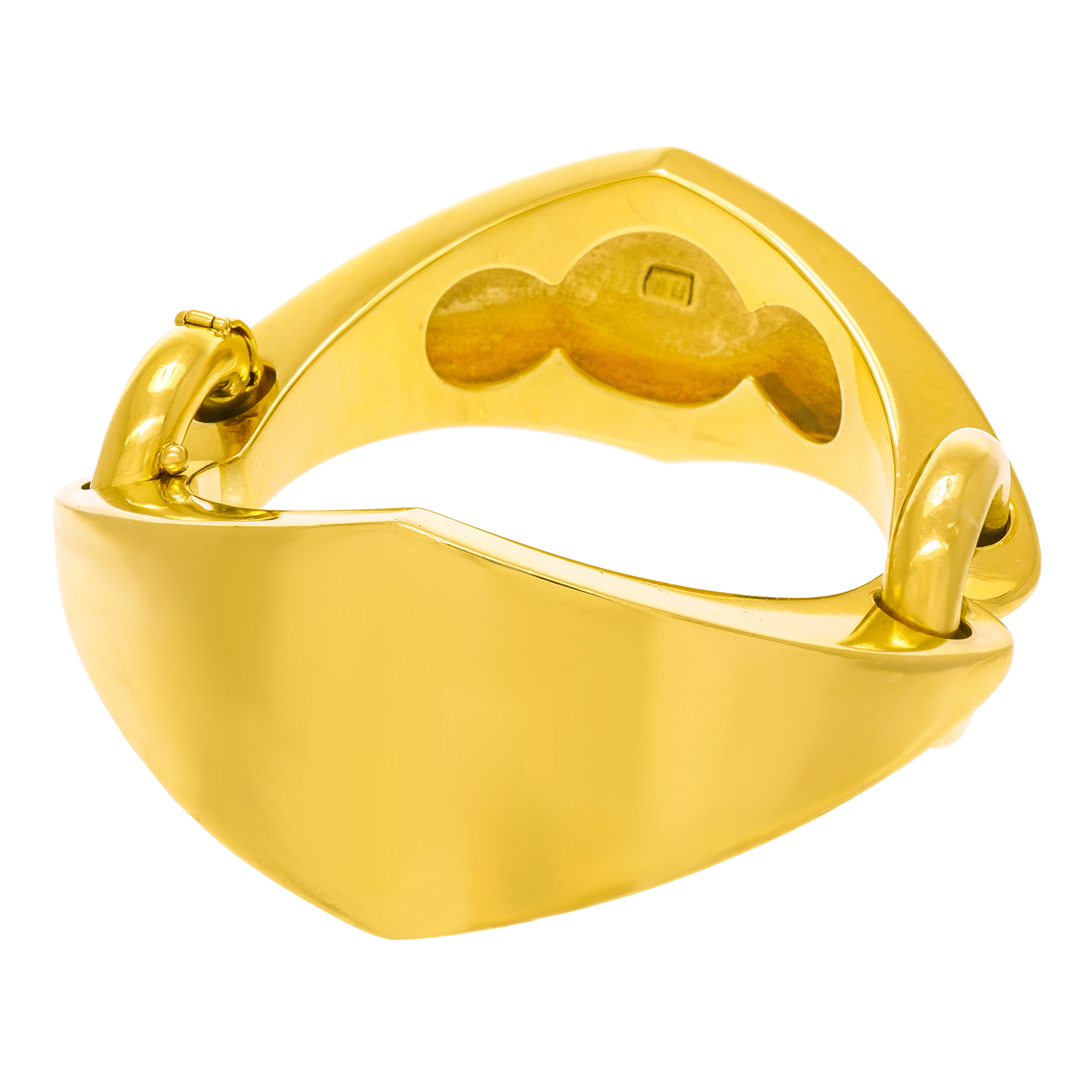 Circa 1950s, 18k, by Weber & Cie, Genève, Switzerland.  In Genève, where chic is a way of life and quality jewelry defines luxury, Weber and Cie set the tone for decades. This one-of-a-kind 18k yellow gold bracelet is visually arresting with crisp geometry and clean lines. Pleasantly heavy, it is very well made and in excellent condition.