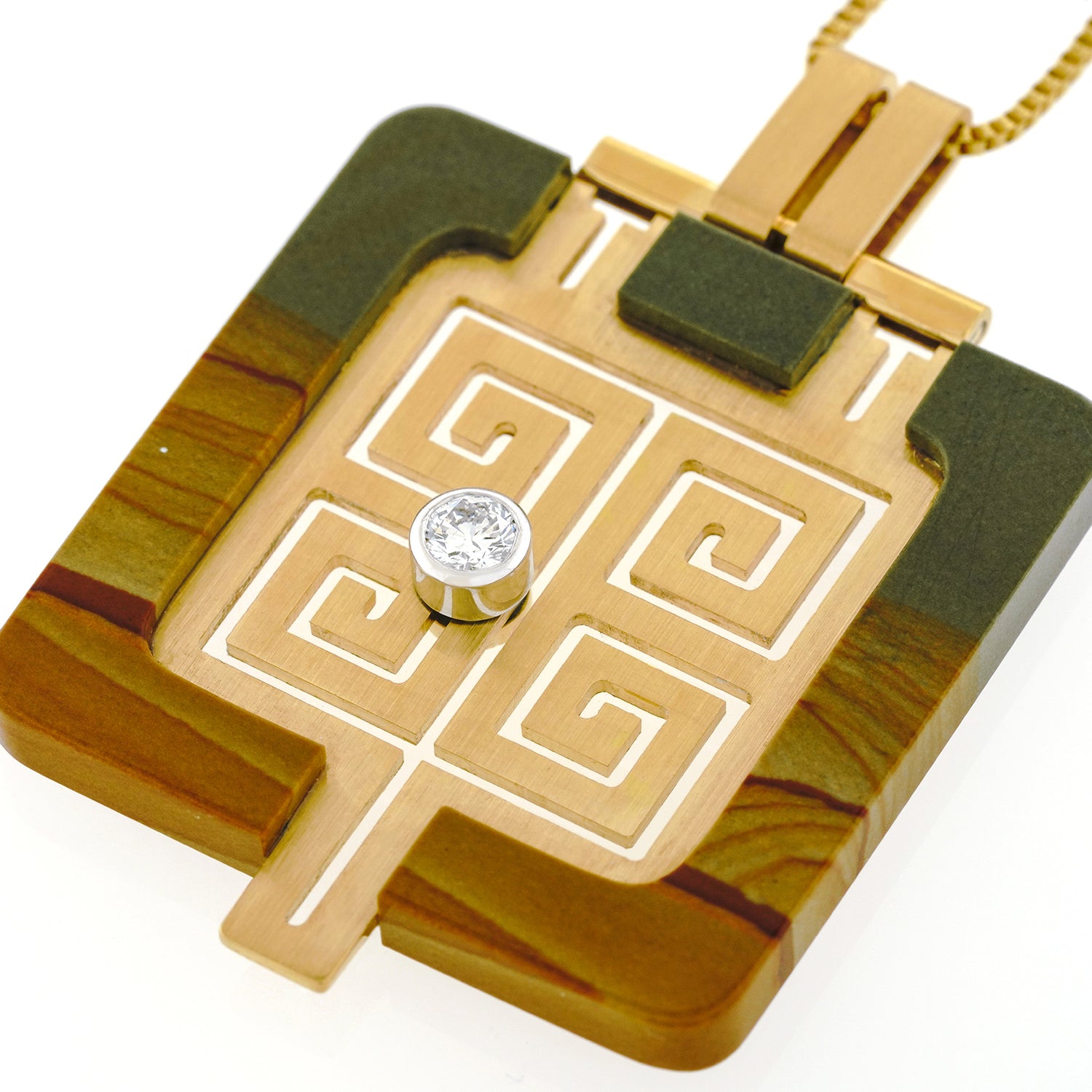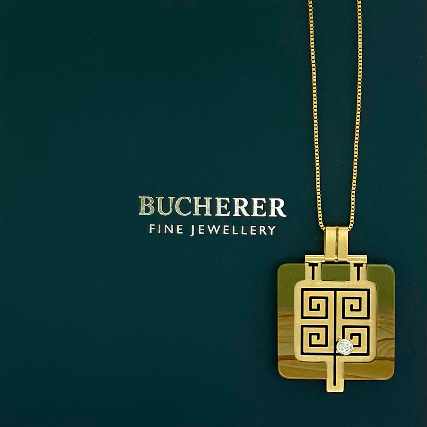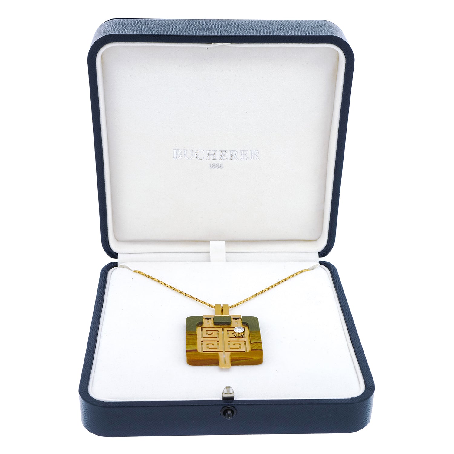 Circa 1980s, 18k, by Carl Bucherer, Switzerland. This one-of-a-kind pendant in the Chinese Taste has an understated elegance that, paired with the innovative kinetic design, delivers incomparable style. When I think of Bucherer the words that come to mind are quality, taste, excellence, and substance. Delivering on all fronts, this pendant features an articulated design. The diamond can be moved throughout the motif. Excellent condition.
