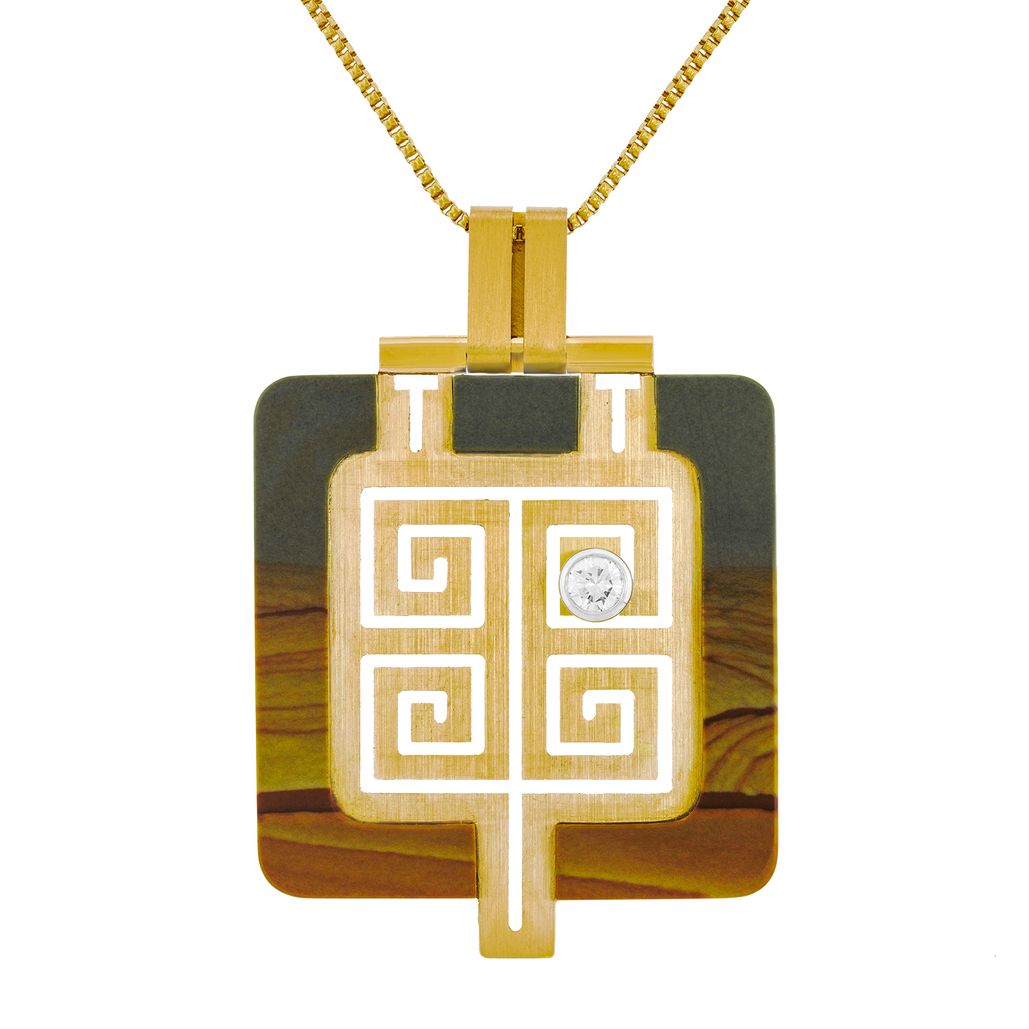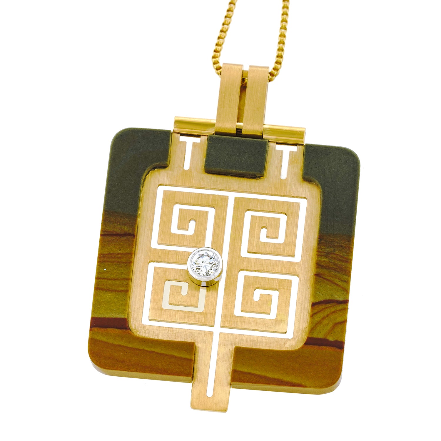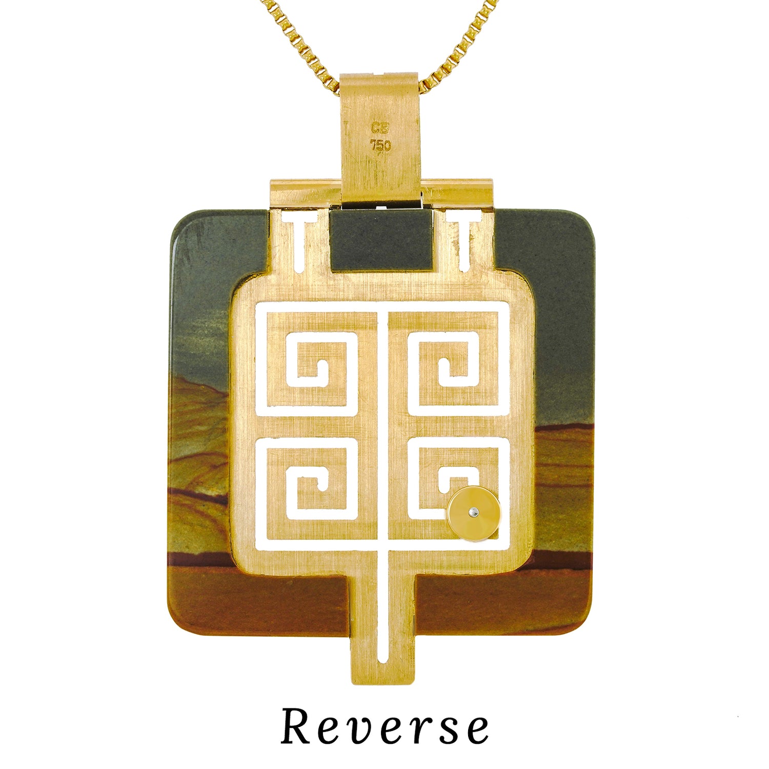 Circa 1980s, 18k, by Carl Bucherer, Switzerland. This one-of-a-kind pendant in the Chinese Taste has an understated elegance that, paired with the innovative kinetic design, delivers incomparable style. When I think of Bucherer the words that come to mind are quality, taste, excellence, and substance. Delivering on all fronts, this pendant features an articulated design. The diamond can be moved throughout the motif. Excellent condition.