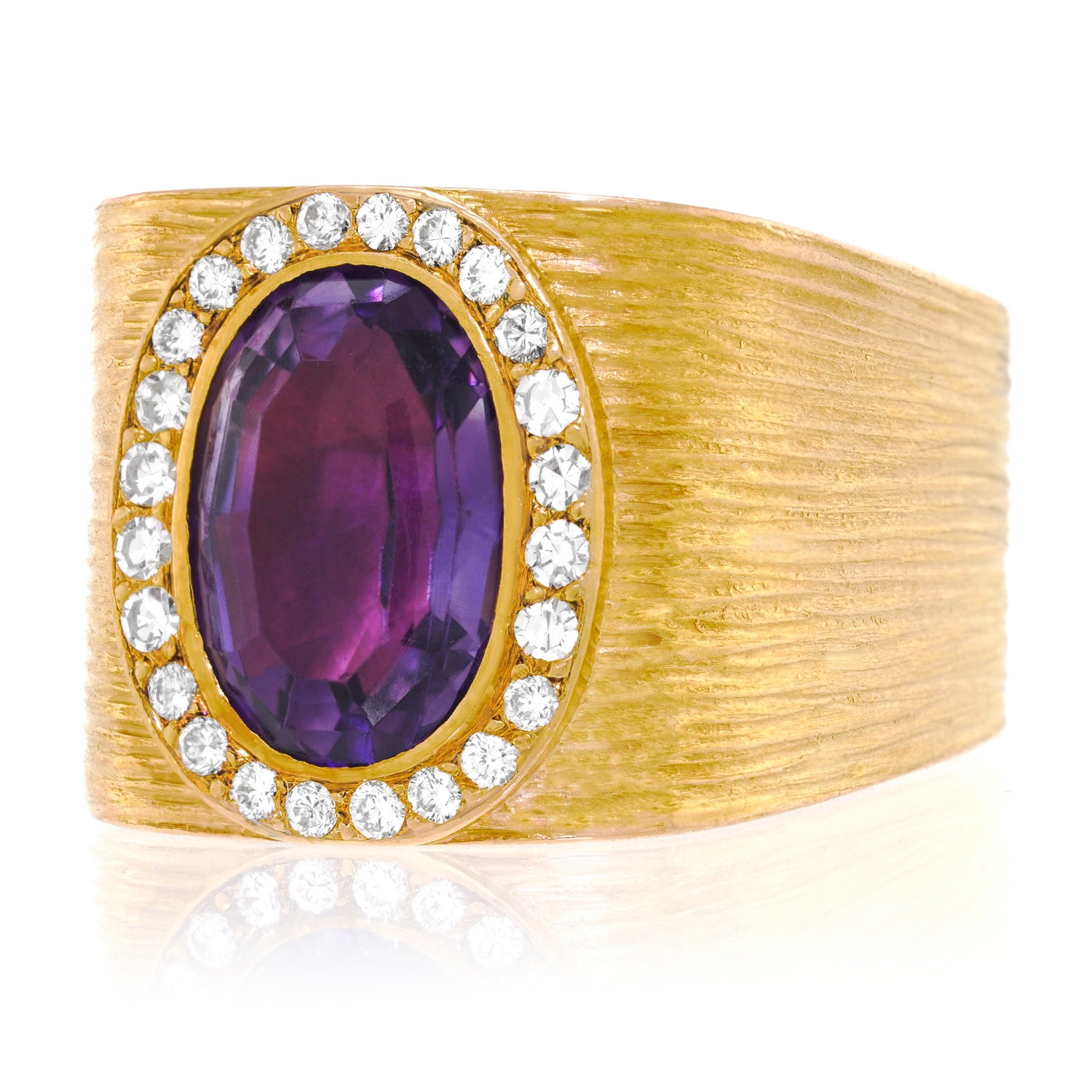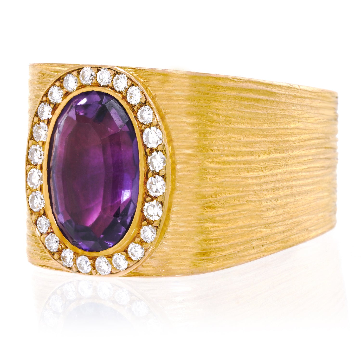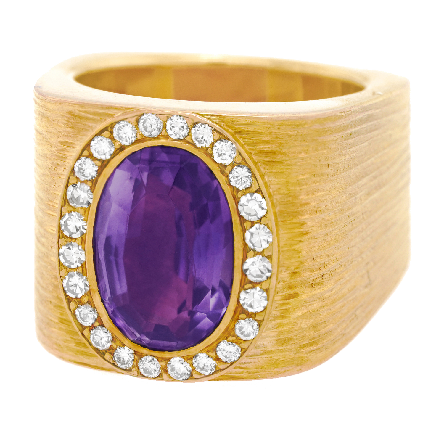Circa 1970s, 18k, by Paul Binder, Zurich, Switzerland.  Set with a lush amethyst surrounded by .40 carats of fine white diamonds (G color, VS clarity), this effortlessly chic Swiss Modern ring has an edgy visual vibrancy. Particularly of note is the highly dimensional form and delicately hand-applied texturing. Paul Binder was renowned as the finest Swiss goldsmith of his generation. His original shop was in Winterthur; he later relocated to Zurich. Excellent condition.