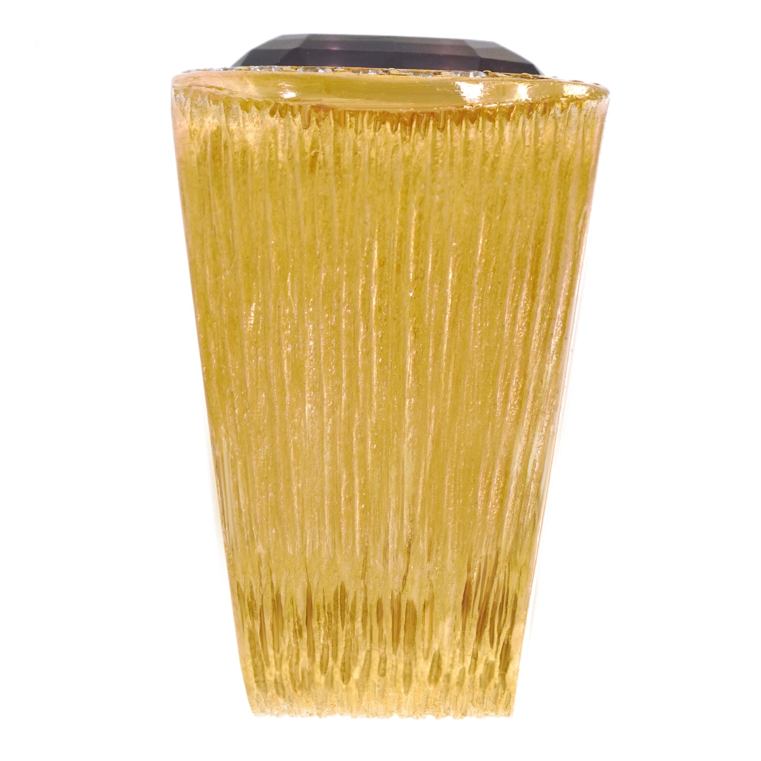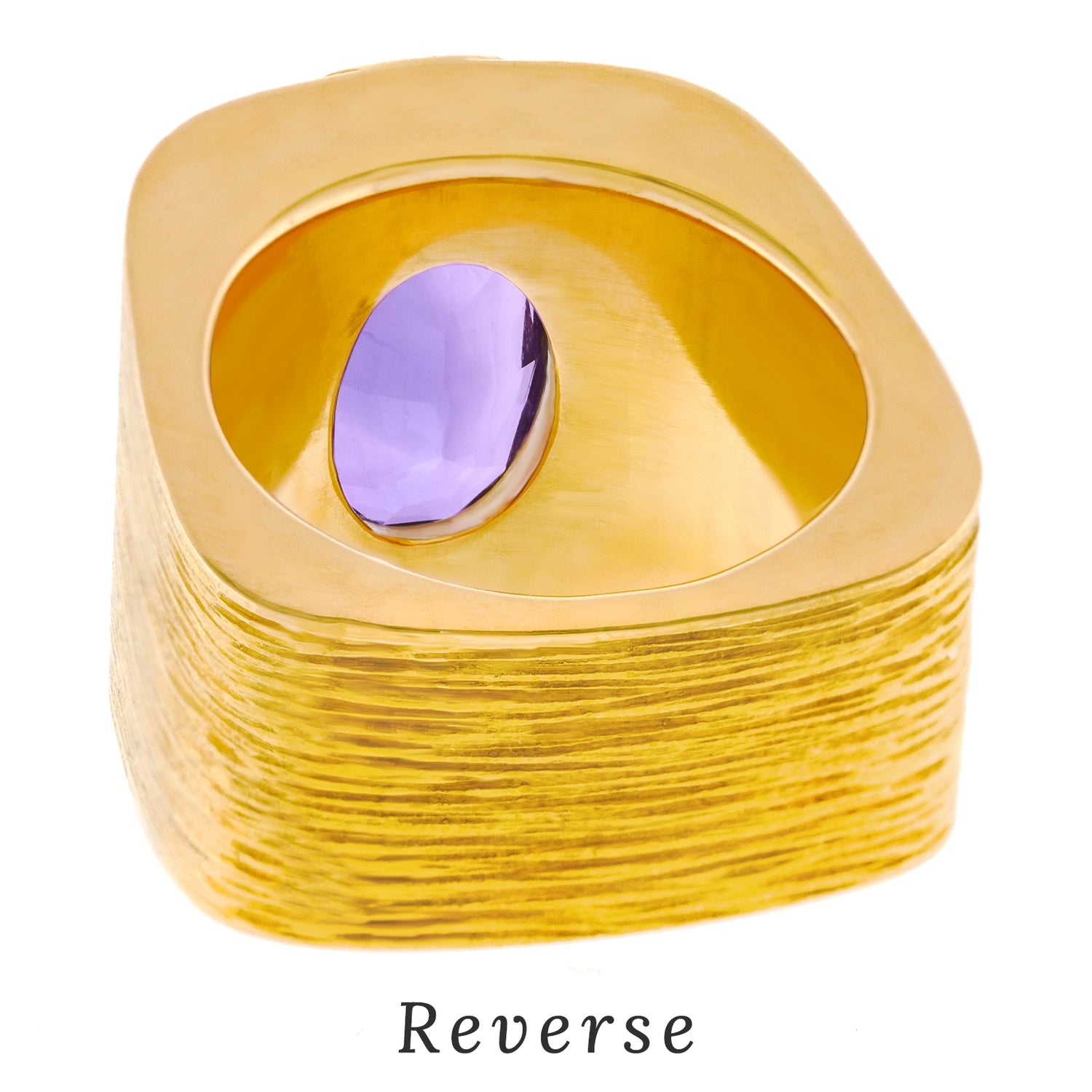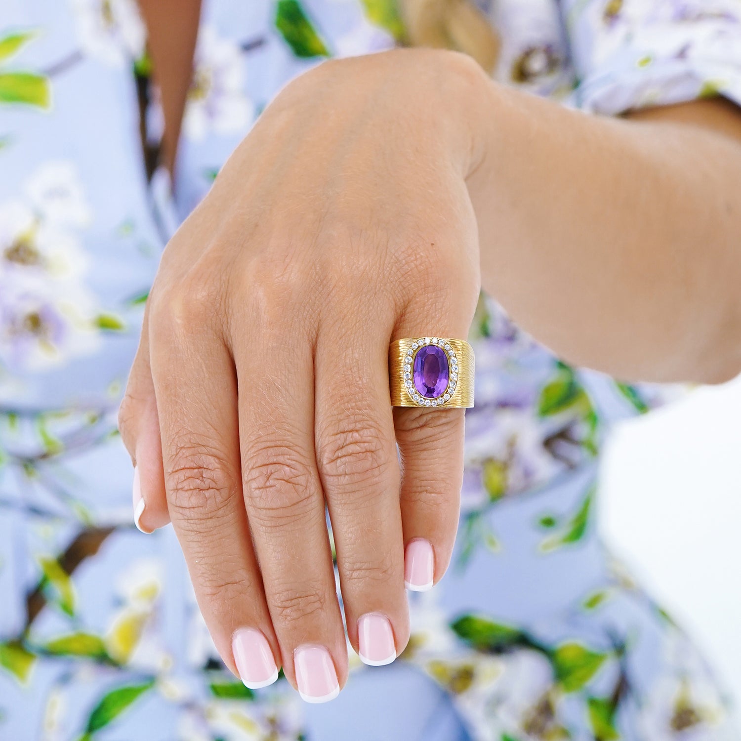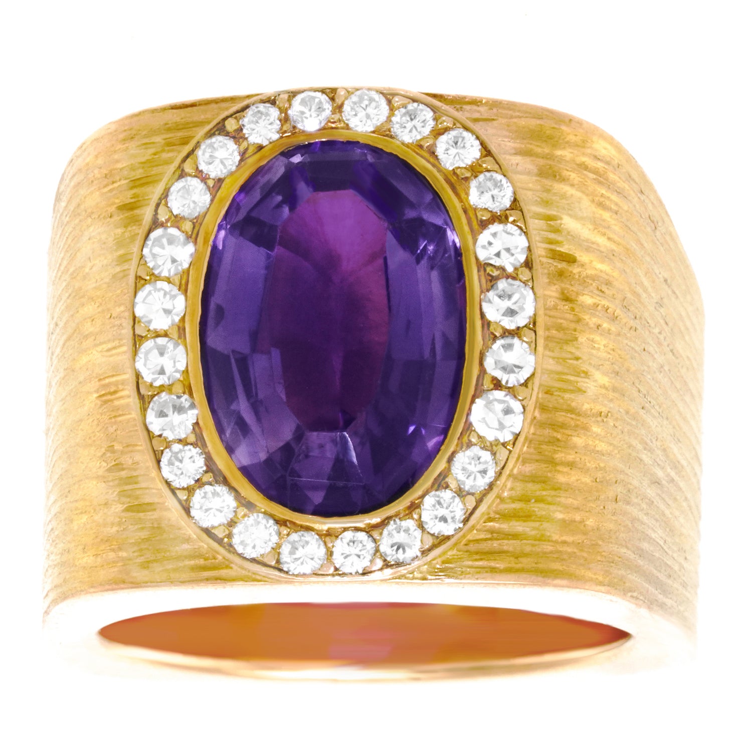 Circa 1970s, 18k, by Paul Binder, Zurich, Switzerland.  Set with a lush amethyst surrounded by .40 carats of fine white diamonds (G color, VS clarity), this effortlessly chic Swiss Modern ring has an edgy visual vibrancy. Particularly of note is the highly dimensional form and delicately hand-applied texturing. Paul Binder was renowned as the finest Swiss goldsmith of his generation. His original shop was in Winterthur; he later relocated to Zurich. Excellent condition.