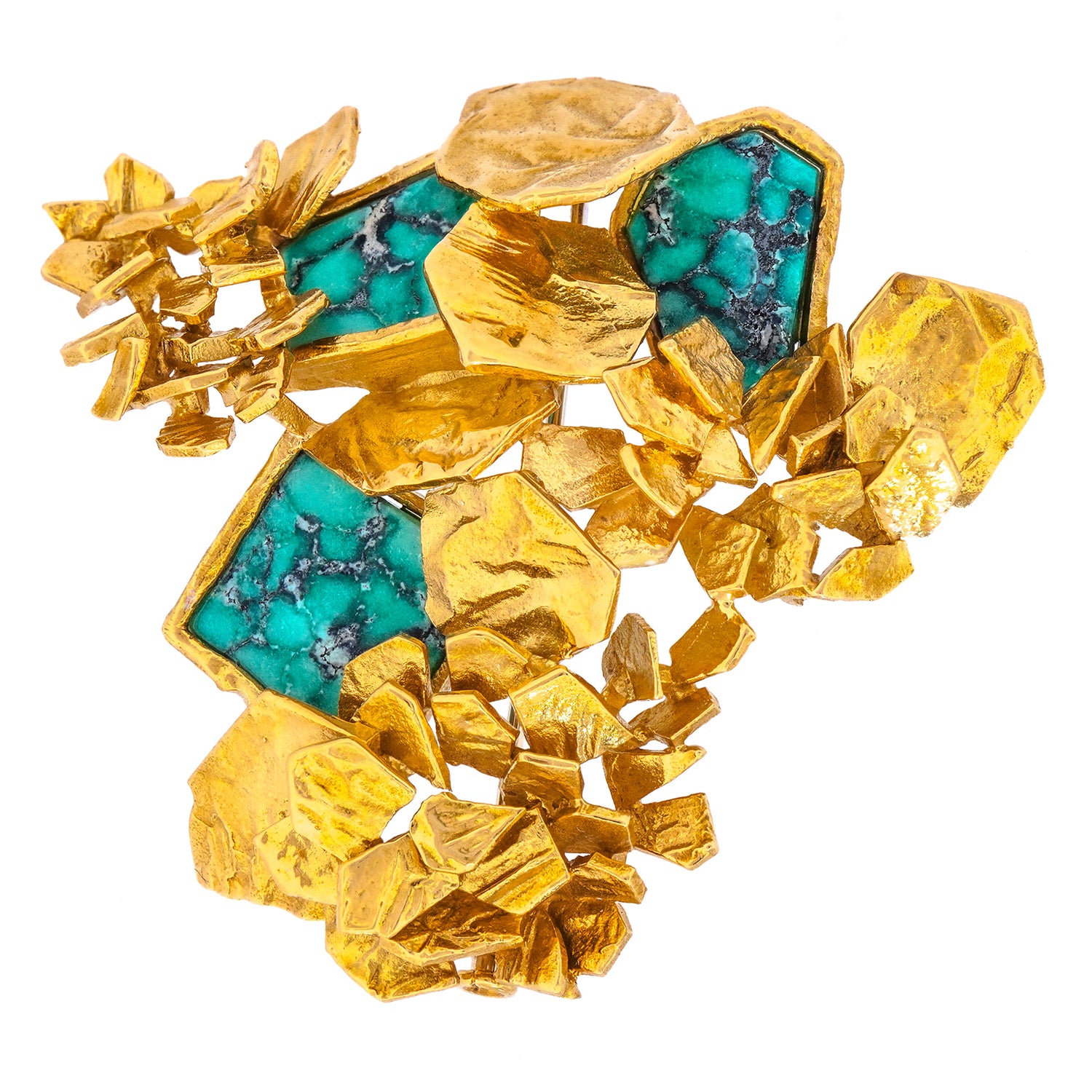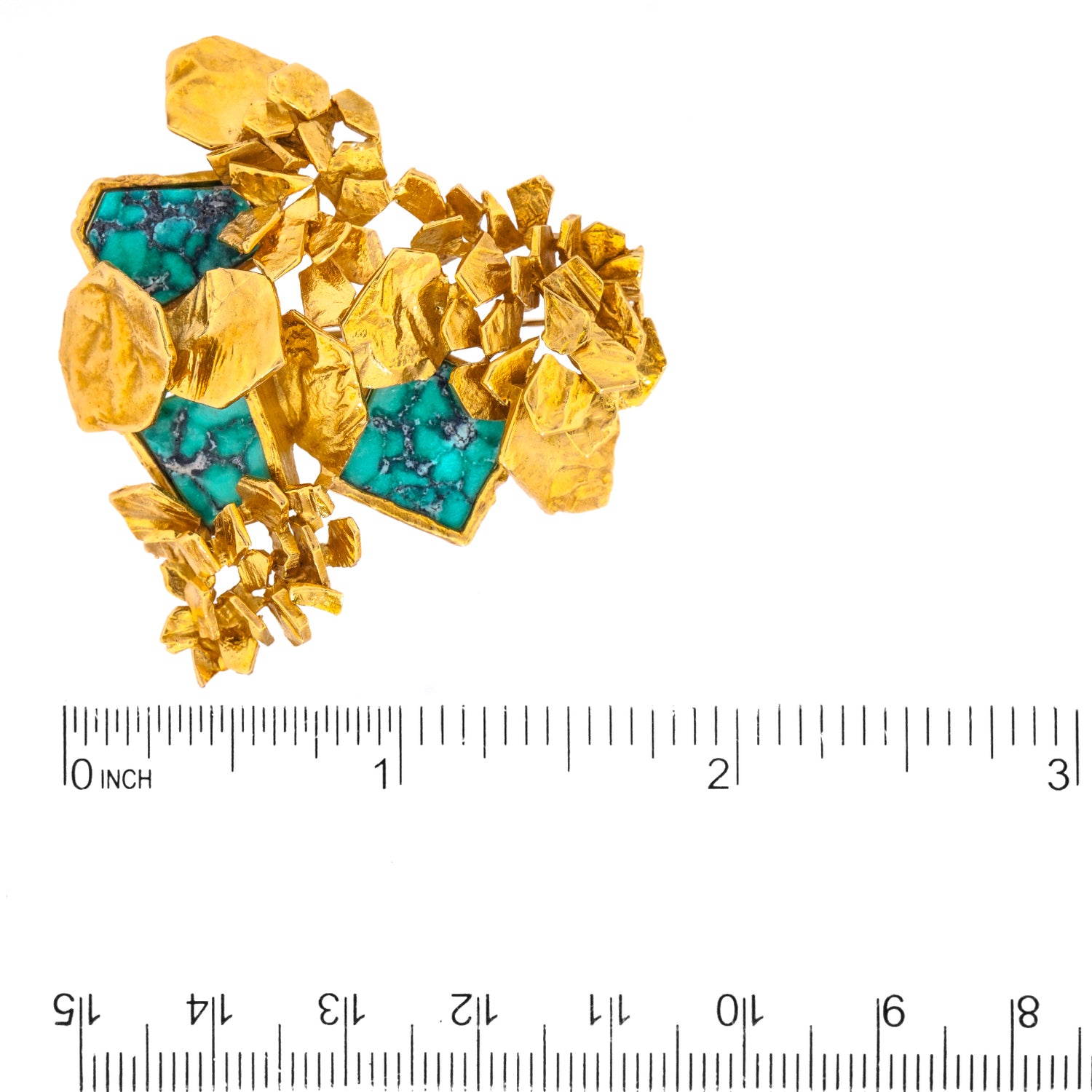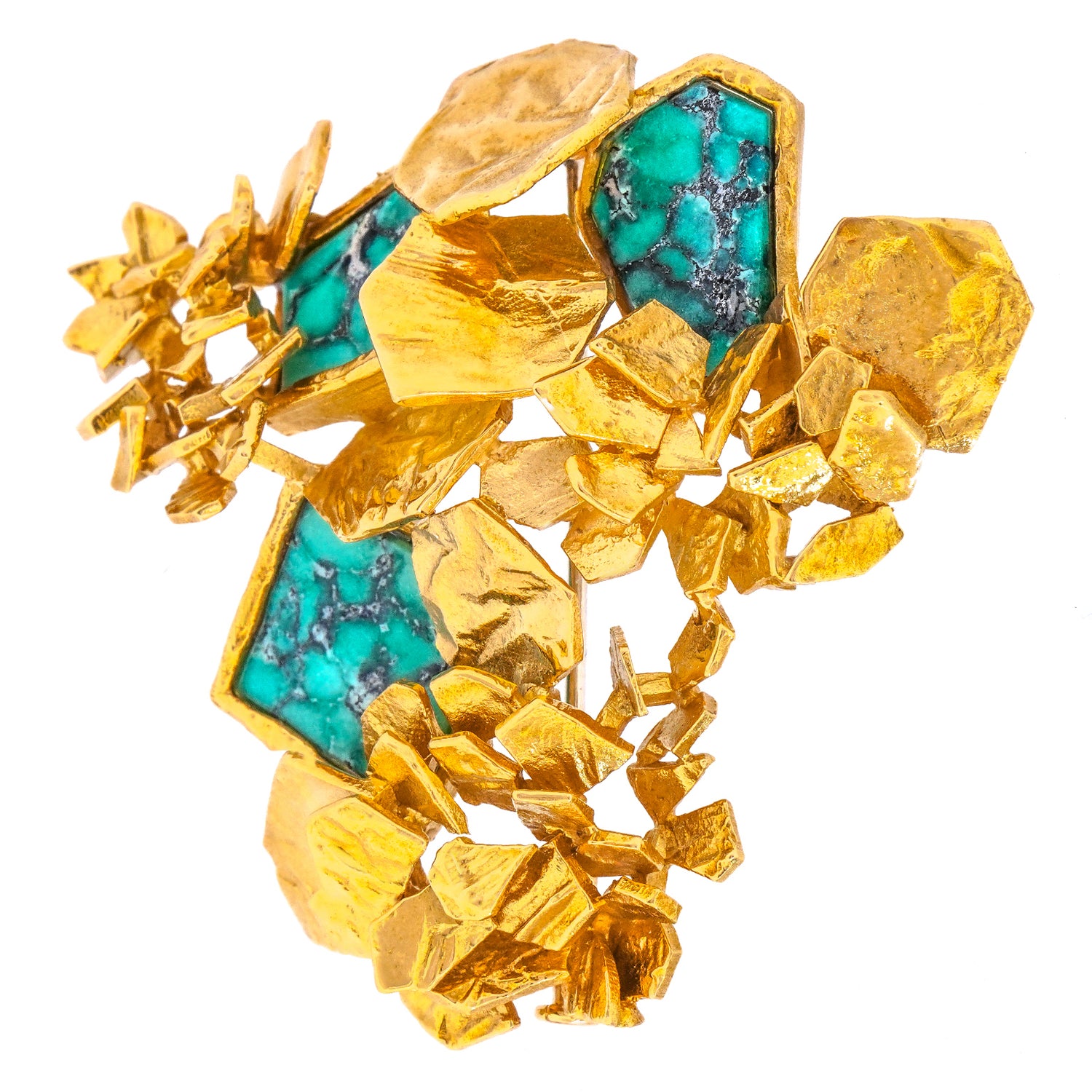 Circa 1960s, 18k, Swiss. This brooch is Swiss Modern chic at its sixties brutalist best! The organic, dimensional landscape is set with turquoise for a Gala meets the Met look. Perfect for any moment of fashion, it will become an instant favorite.   Excellent condition.