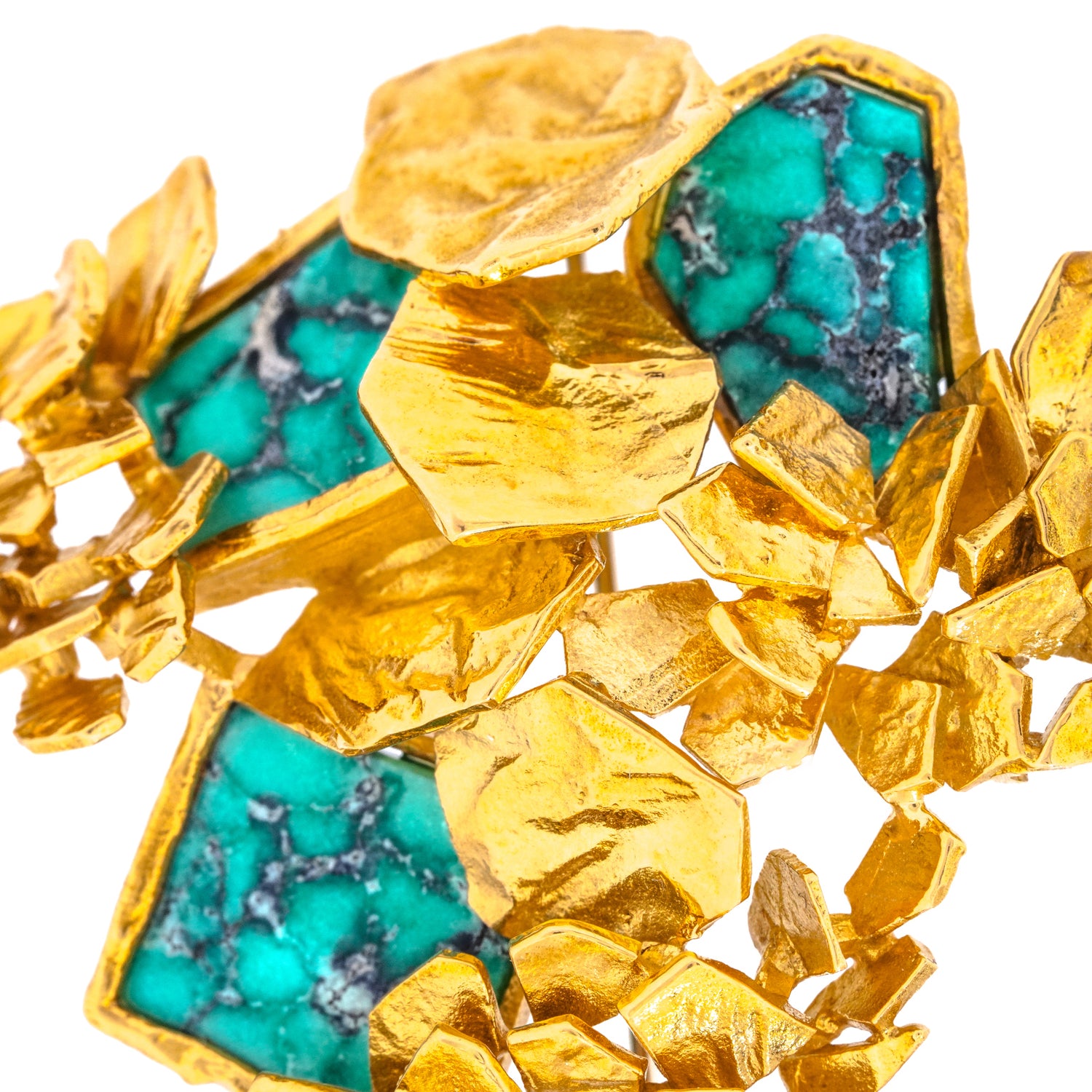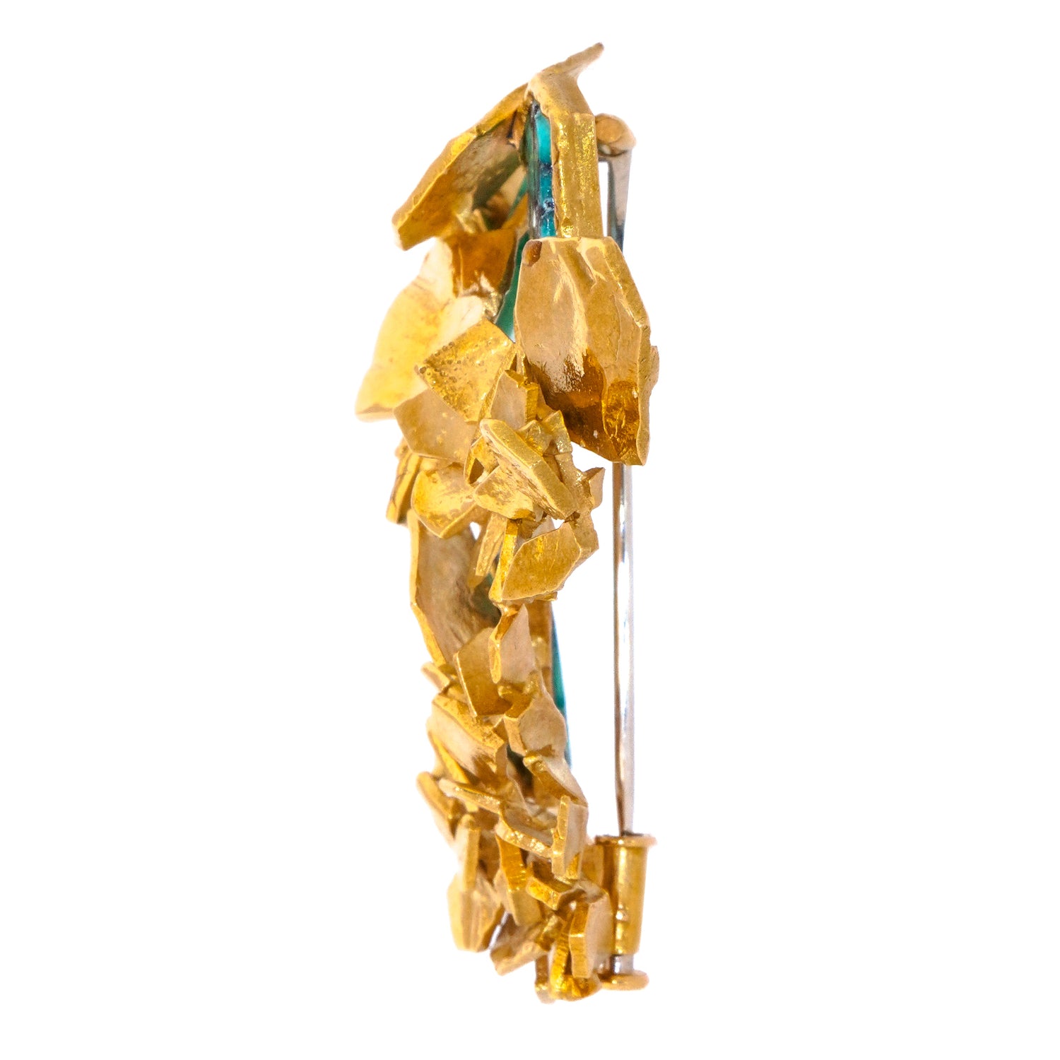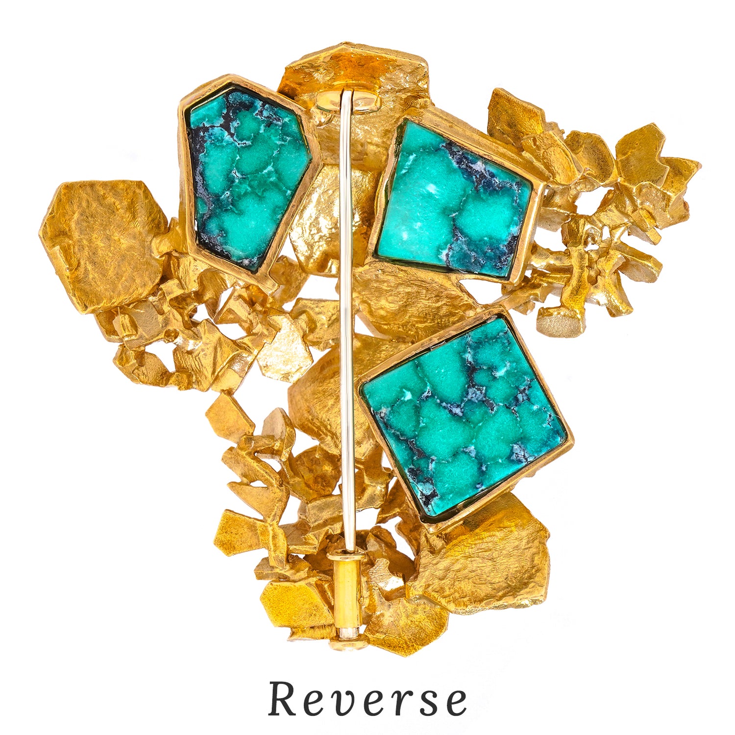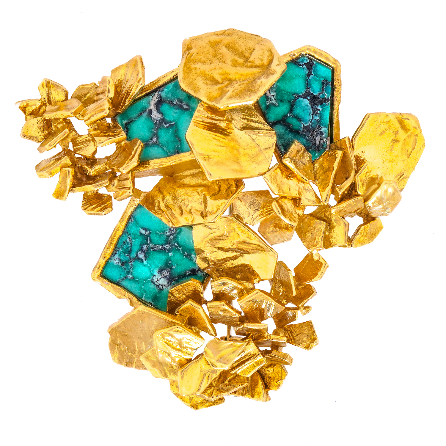 Circa 1960s, 18k, Swiss. This brooch is Swiss Modern chic at its sixties brutalist best! The organic, dimensional landscape is set with turquoise for a Gala meets the Met look. Perfect for any moment of fashion, it will become an instant favorite.   Excellent condition.
