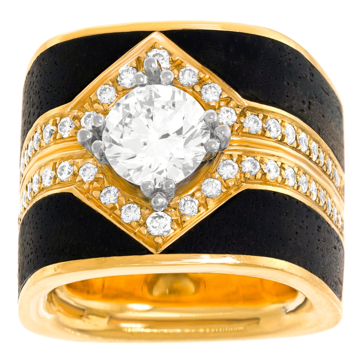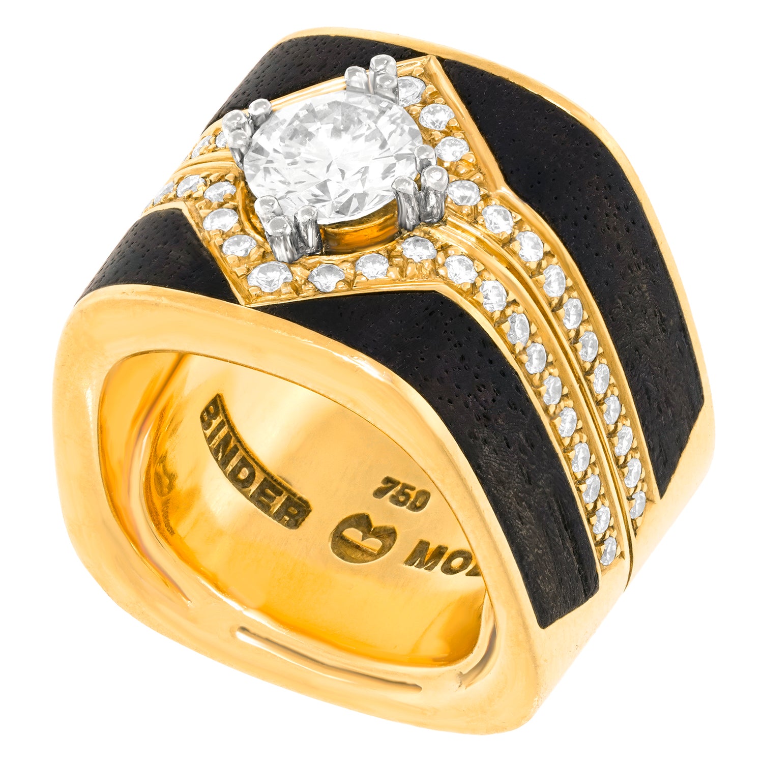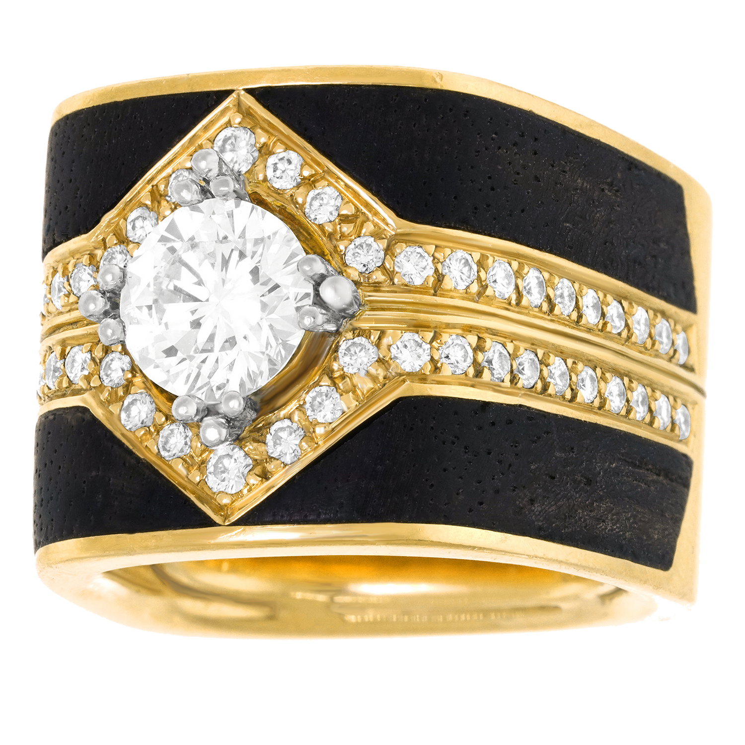 Circa 2000s, 18k, by Binder-Moerisch, Zurich. The juxtaposition of materials, wood, yellow gold, and diamonds, create sleek contemporary visuals. The look is Swiss Modern, Zurich style. The spectacular .90-carat diamond (G color, VS clarity) is accented by an additional .52 carats of brilliant white stones. Inspired by the designs of Paul Binder, the pre-eminent Swiss goldsmith of his time, this one-of-a-kind ring was meticulously fabricated by his son Paul Binder and Walde Moerisch. Excellent condition.