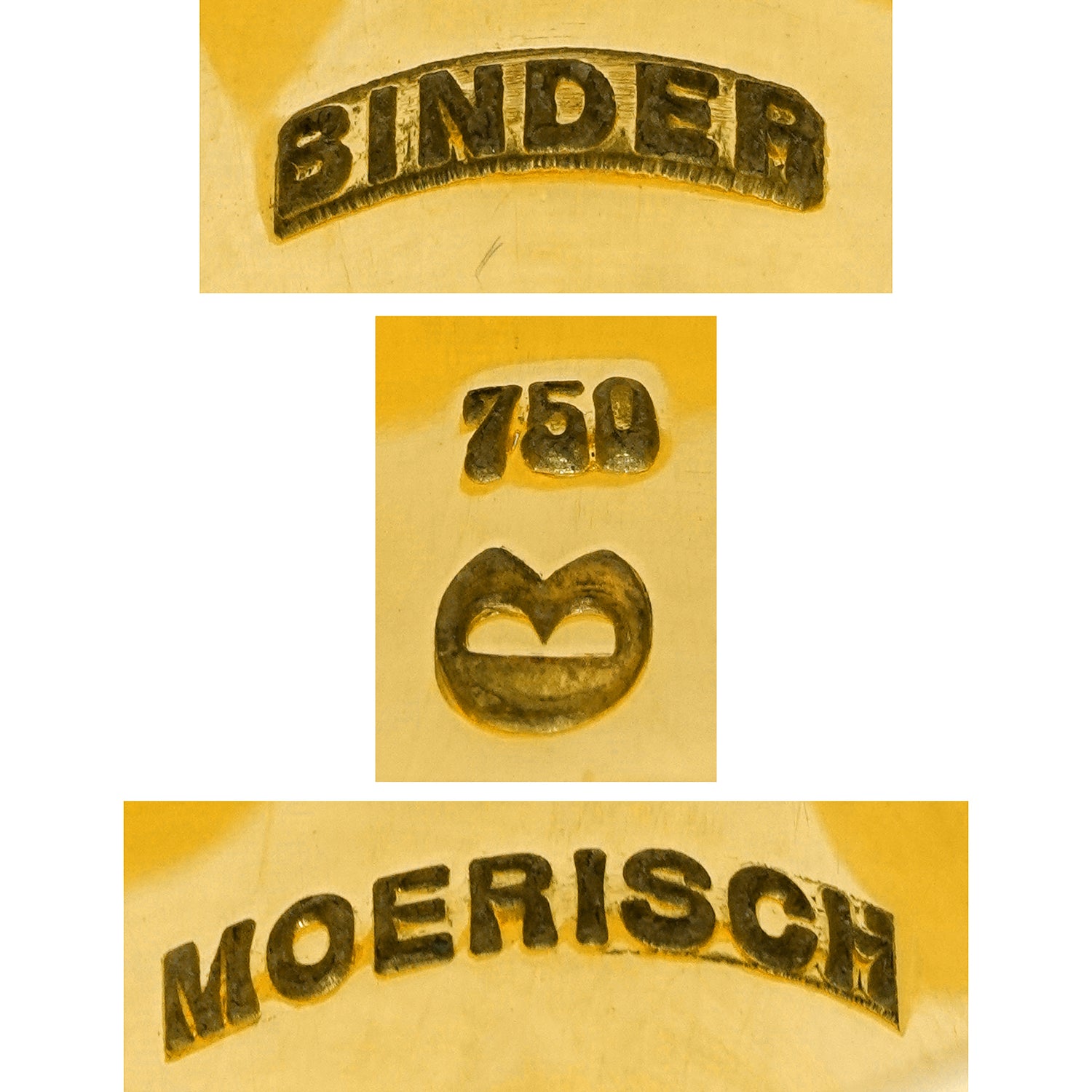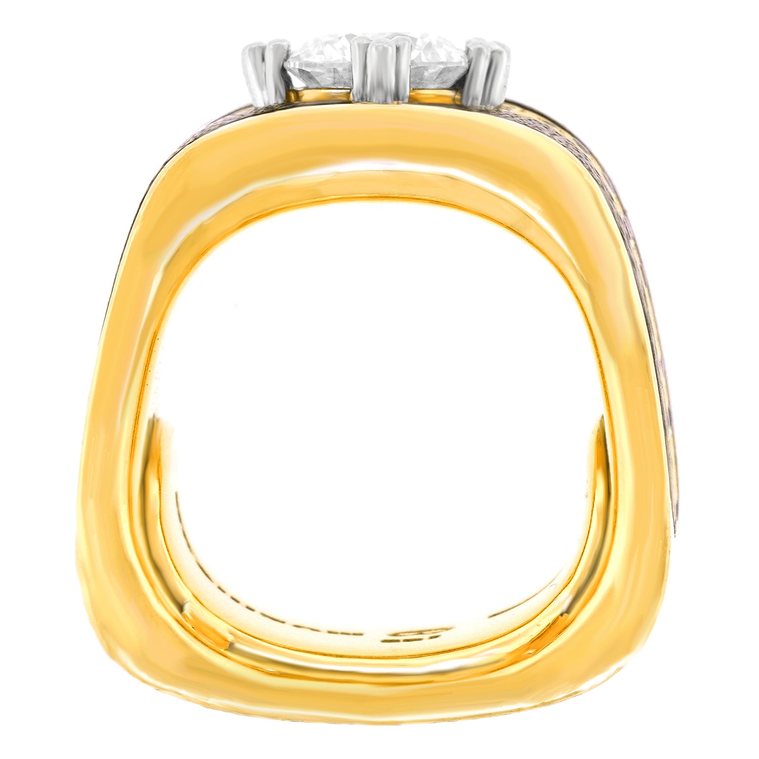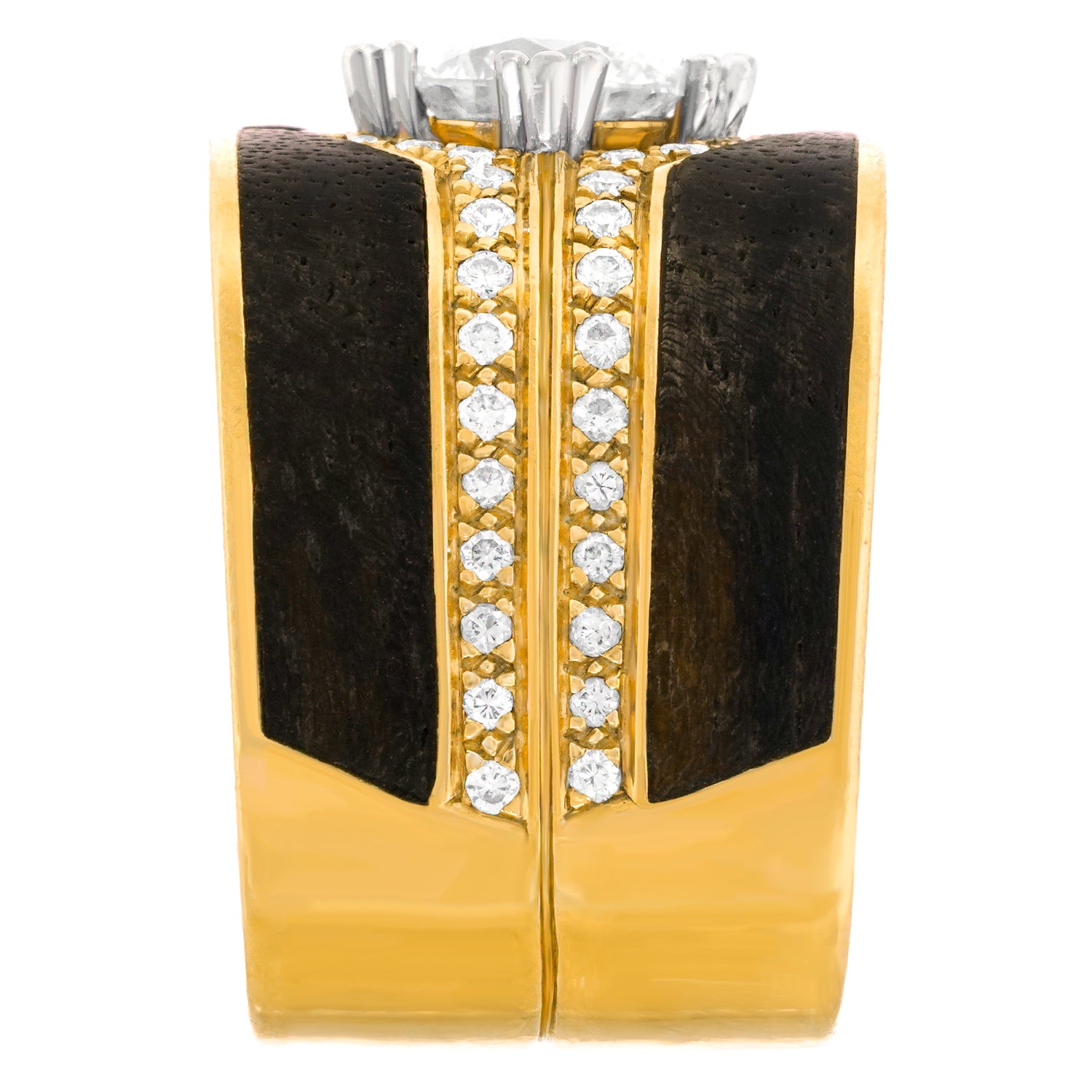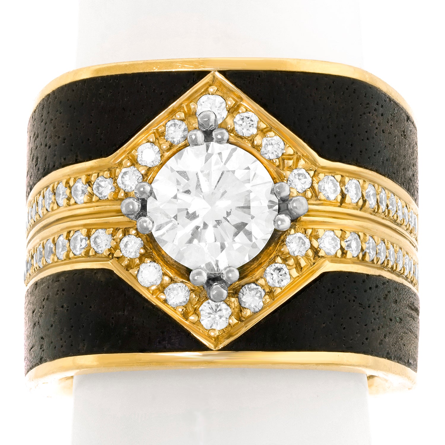 Circa 2000s, 18k, by Binder-Moerisch, Zurich. The juxtaposition of materials, wood, yellow gold, and diamonds, create sleek contemporary visuals. The look is Swiss Modern, Zurich style. The spectacular .90-carat diamond (G color, VS clarity) is accented by an additional .52 carats of brilliant white stones. Inspired by the designs of Paul Binder, the pre-eminent Swiss goldsmith of his time, this one-of-a-kind ring was meticulously fabricated by his son Paul Binder and Walde Moerisch. Excellent condition.