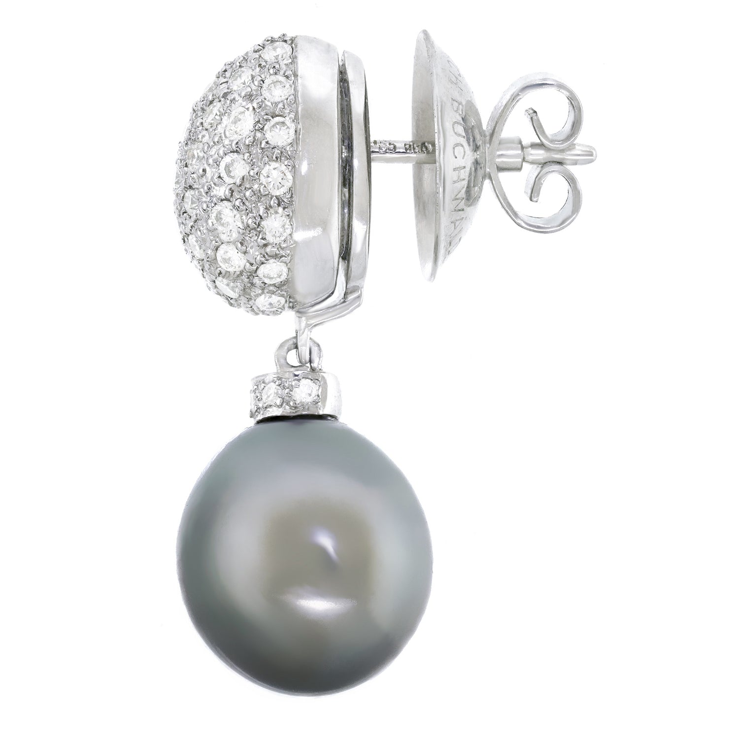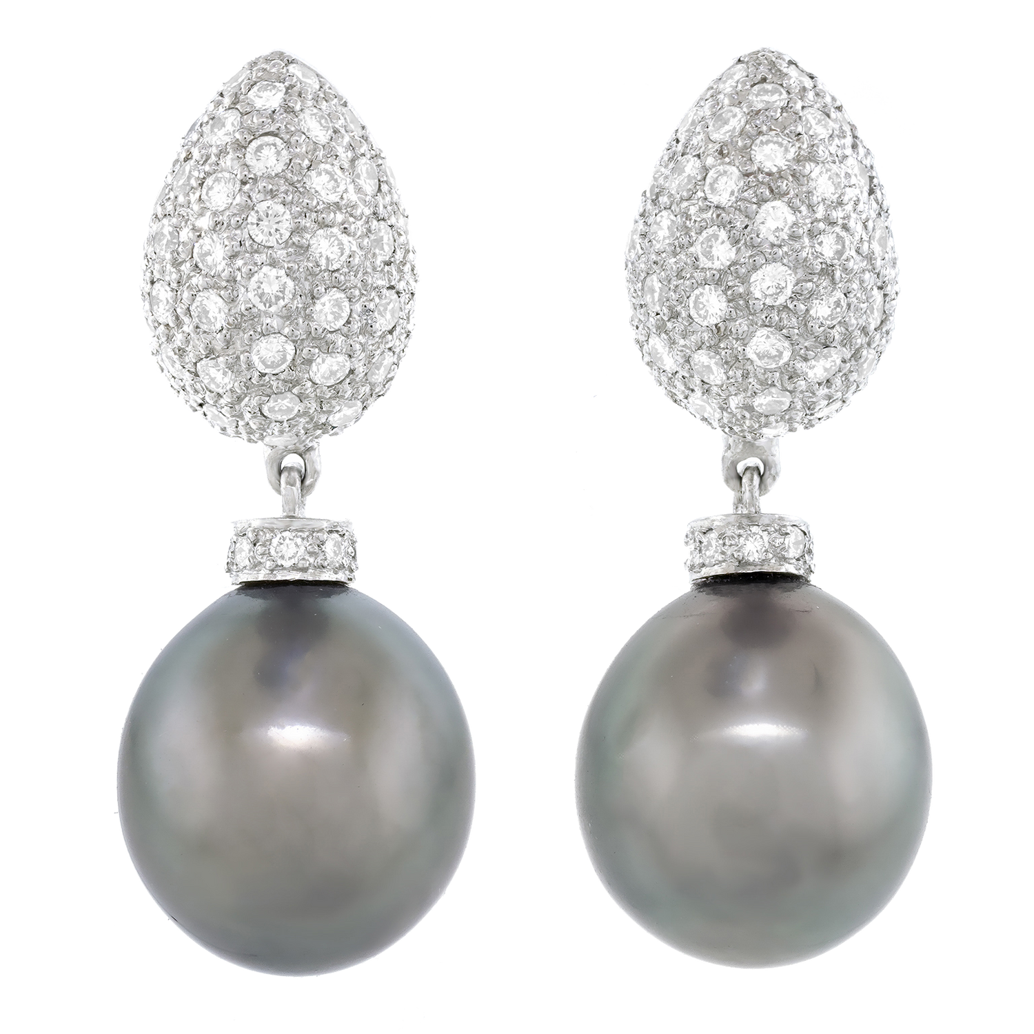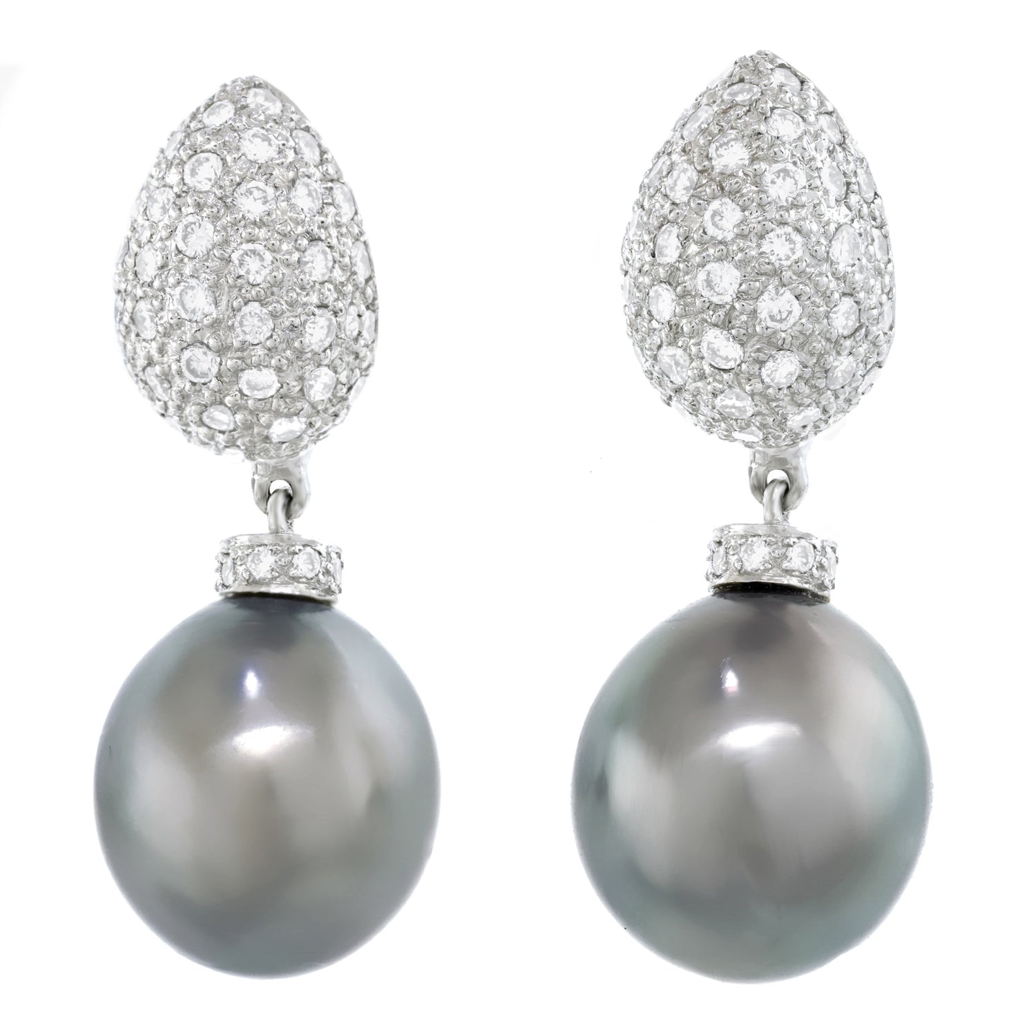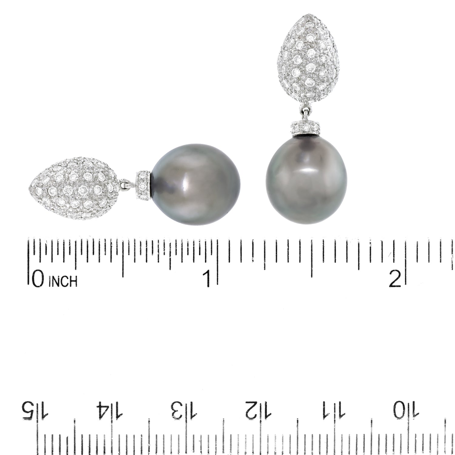 Circa  2000s, 18k, Switzerland.  These visually fresh earrings feature lustrous Tahitian black pearls capped in diamonds and suspended from pave diamond elements. The look is elegantly chic, perfect for evening.  Set with 1.10 carats of H-I color, VS clarity diamonds and matched 10.8 millimeter pearls, they are beautifully made and extremely wearable. Excellent condition.