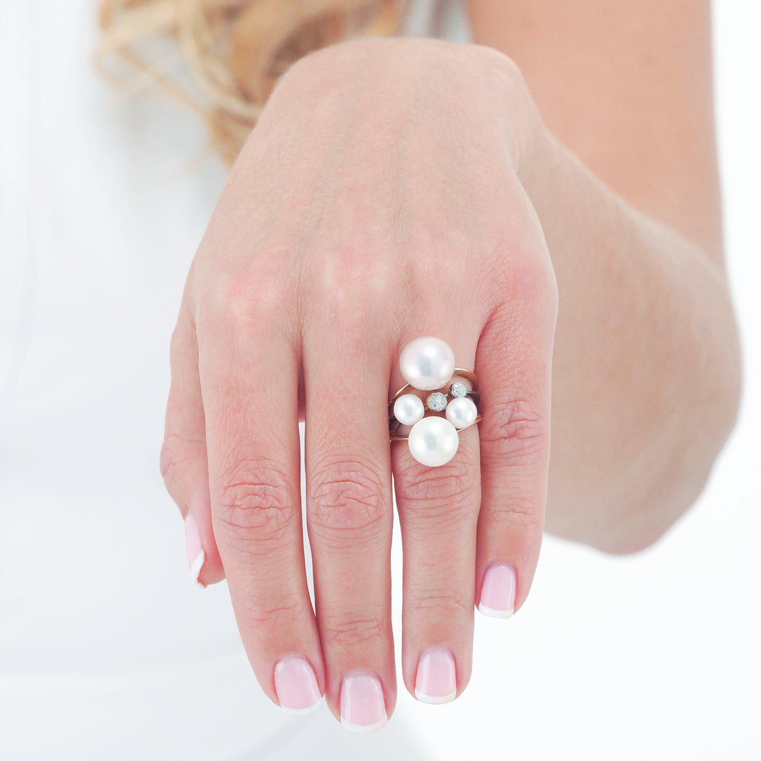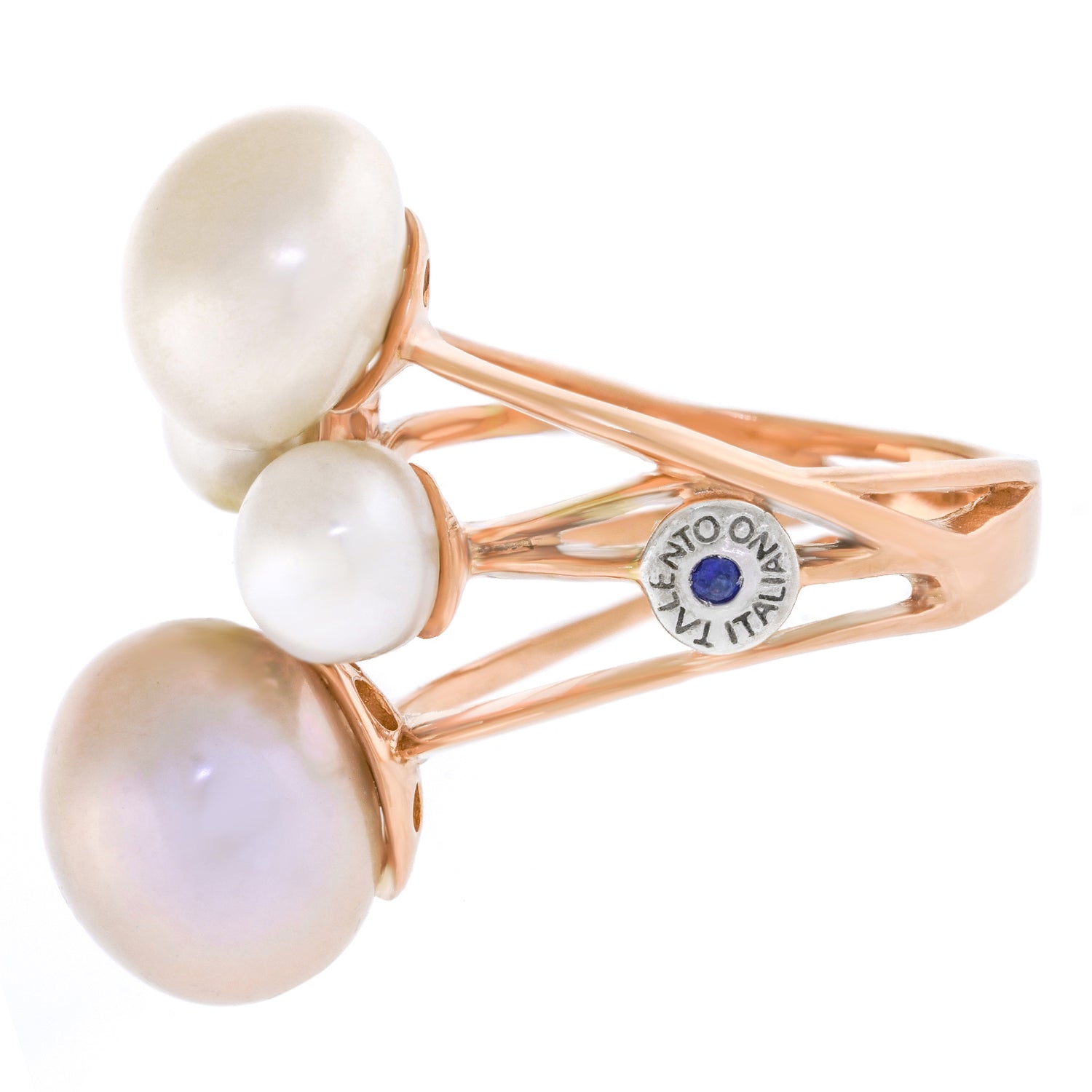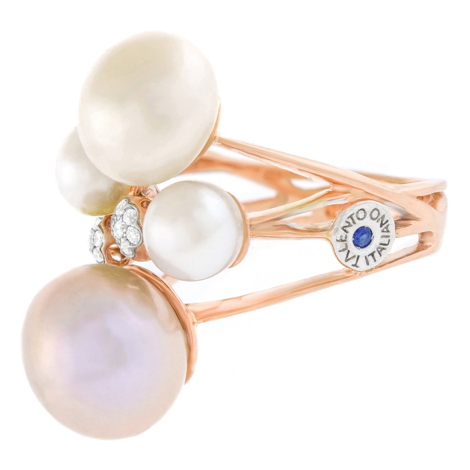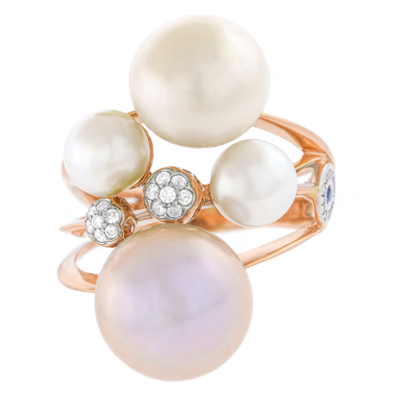 Stones: Natural cultured pearls and .15 carats total weight of H color, VS1 clarity diamonds and .02 carat sapphire