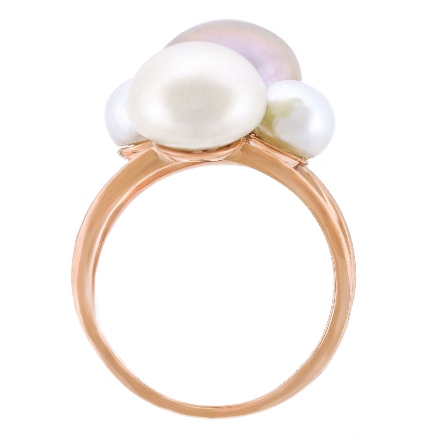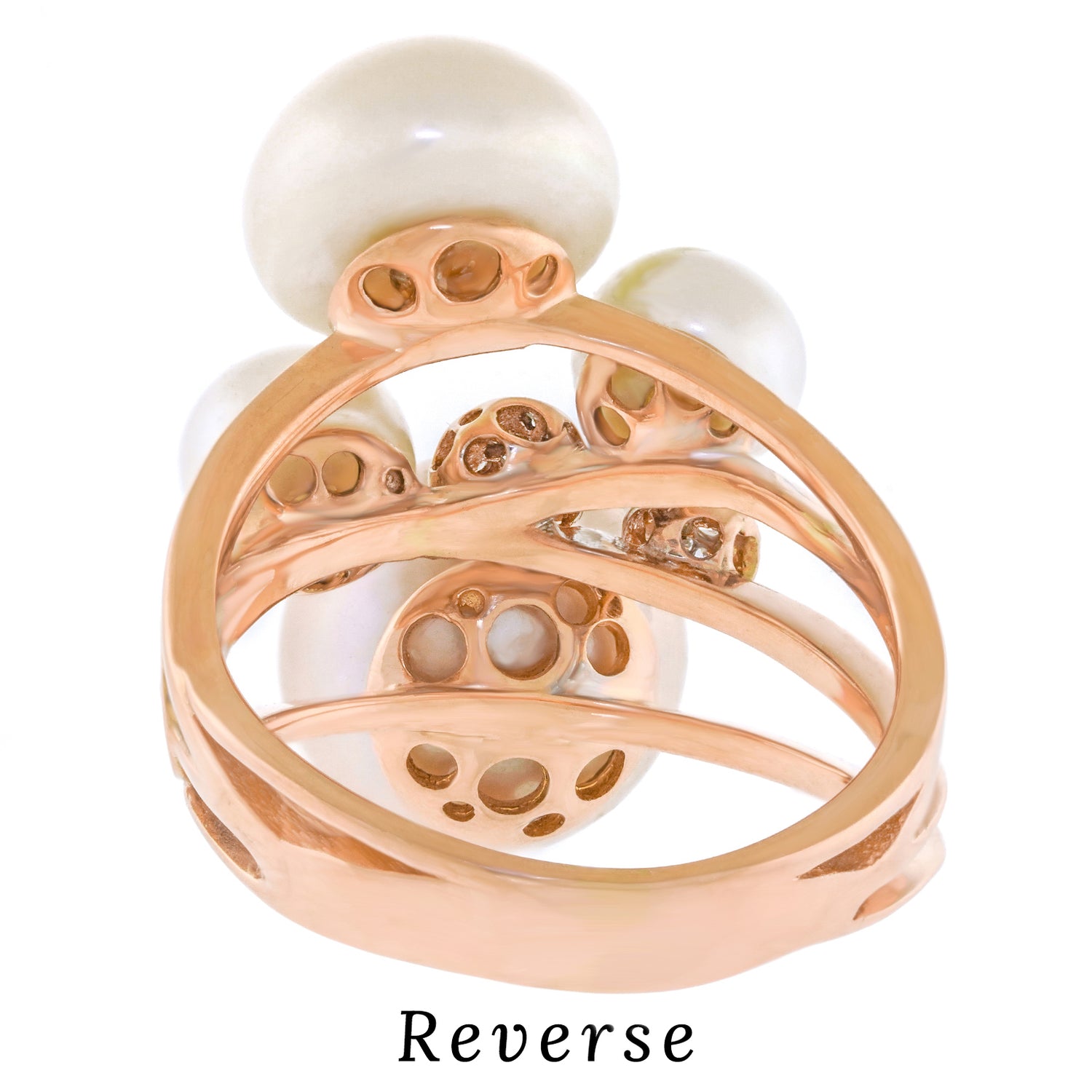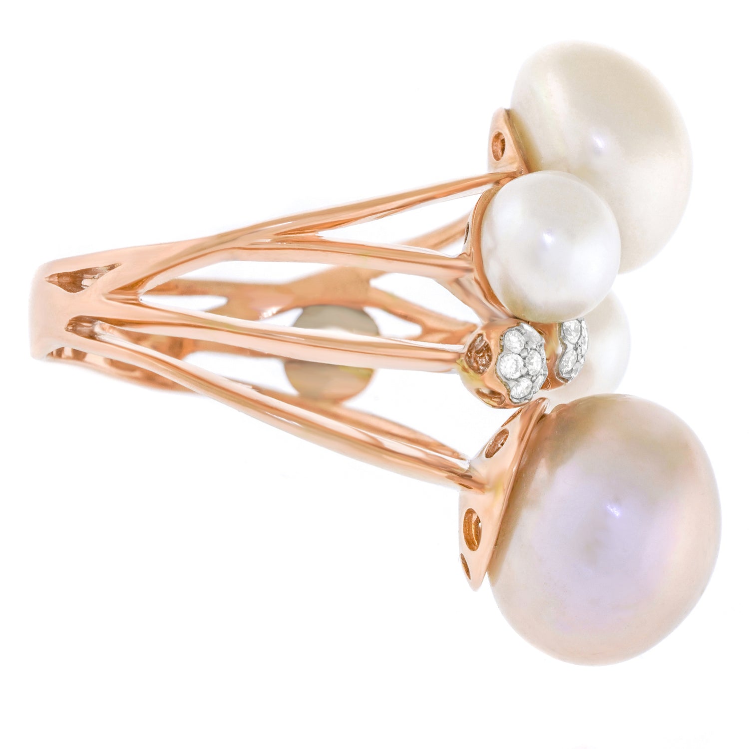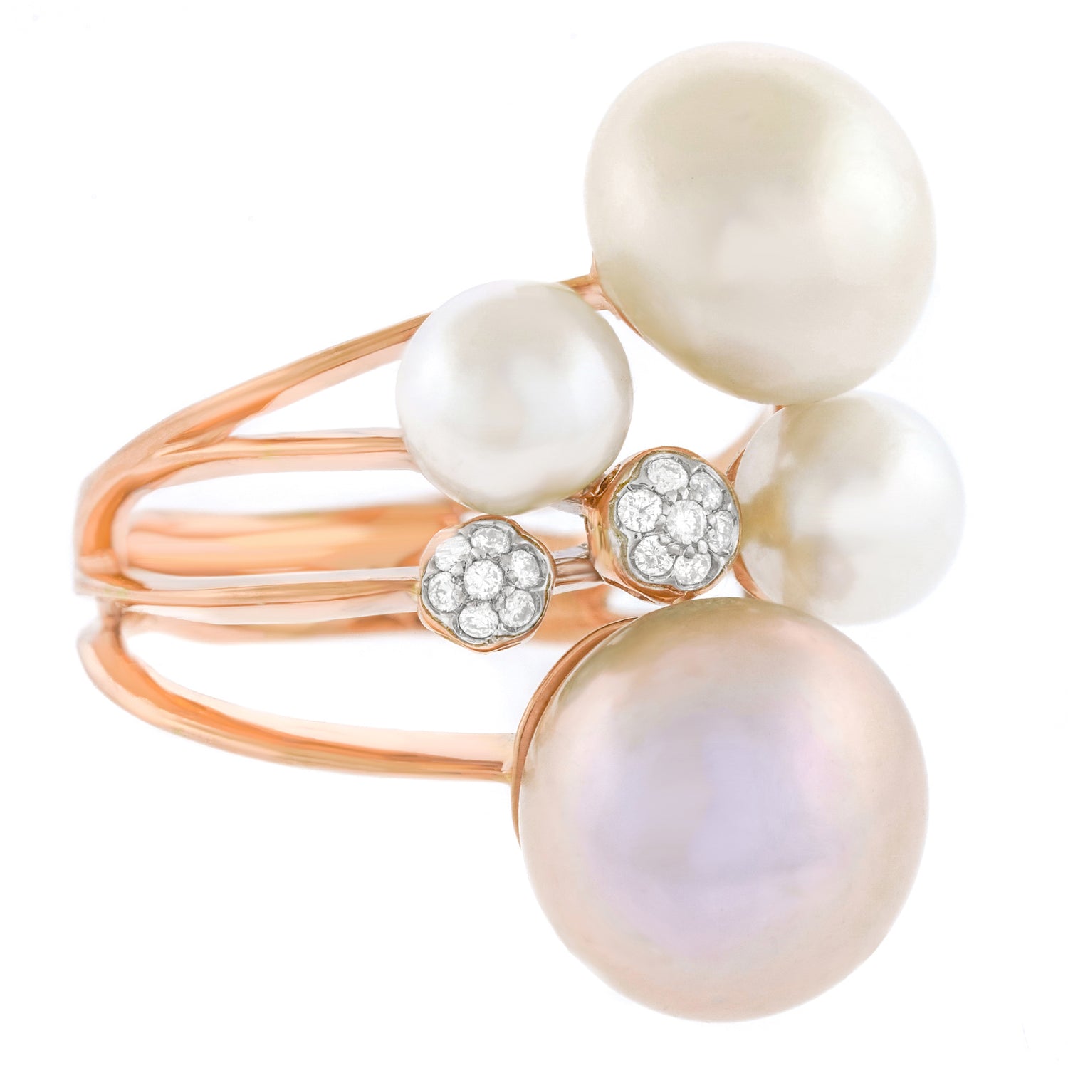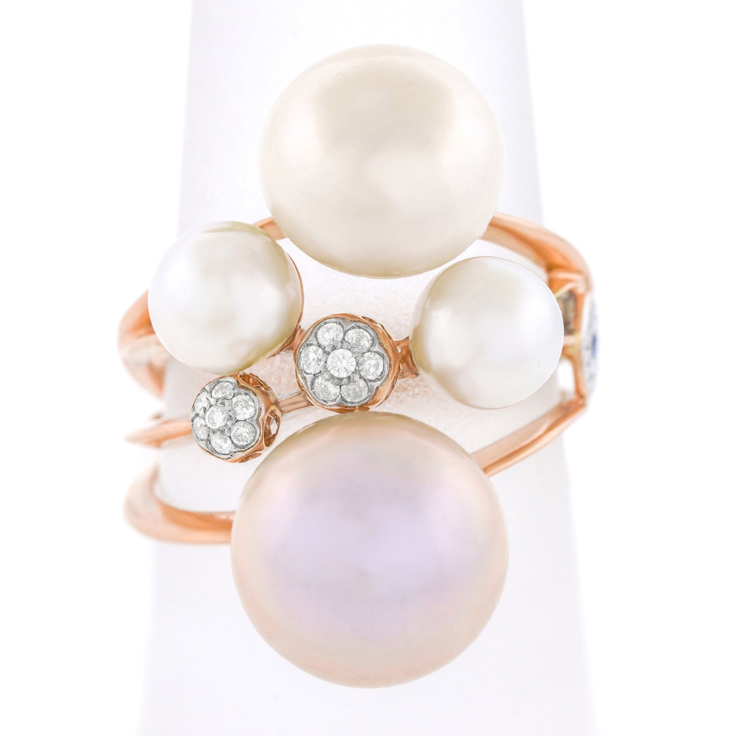 Circa 2000s, 18k, by Talento, Italiano, Italy. Milan design for the new Millennium, this abstractionist ring juxtaposes pearls and diamonds. While the landscape is all rounds, the size, color, texture and dimension vary, beguiling and charming the eye. The look is sculpture to go. Beautifully made, this contemporary ring is in excellent condition.